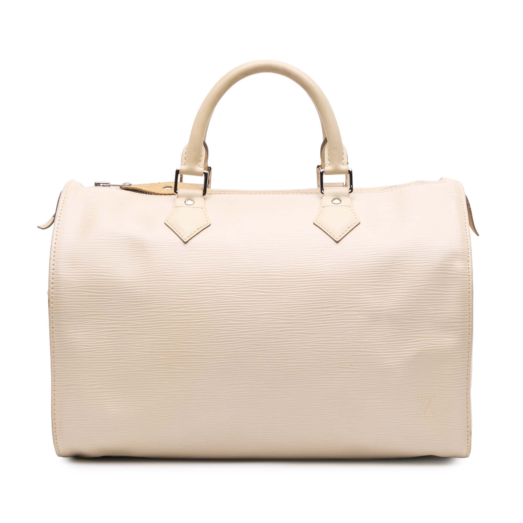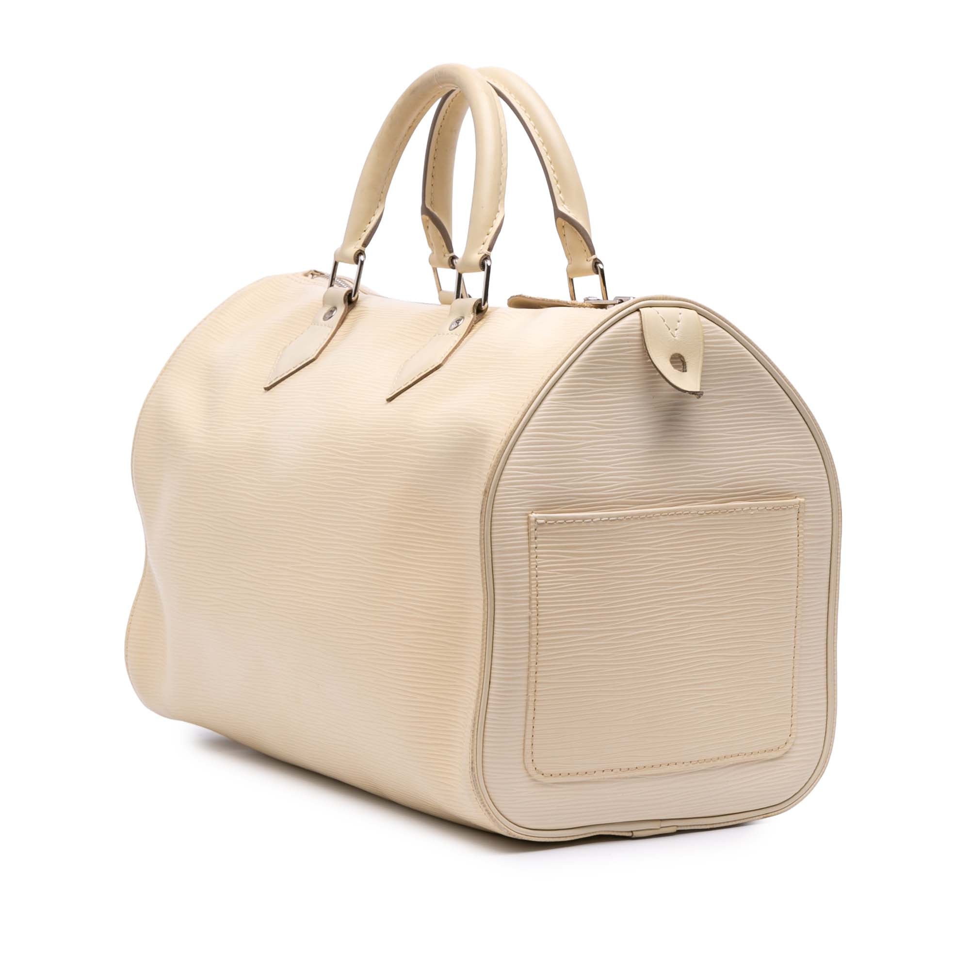 Product Details: White Louis Vuitton Epi Speedy 35 Boston Bag. The Speedy 35 features an epi leather body, rolled handles, a top zip closure, an exterior side slip pocket, and interior slip pockets. 9.1" L x 13.8" W x 6.7" D, 4.7" drop. Serial number SP2111.