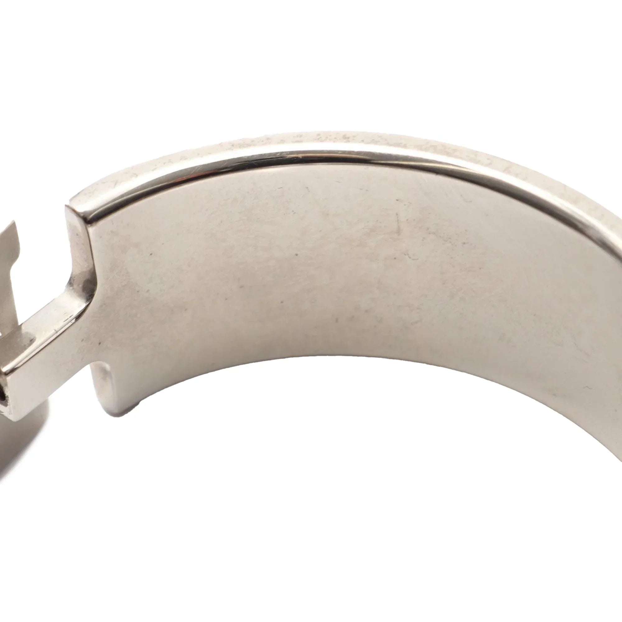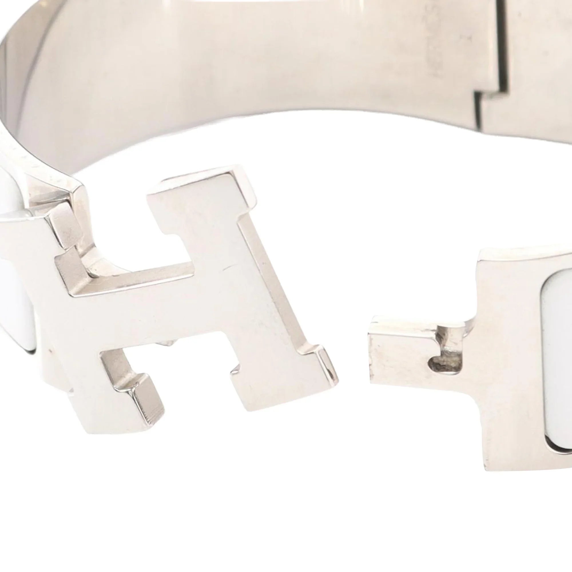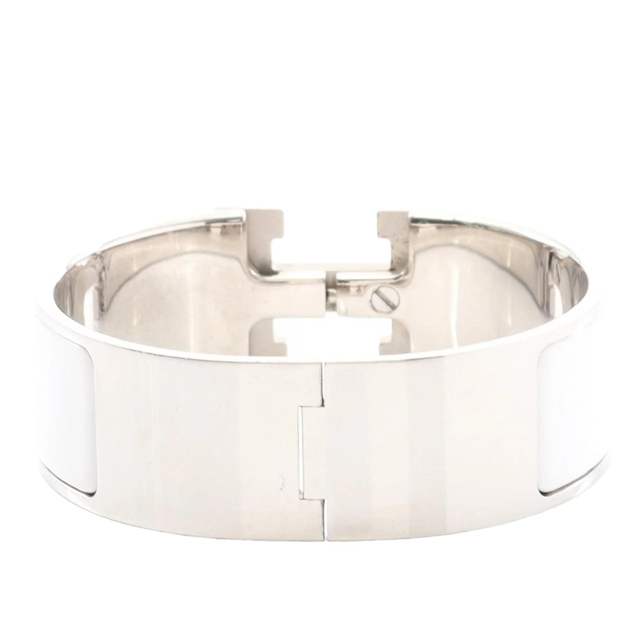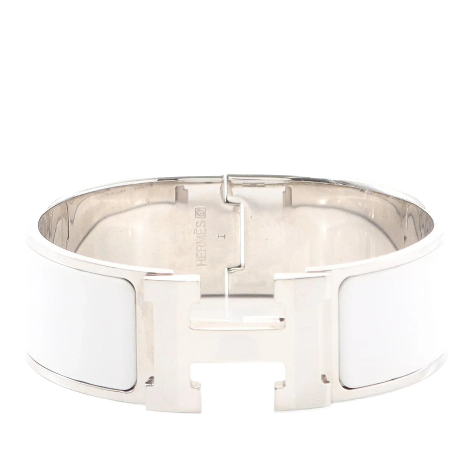 Product Details: White Hermès Wide Enamel Clic Clac H Bracelet PM. The Clic Clac H Bracelet features an enamel and palladium-plated metal body and a metal clasp closure. 6.3" L x 1.1" W x 0" D.