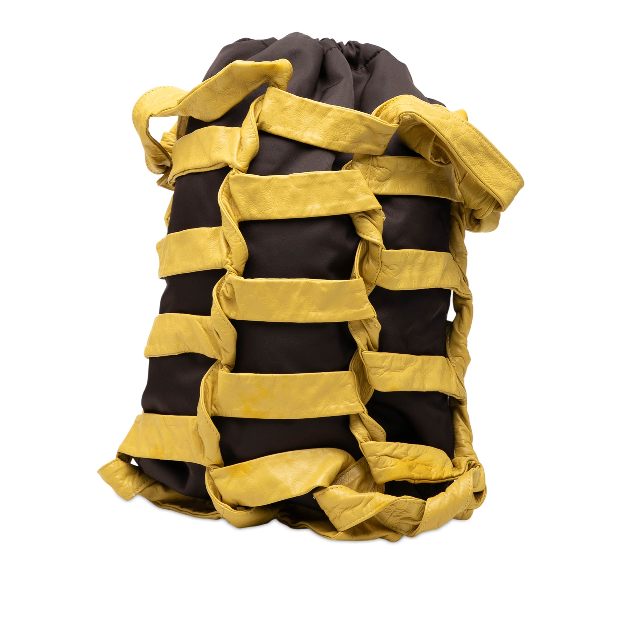 Product Details: Black Bottega Veneta Nylon BV Tape Bucket Bag. The BV Tape features a nylon body with leather trim, a flat leather strap, and an open top with drawstring closure. 15.7" L x 8.7" W x 3.9" D.