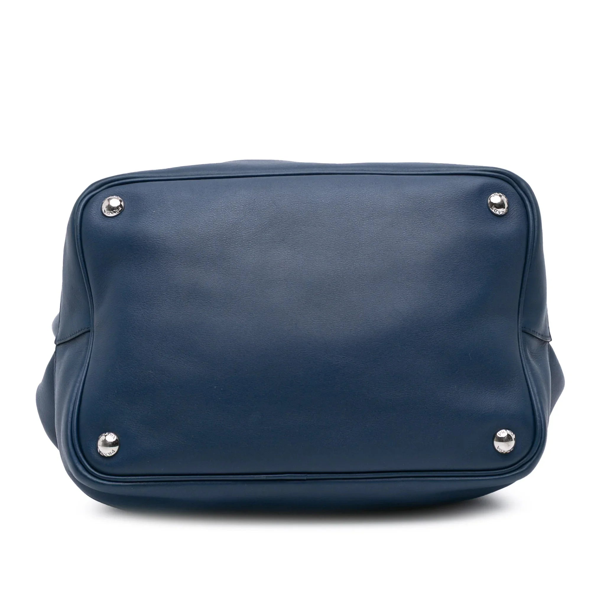 Product Details: Blue Prada Soft Calf Tassel Convertible Drawstring Bucket Bag Satchel. This satchel features a leather body, a flat leather handle, a top drawstring closure with tassel details, and interior zip and slip pockets. 11" L x 10.4" W x 7.1" D, 6.3" drop.