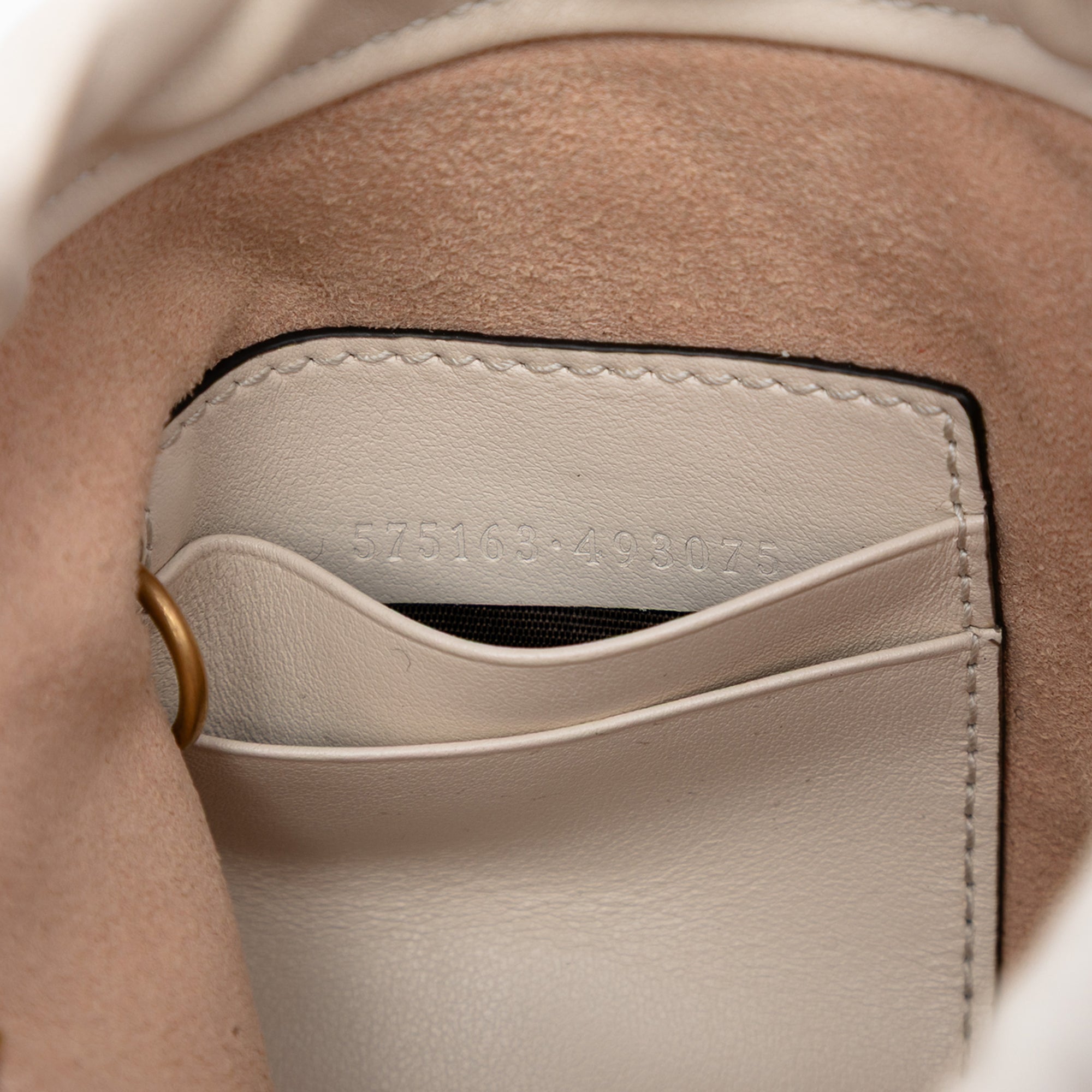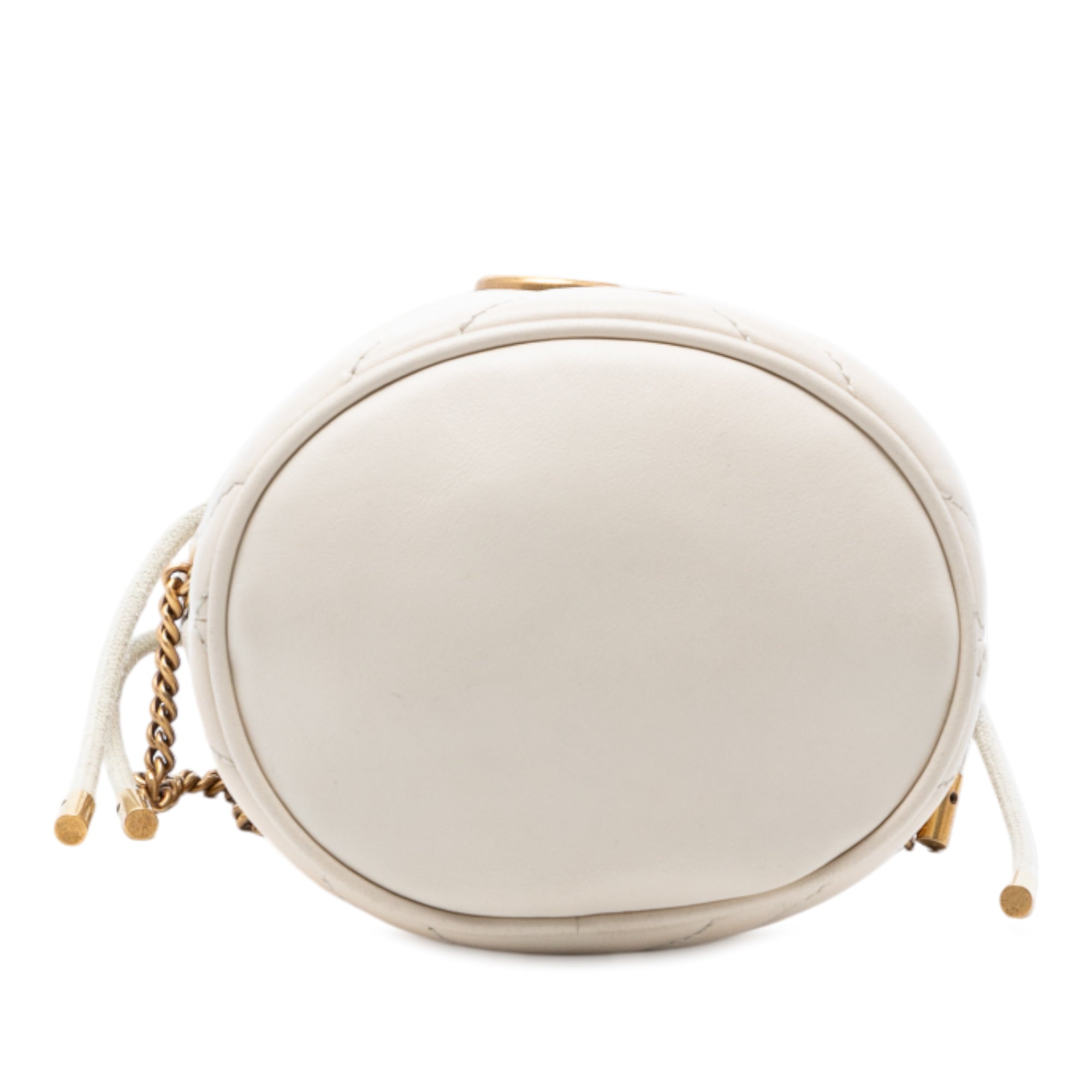 Product Details: White Gucci Small GG Marmont Leather Matelasse Bucket Bag. This bucket bag features a quilted leather body, a chain strap, an open top with drawstring closure, and an interior slip pocket. 7.1" L x 5.1" W x 4.3" D. Serial number 575163·493075.