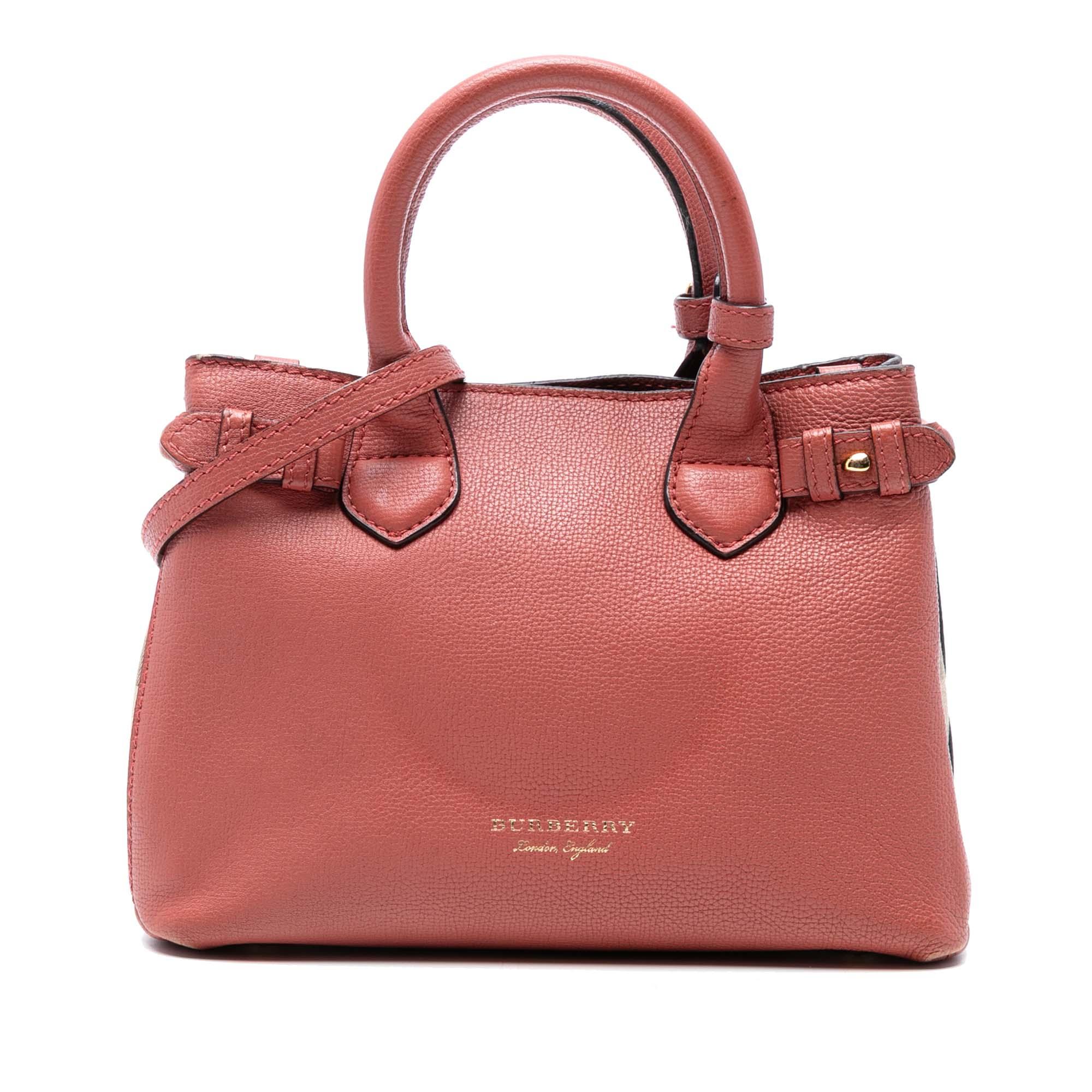 Product Details: Pink Burberry Small Grainy Calfskin and House Check Banner Satchel. The Banner satchel features a leather body, rolled leather handles, an adjustable and detachable flat leather strap, an open top with magnetic snap closure, an interior zip compartment, and interior zip and slip pockets. 7.7" L x 10.6" W x 4.3" D. Serial number ITCF&10SCA.