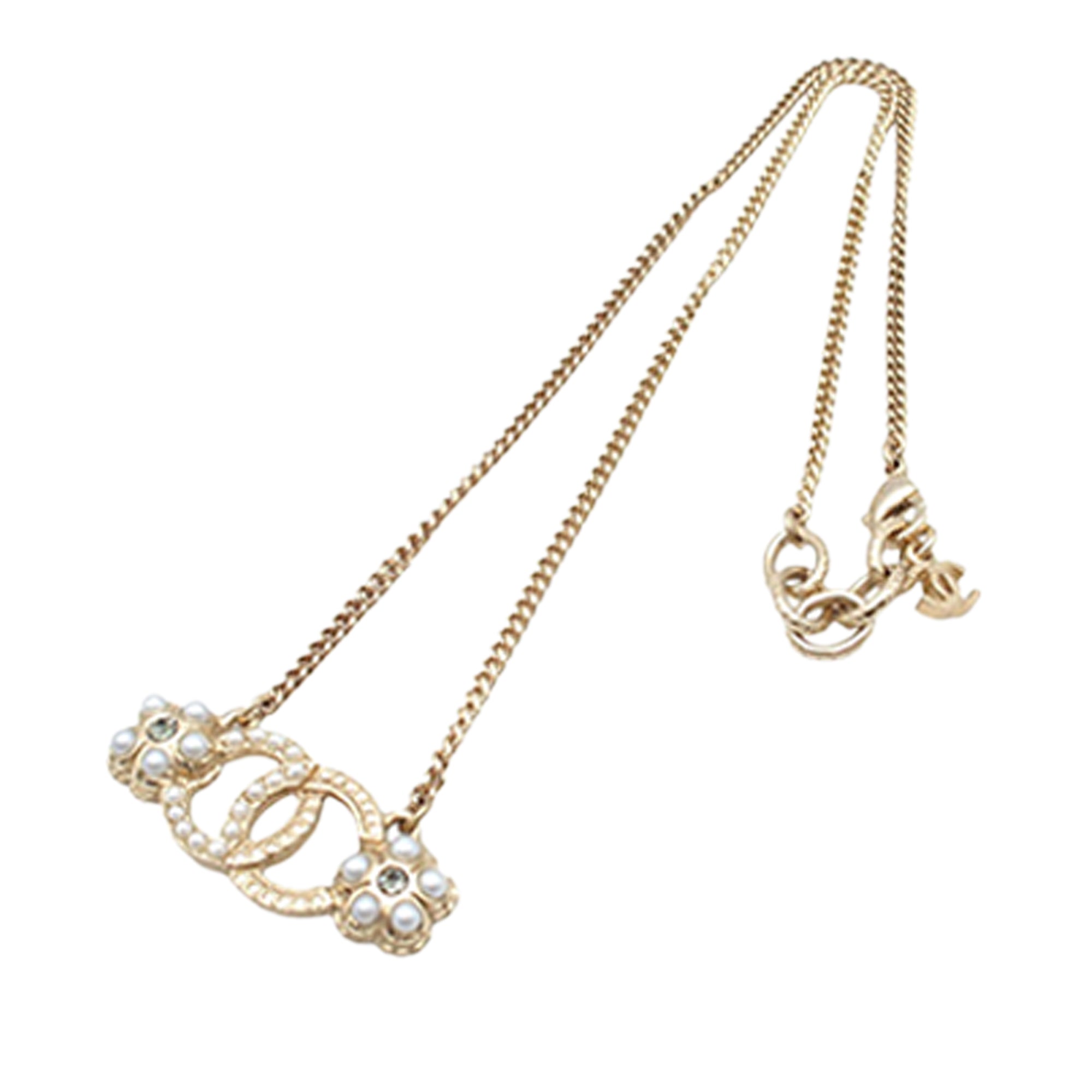 Product Details: Gold Chanel CC Gold Plated Faux Pearl and Rhinestone Flower Necklace. This necklace features a gold-plated body, faux pearl and rhinestones embellishments, and a lobster clasp closure. Motif size: 1.4 cm x 3.5 cm. 16.9" L x 1.4" W x 0" D. Serial number A18K.