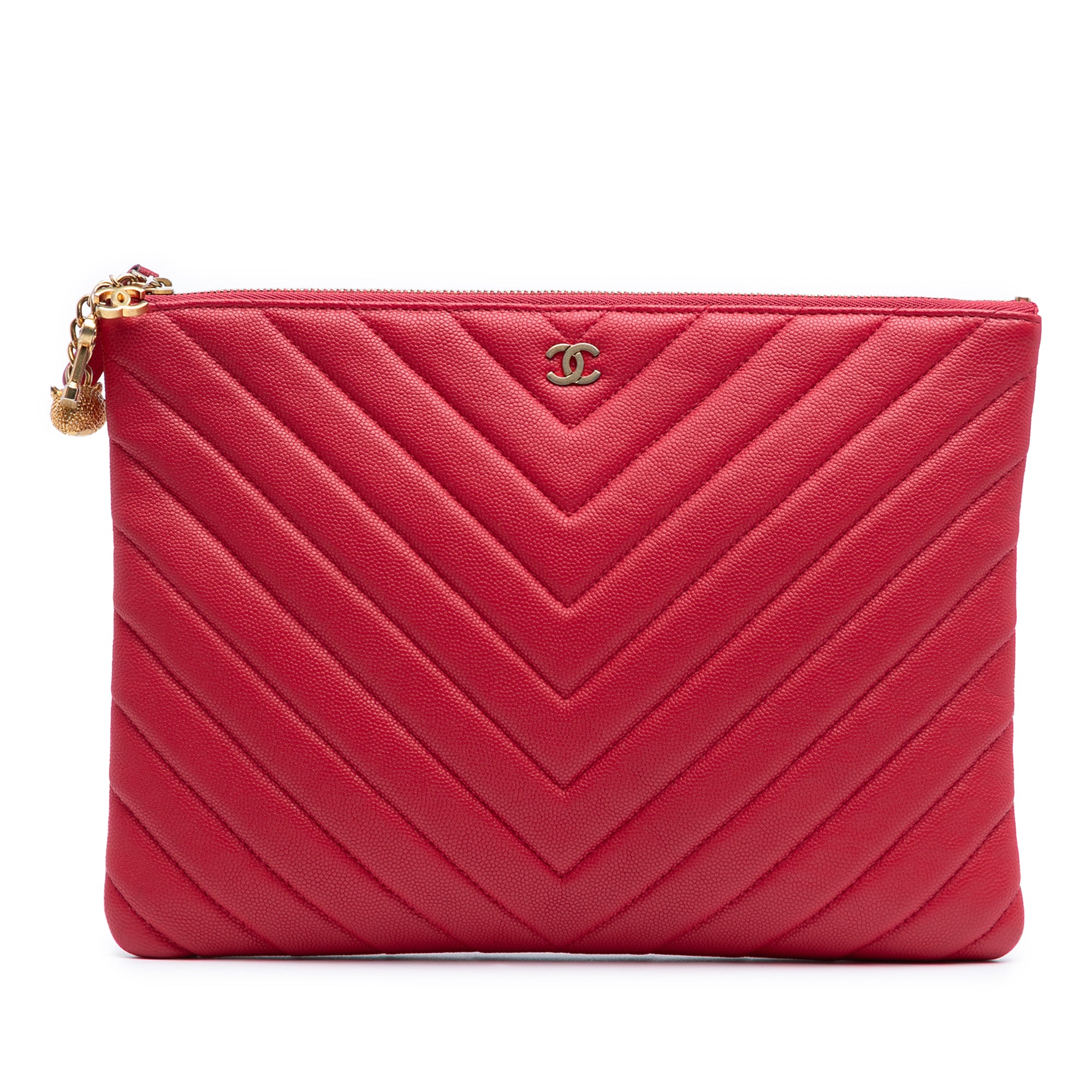 Product Details: Red Chanel Medium Chevron Caviar Ancient Greek Charms O Case Clutch. This clutch bag features a chevron leather body, top zip closure, an exterior back slip pocket, and an interior zip pocket. 7.7" L x 10.4" W x 0.2" D. Serial number 24898778.