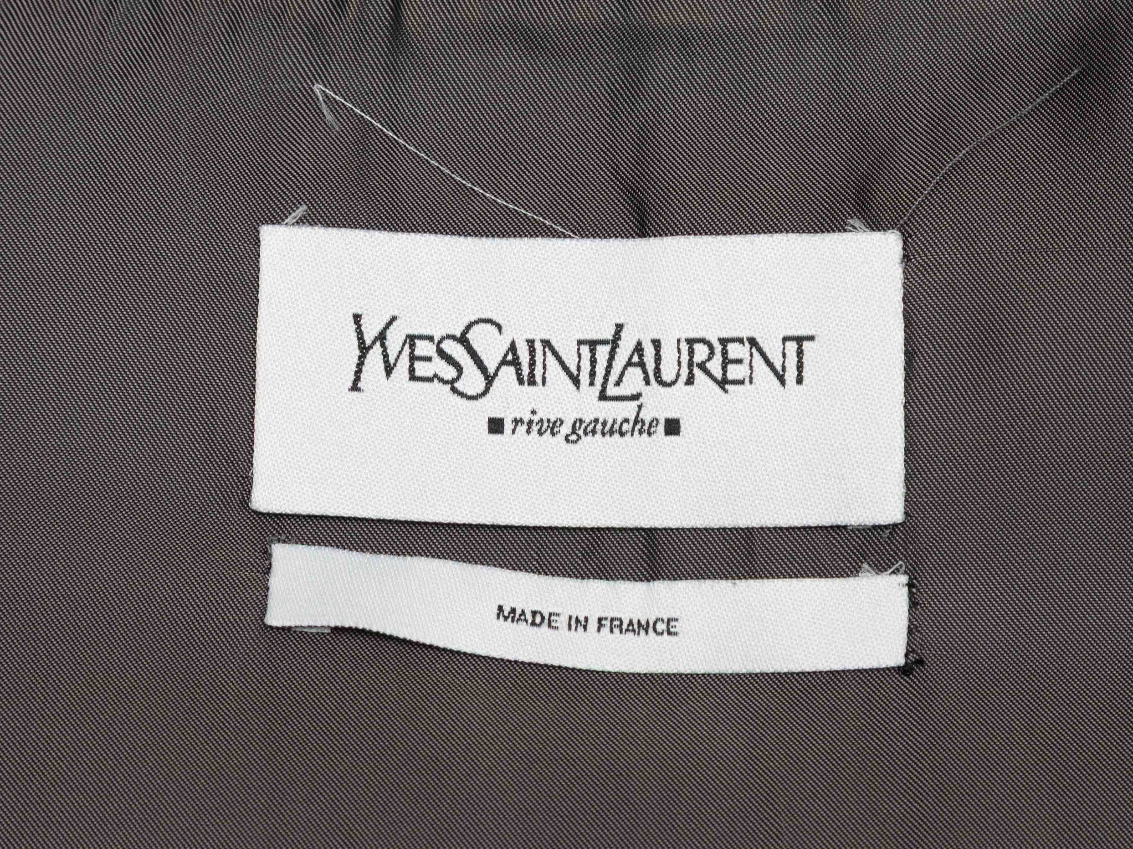 Product Details: Charcoal cotton blazer by Yves Saint Laurent. Notched lapel. Three pockets. Front button closures. 32" bust, 14.5" shoulder width, 25" sleeve length, 24" length.
