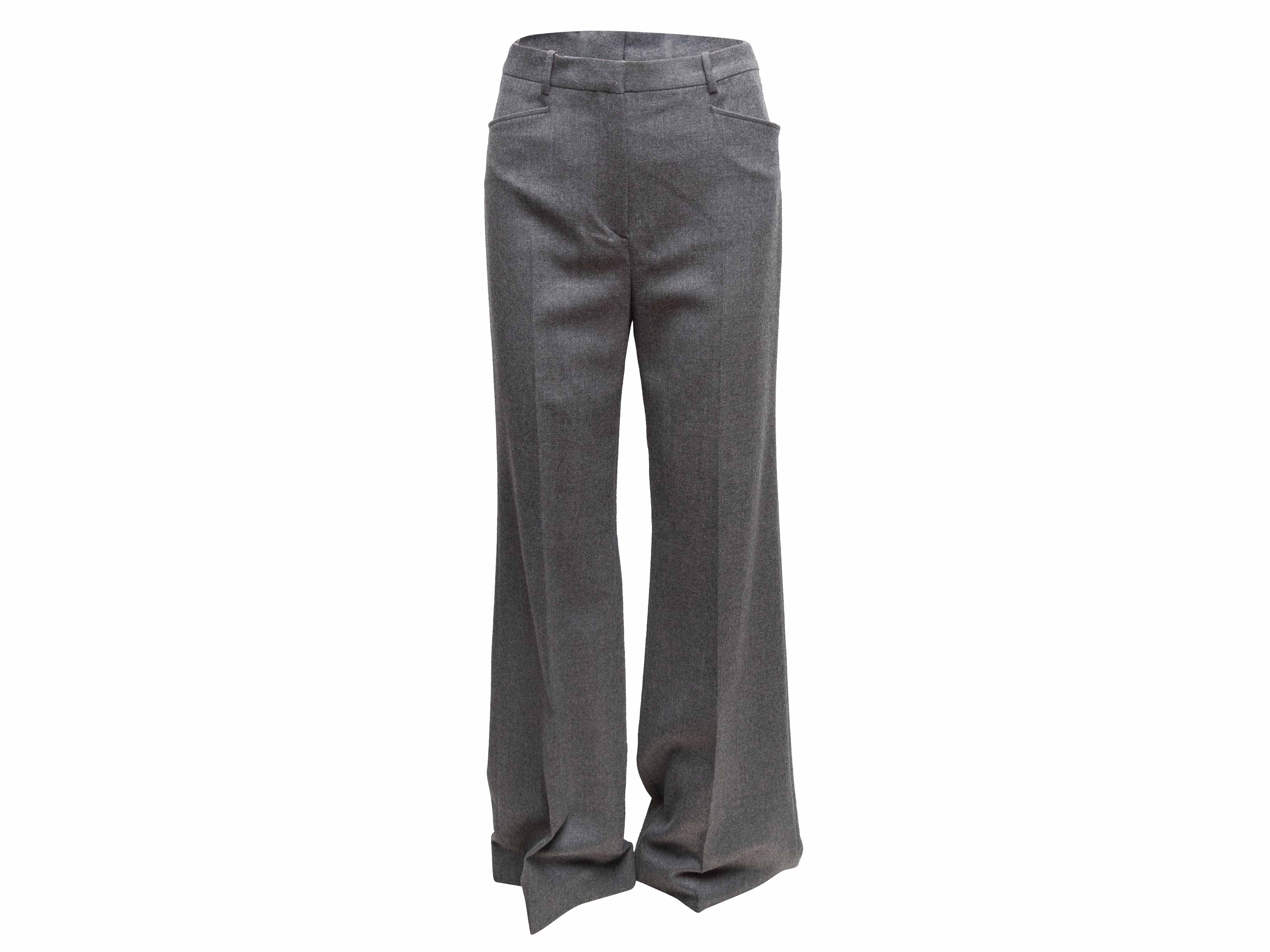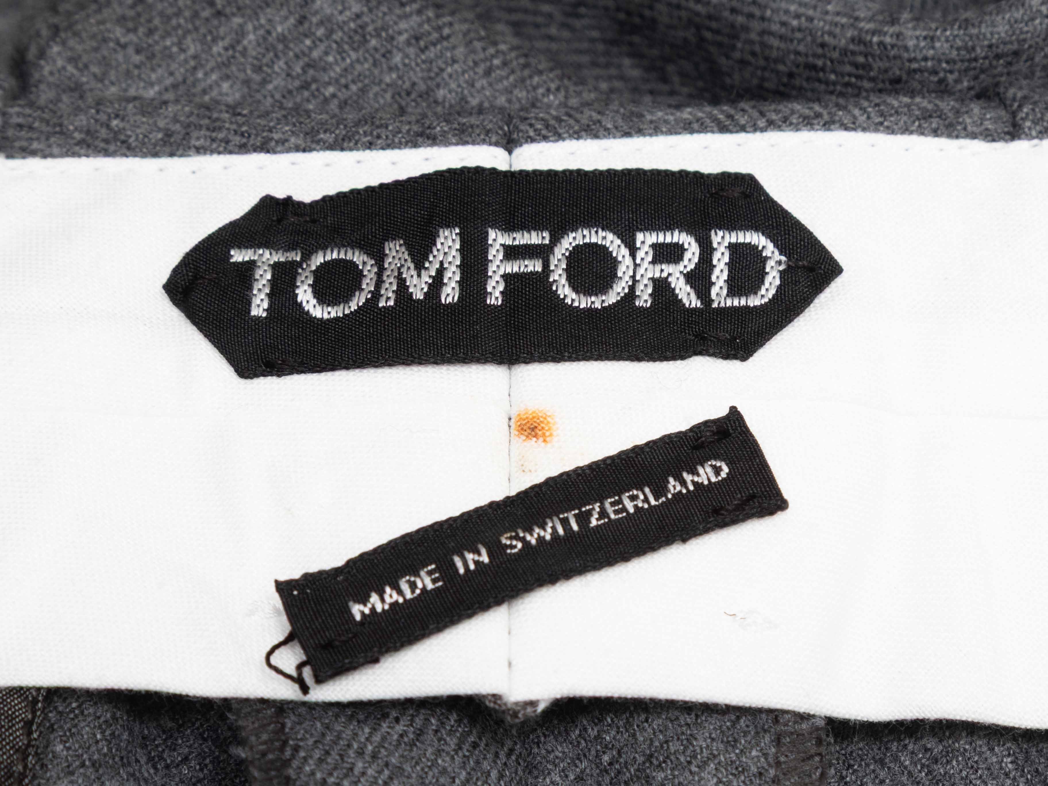 Product Details: Grey wide-leg pleated wool trousers by Tom Ford. Four pockets. Front concealed closures. 30" waist, 36" hips, 32.5" inseam, 44" length.