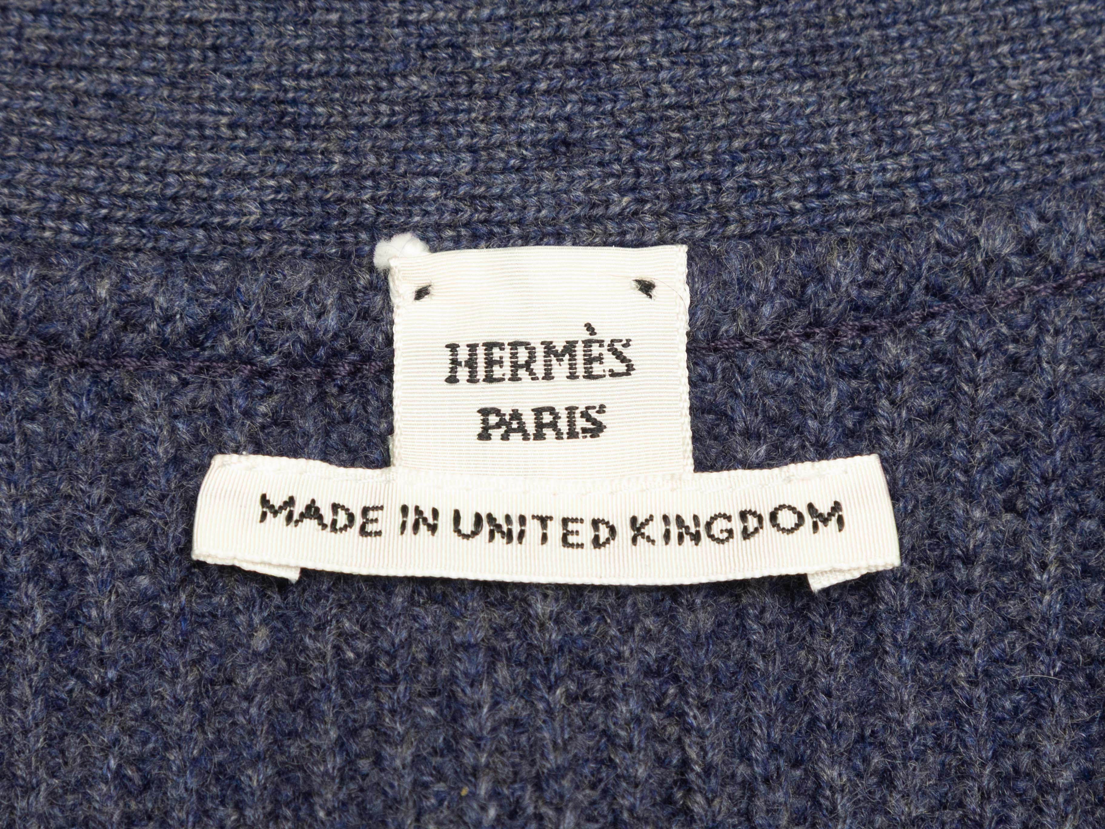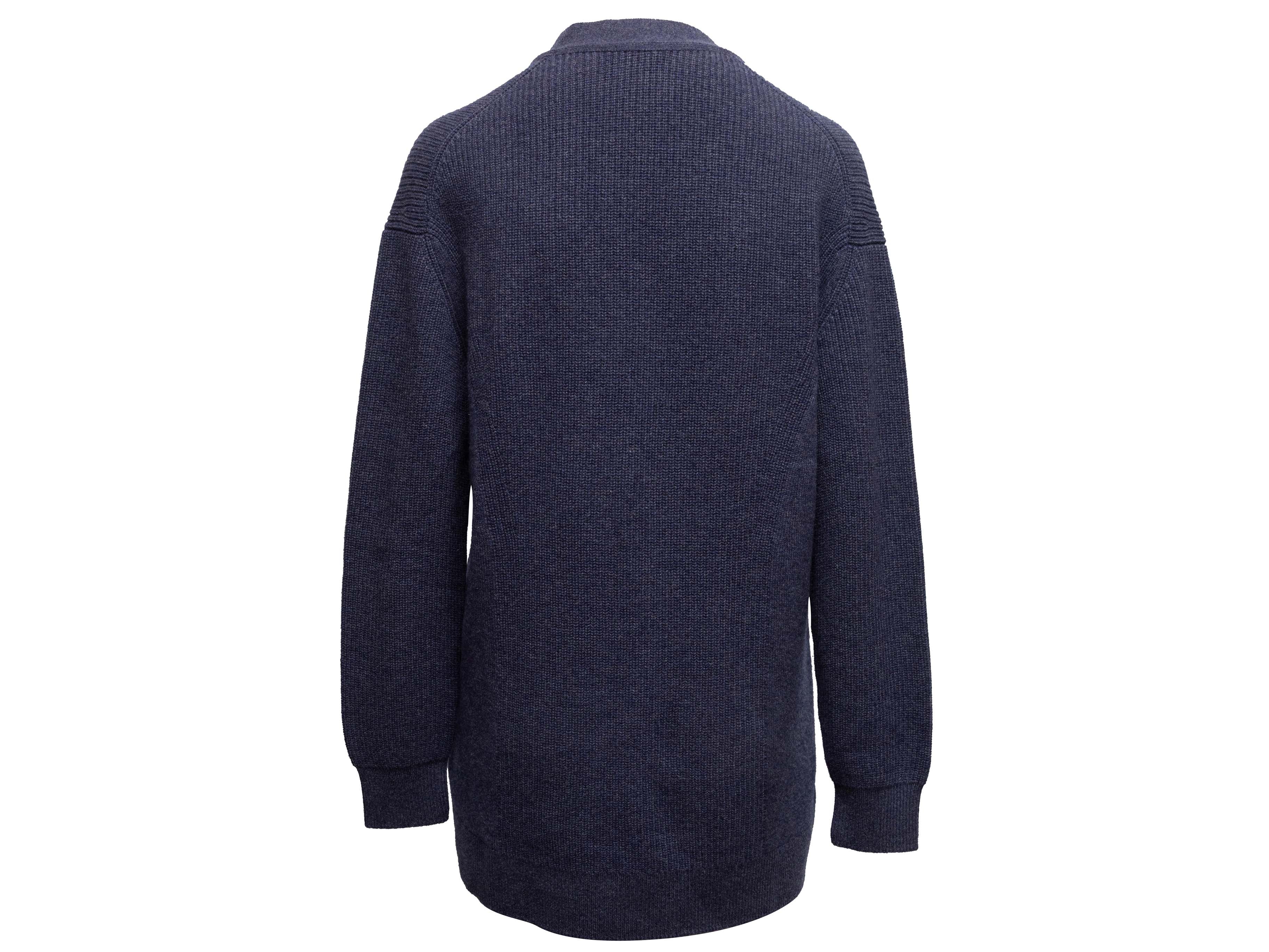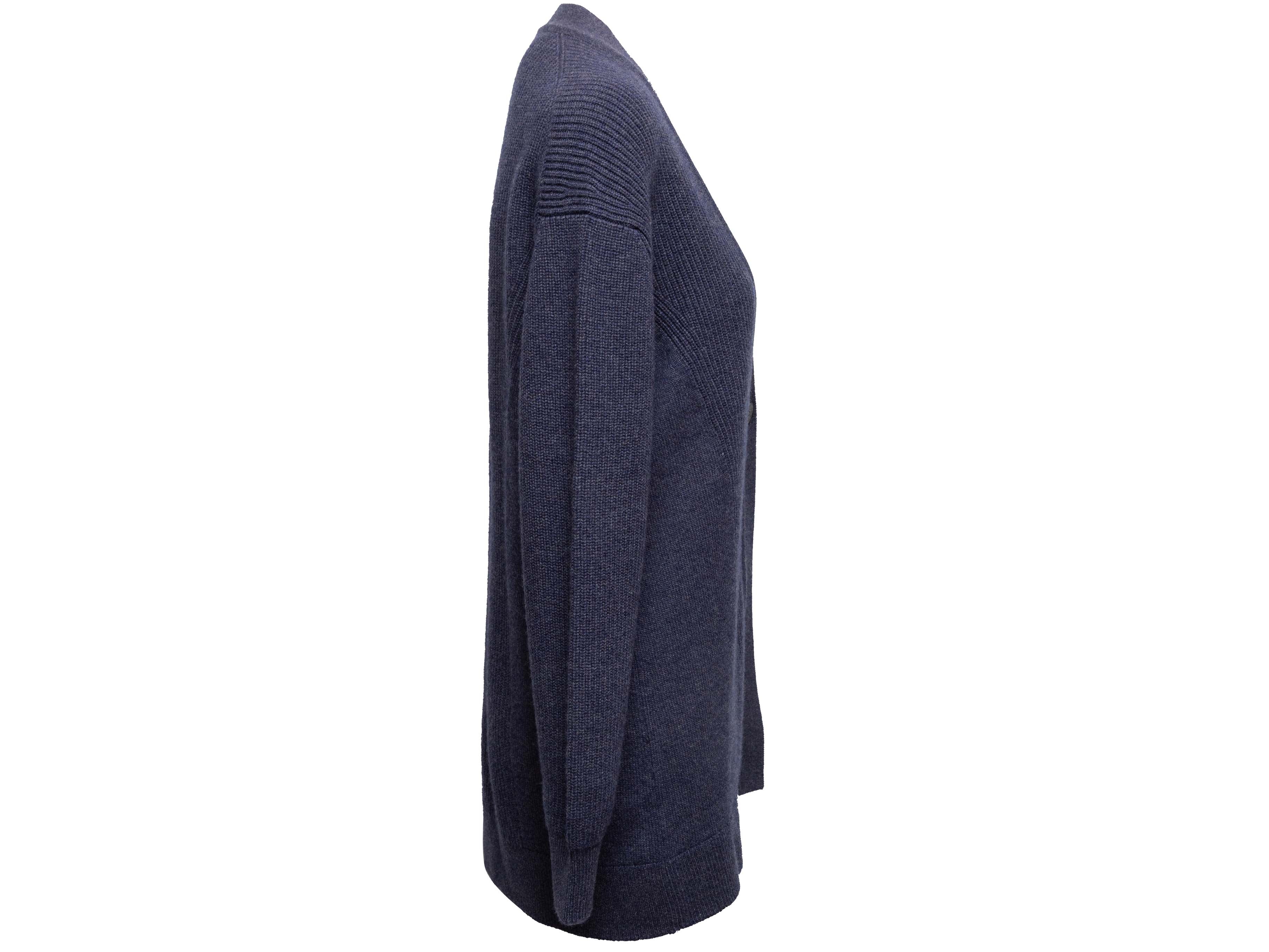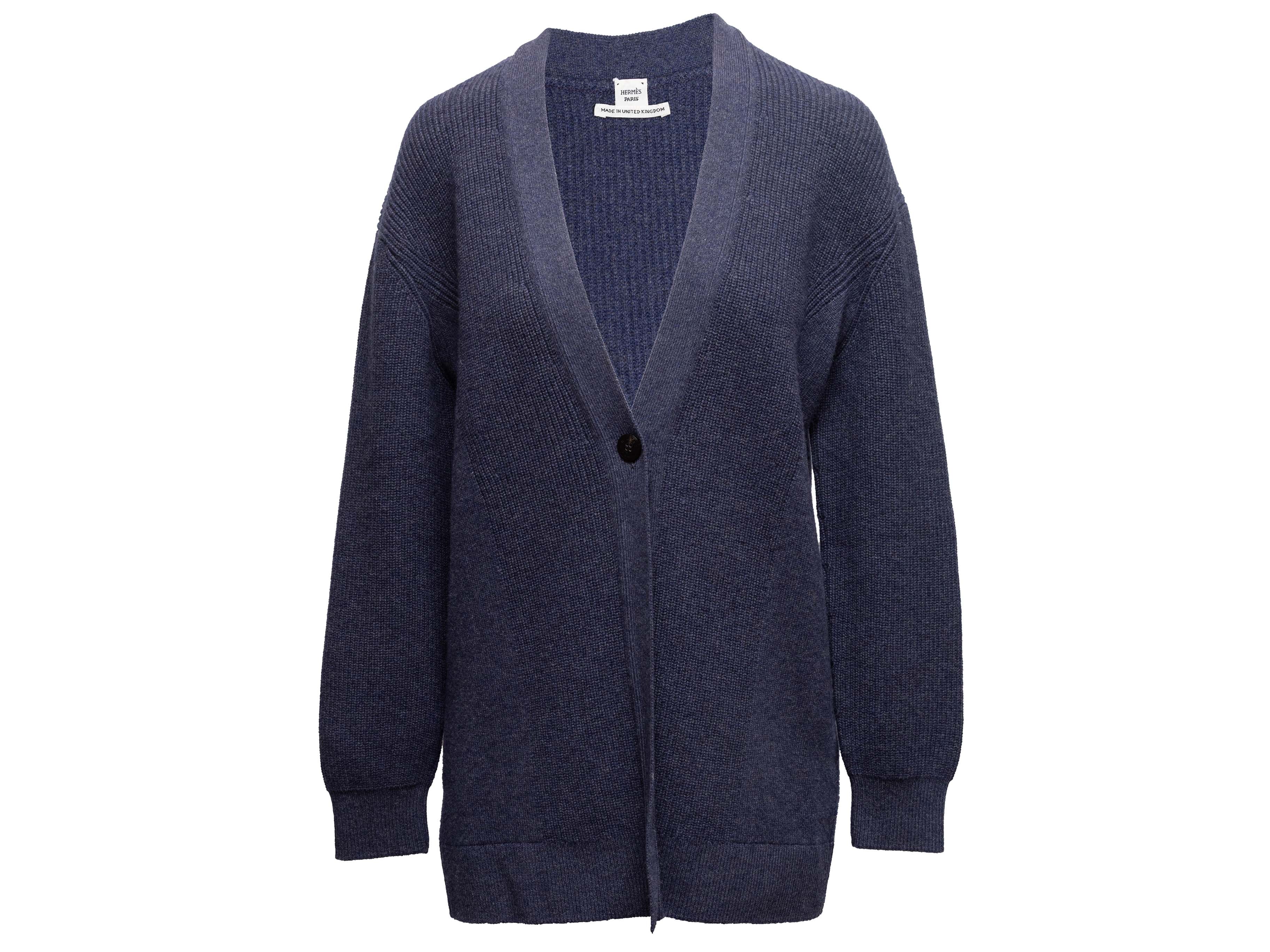 Product Details: Navy cashmere longline cardigan by Hermes. V-neck. Single front button closure. 42" bust, 17" shoulder width, 31.5" length.