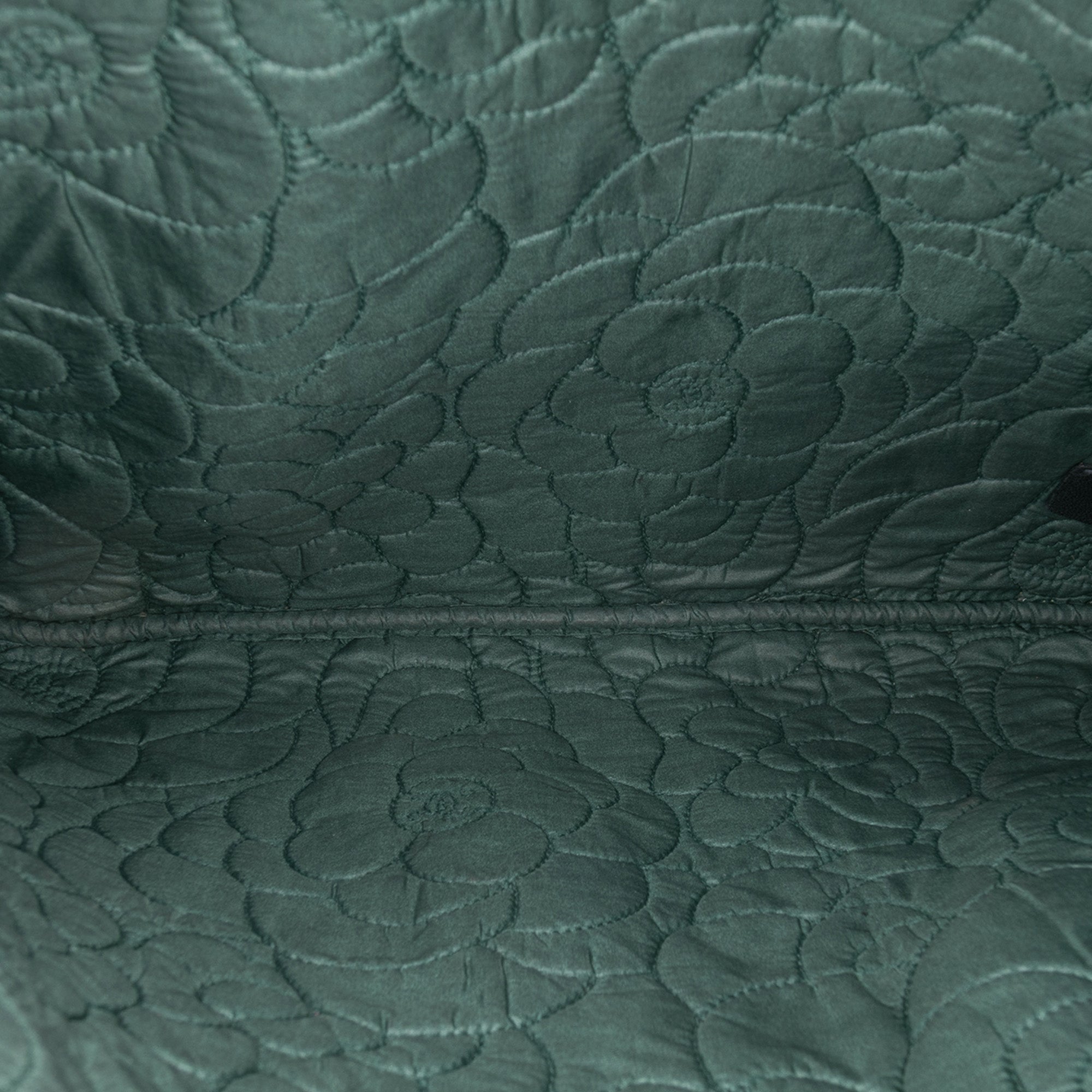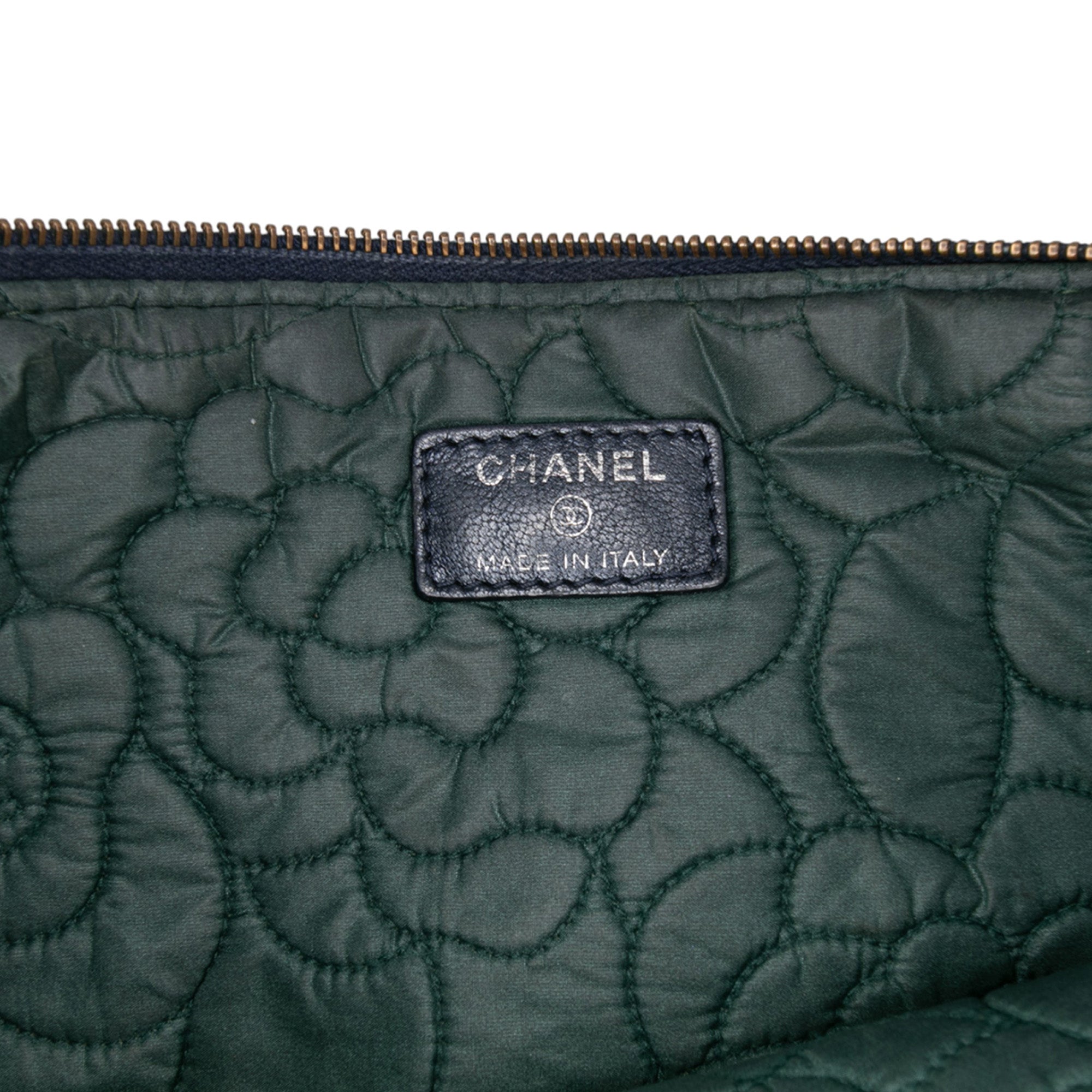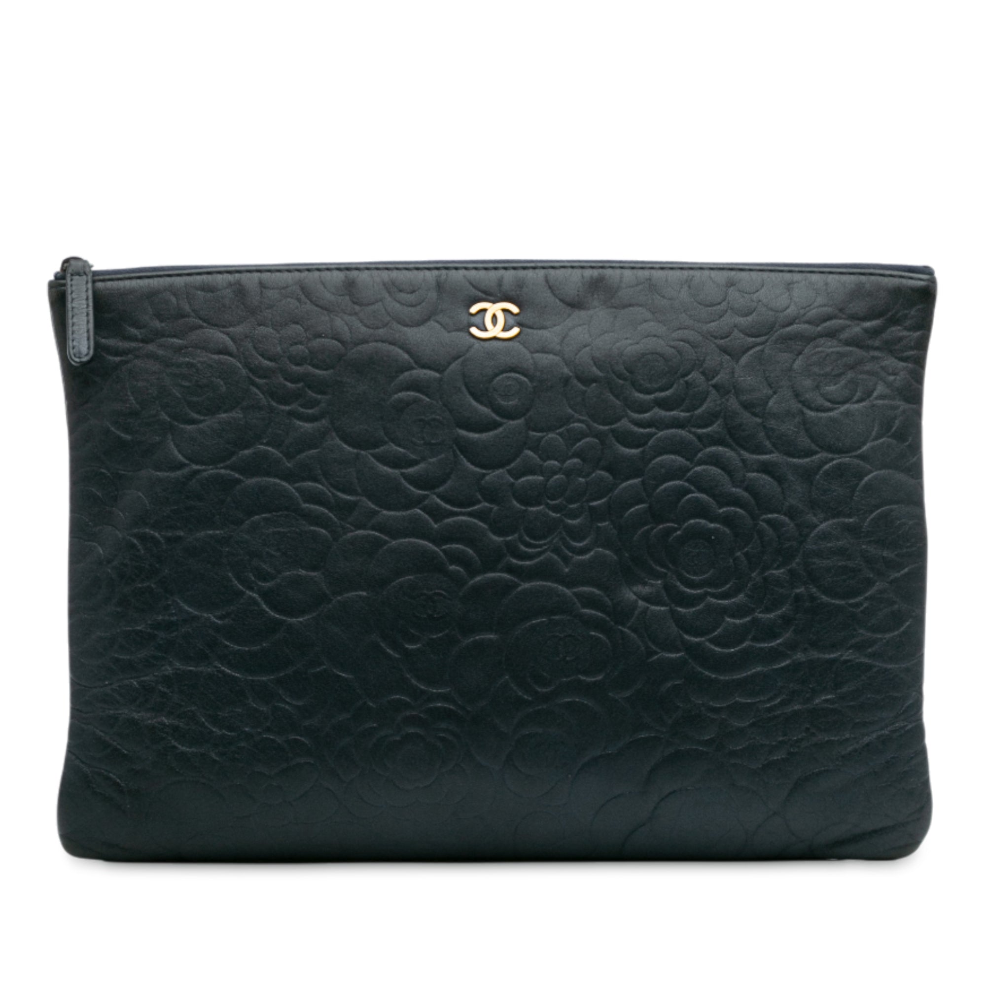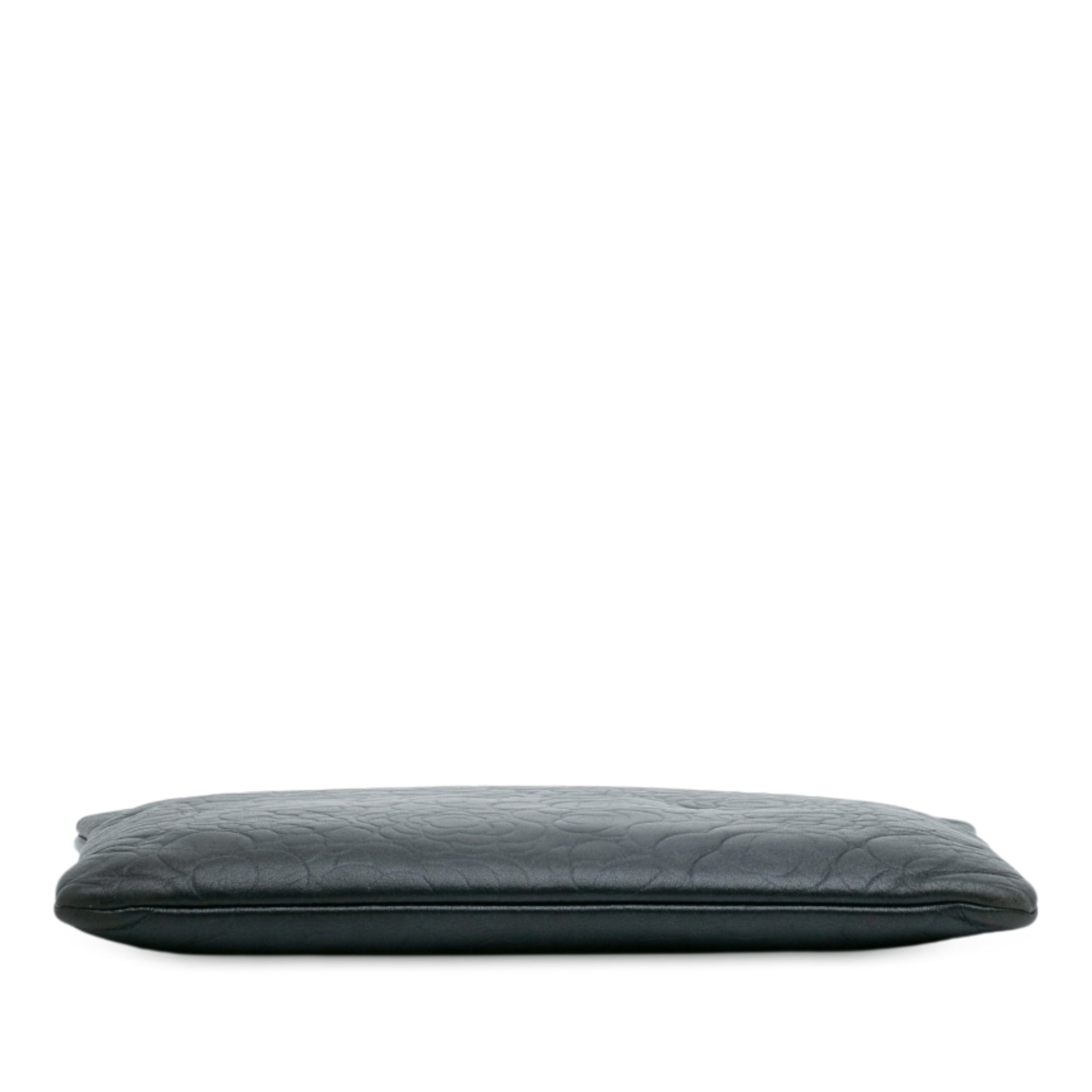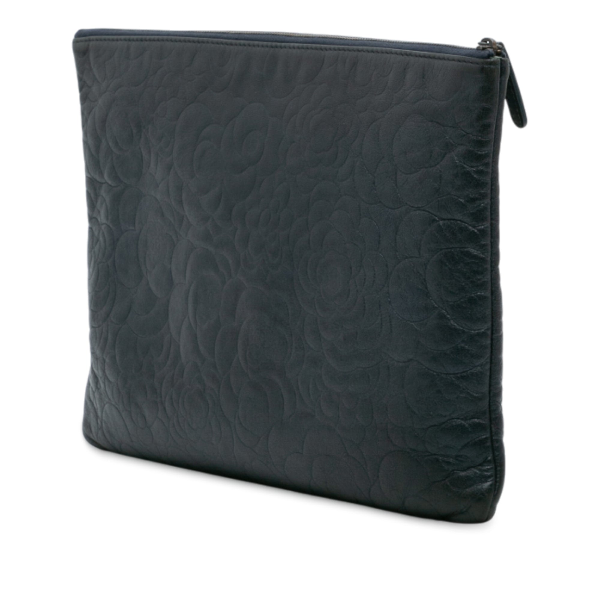Product Details: Blue Chanel Large CC Embossed Lambskin Camellia O Case Clutch. This clutch bag features an embossed lambskin leather body and a top zip closure. 9.4" L x 12.8" W x 0.2" D. Serial number 18078816.