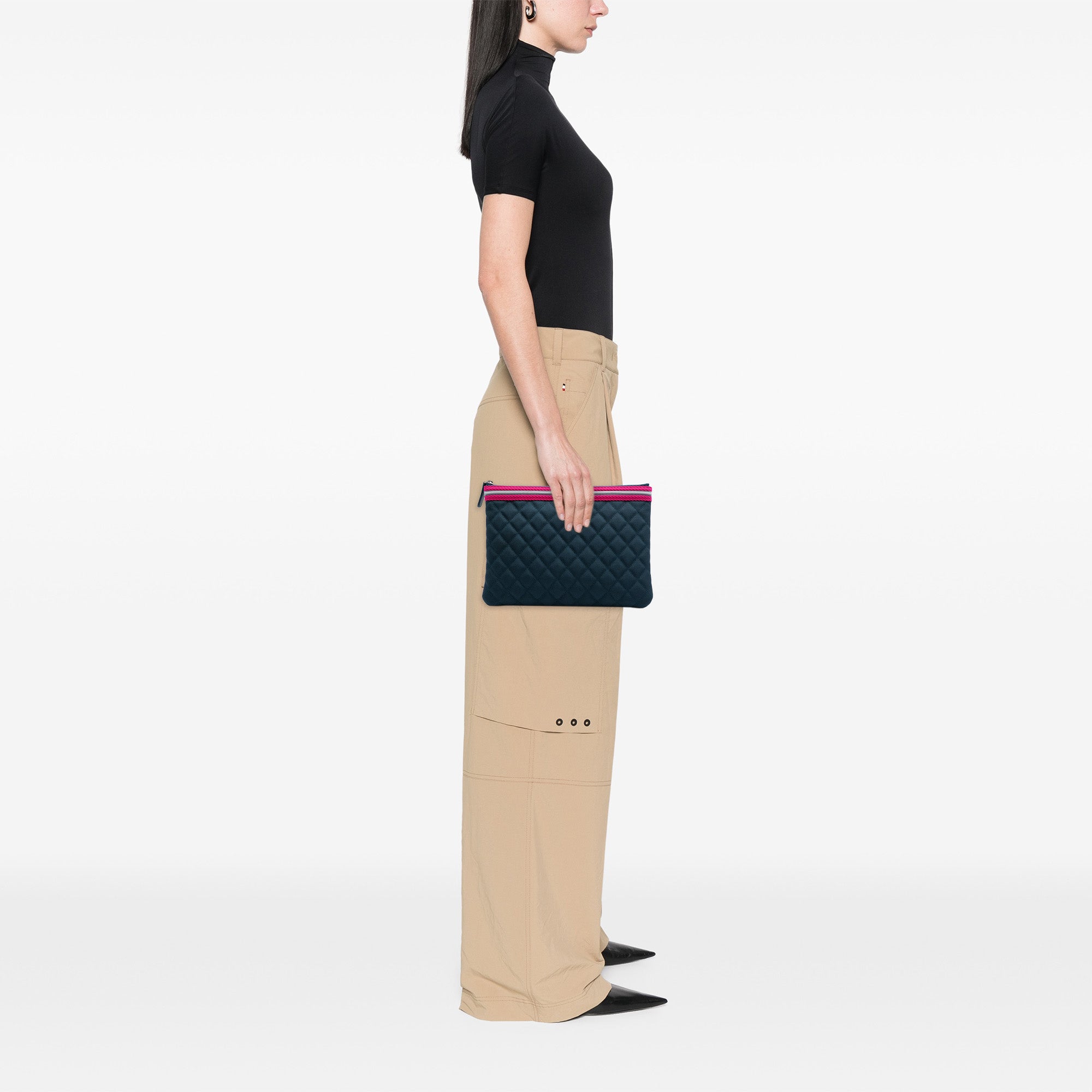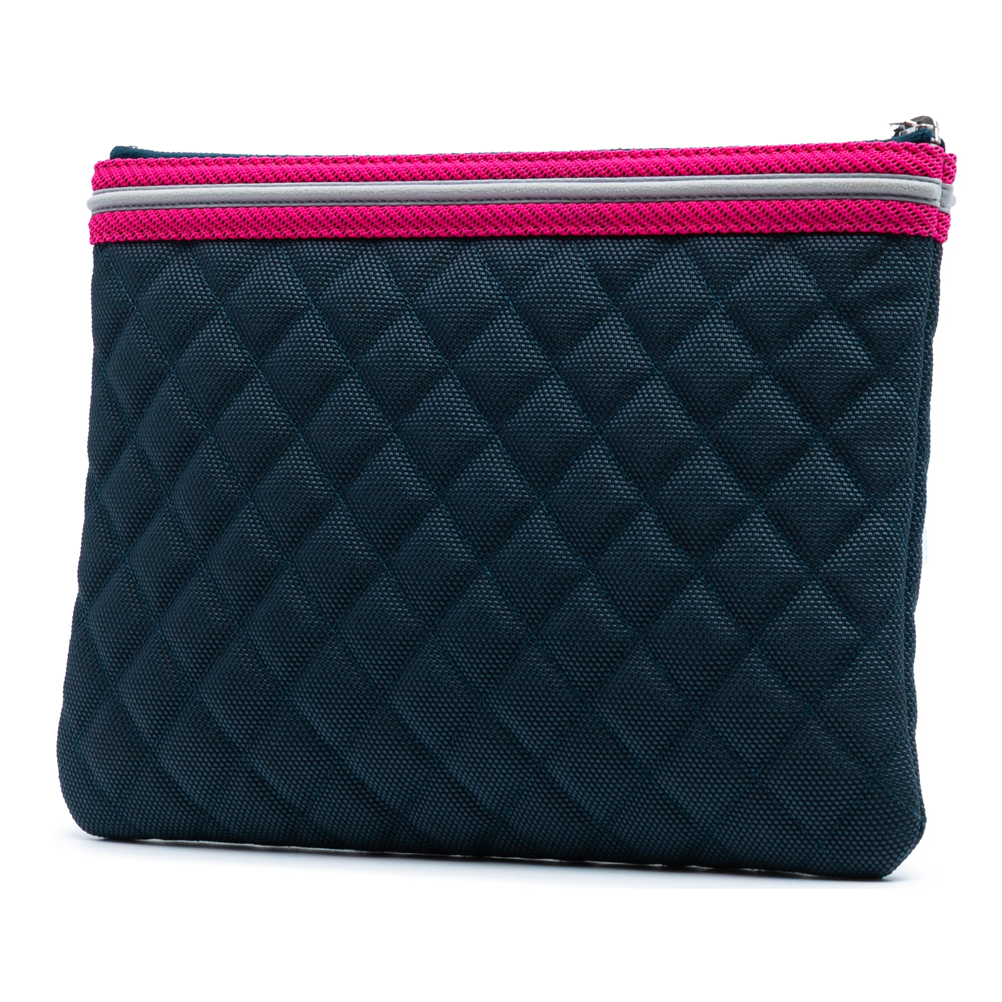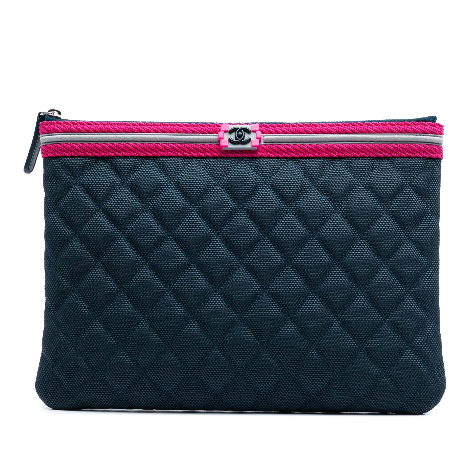 Product Details: Blue Chanel Medium Quilted Nylon Fluo Boy O Case Clutch. This clutch bag features a quilted nylon body and a top zip closure. 7.9" L x 10.6" W x 0.2" D. Serial number 22560843.