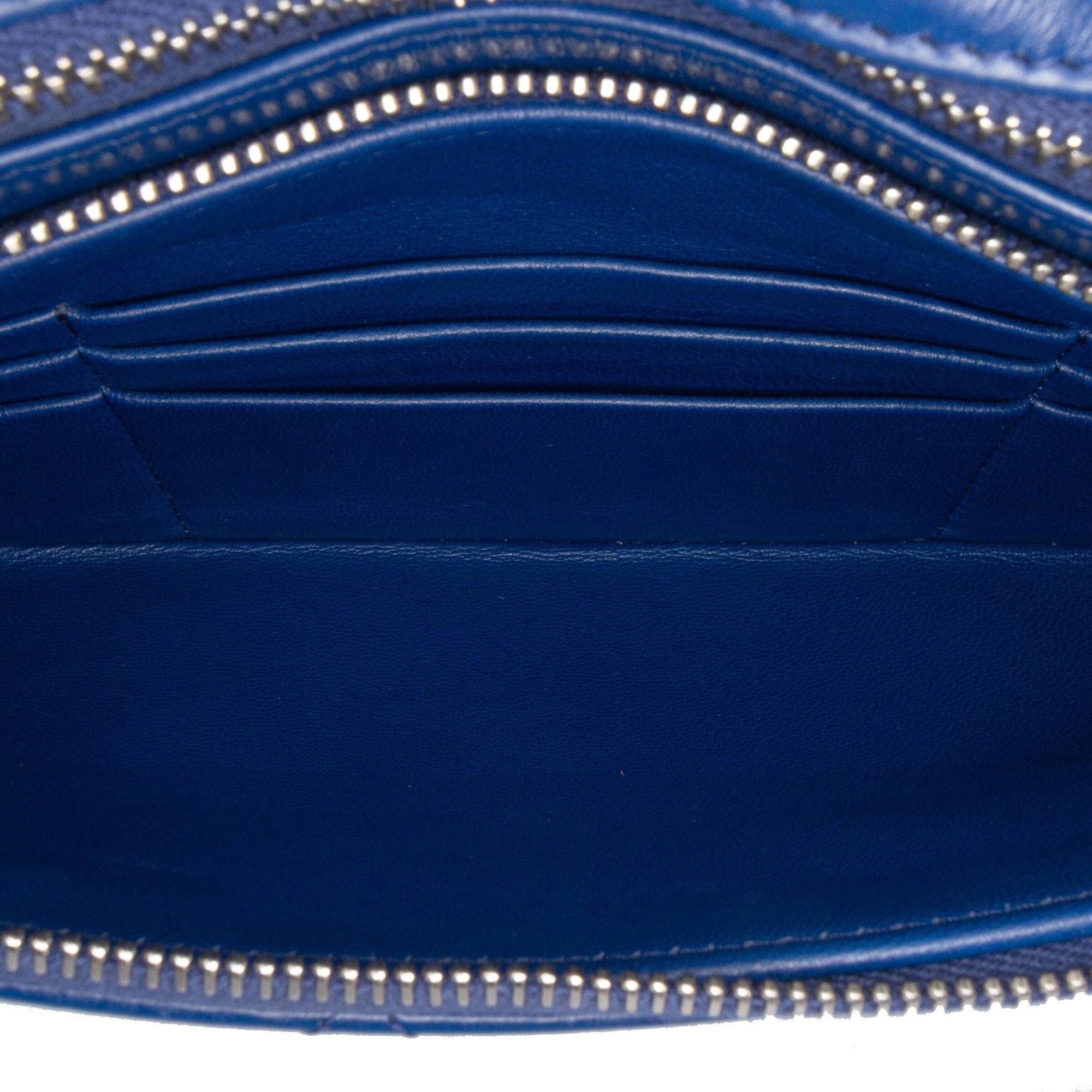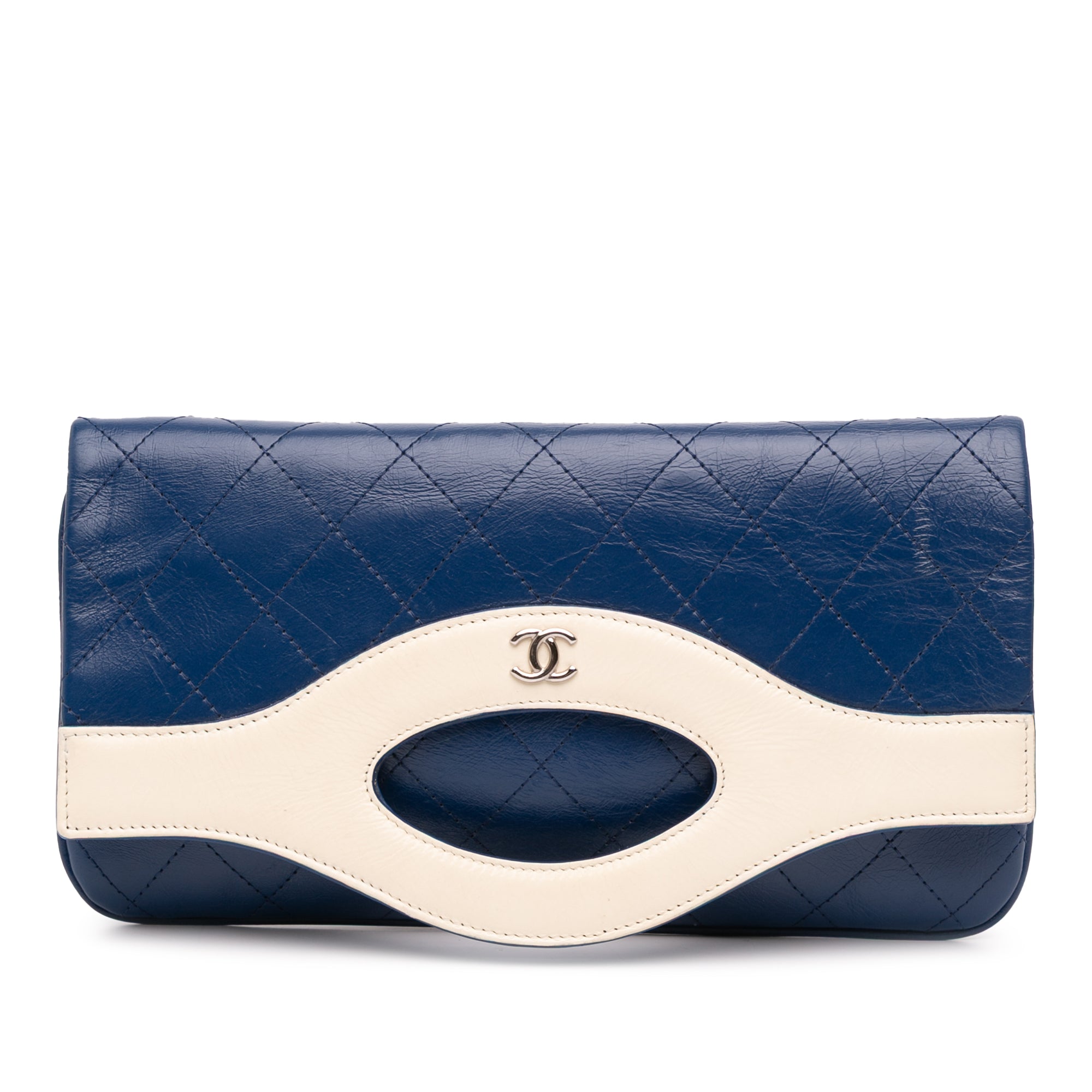 Product Details: Blue Chanel Small Bicolor Aged Calfskin 31 Pouch Clutch Bag. This clutch features a quilted leather body, a front flap, a top zip closure under the flap, an exterior back slip pocket, and interior zip and slip pockets. 5.5" L x 10" W x 0.2" D. Serial number 27340609.