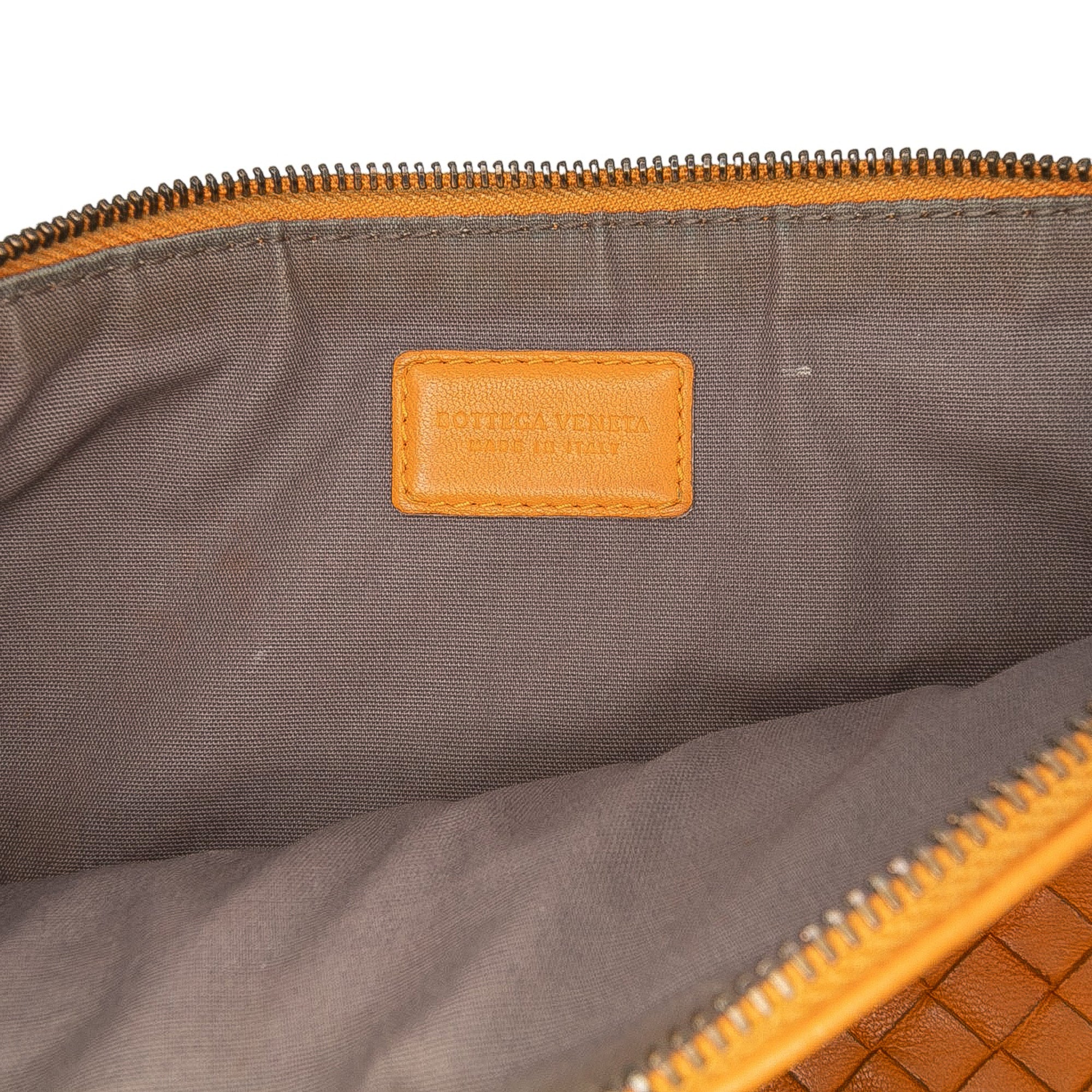 Product Details: Orange Bottega Veneta Nappa Intrecciato Clutch. This clutch bag features a woven leather body, and a top zip closure. Exterior front has been repainted. 5.9" L x 9.8" W x 0.4" D. Serial number B03345692B.