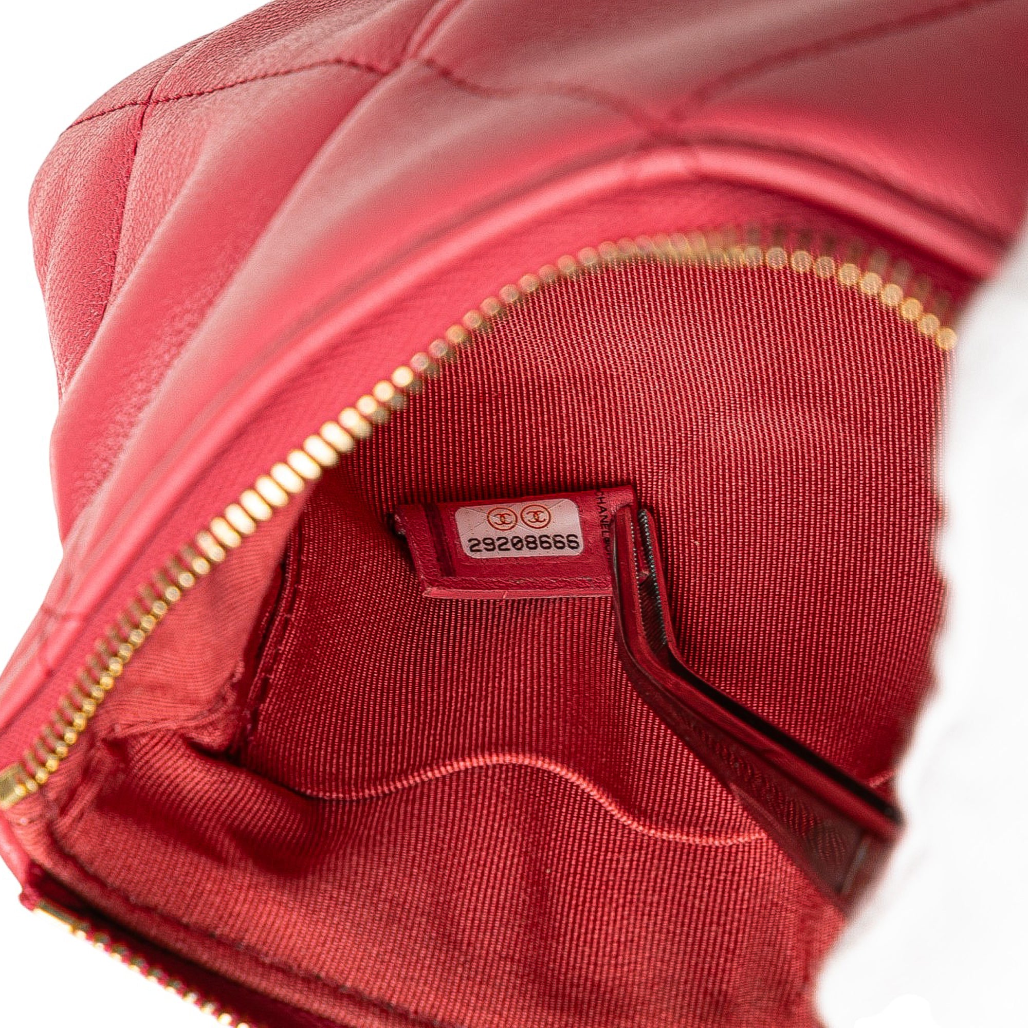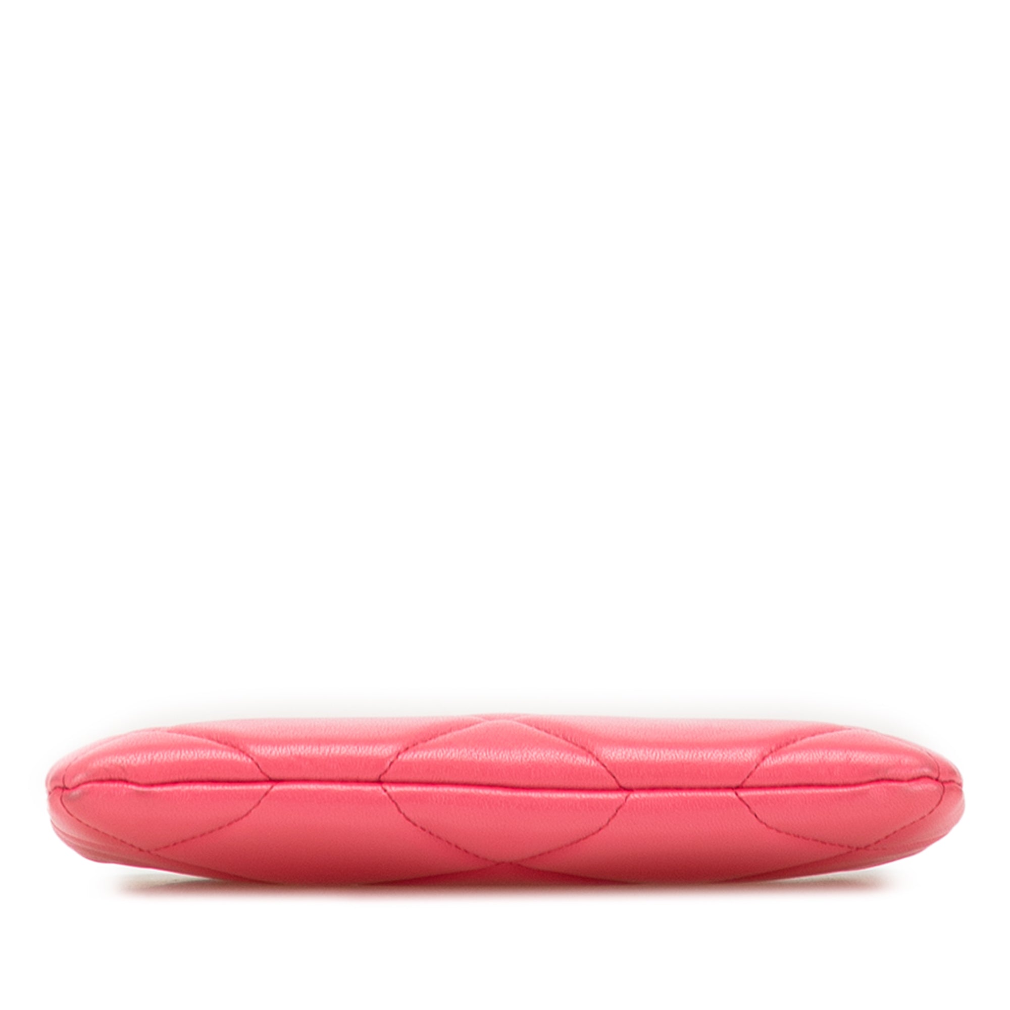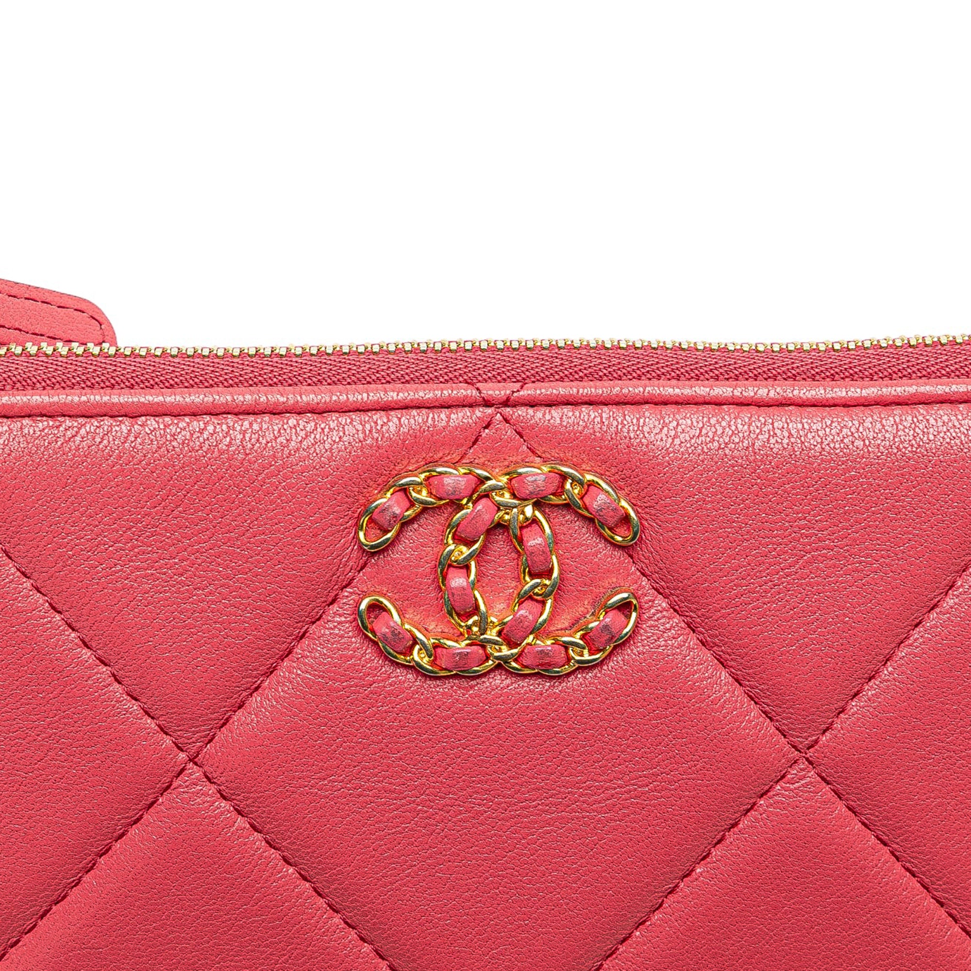 Product Details: Pink Chanel Small Lambskin 19 O Case Pouch Clutch Bag. This clutch bag features a lambskin leather body, a top zip closure, and interior slip pockets. 4.9" L x 7.7" W x 0.8" D. Serial number 29208666.