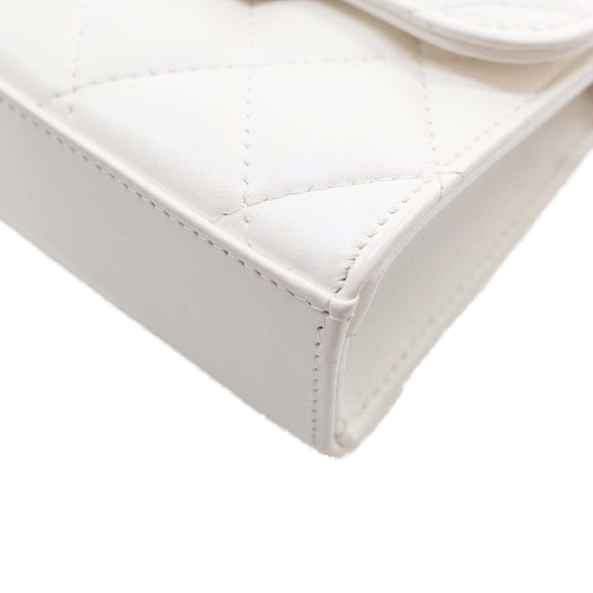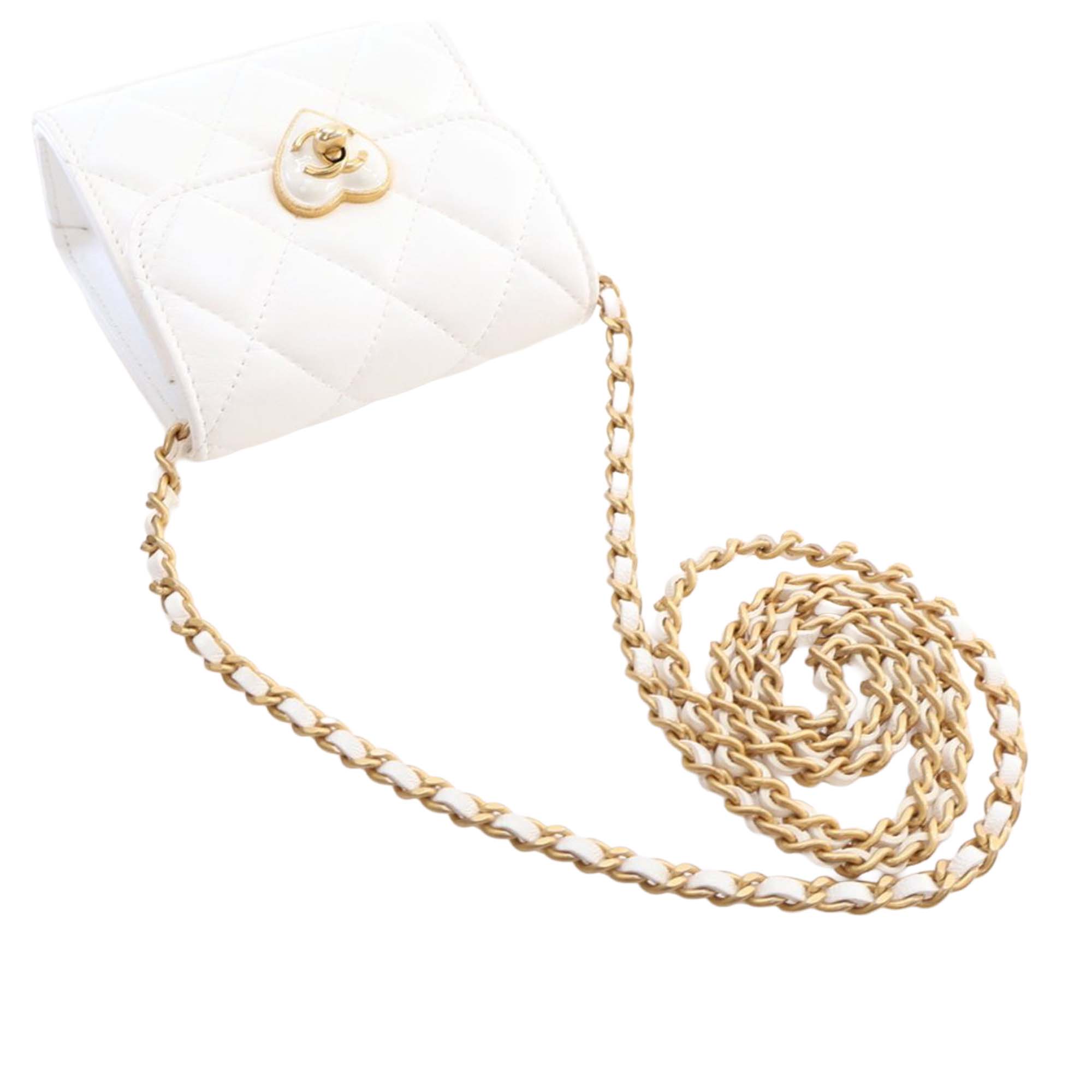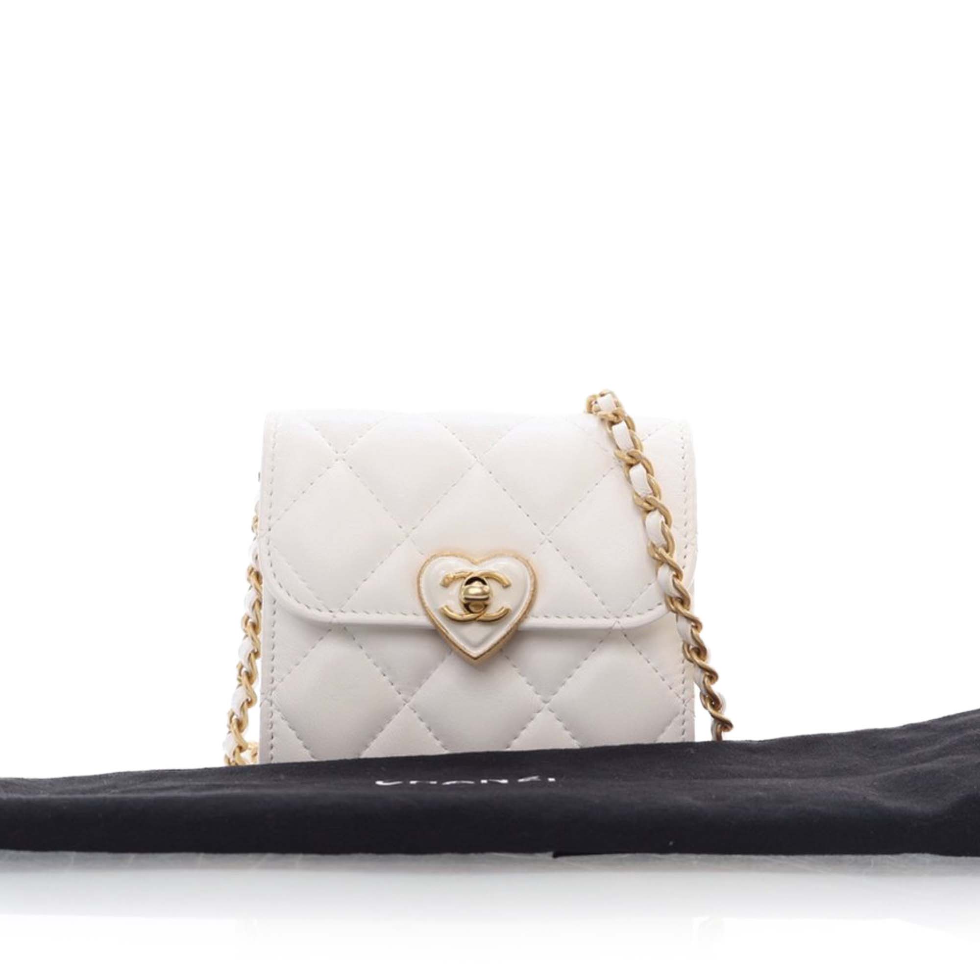 Product Details: White Chanel Mini Quilted Lambskin CC Enamel Heart Clutch With Chain Crossbody Bag. This crossbody features a quilted lambskin leather body, a leather woven chain link strap, a front flap with a CC turn lock closure, and interior slip pockets. 4.3" L x 3.9" W x 2" D.