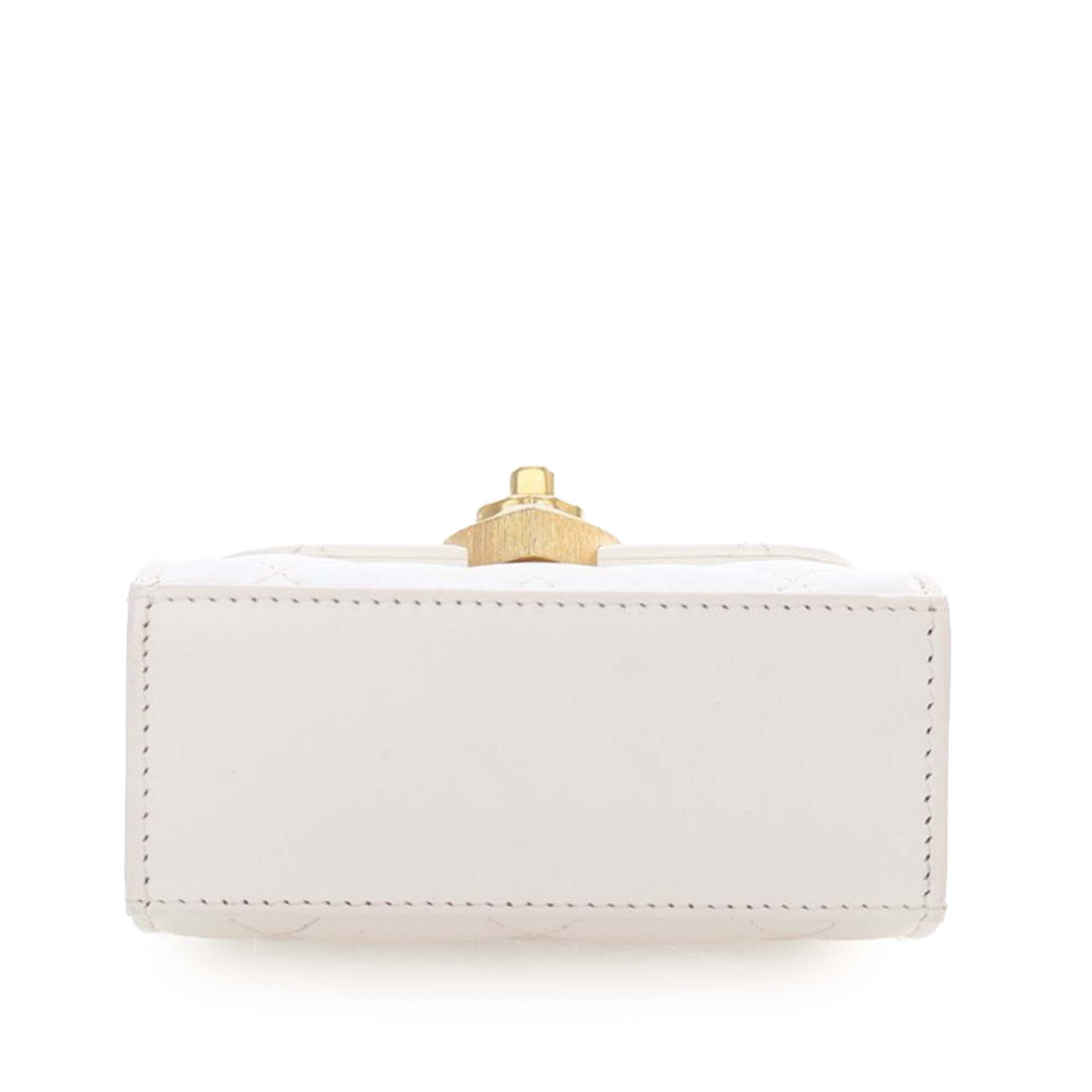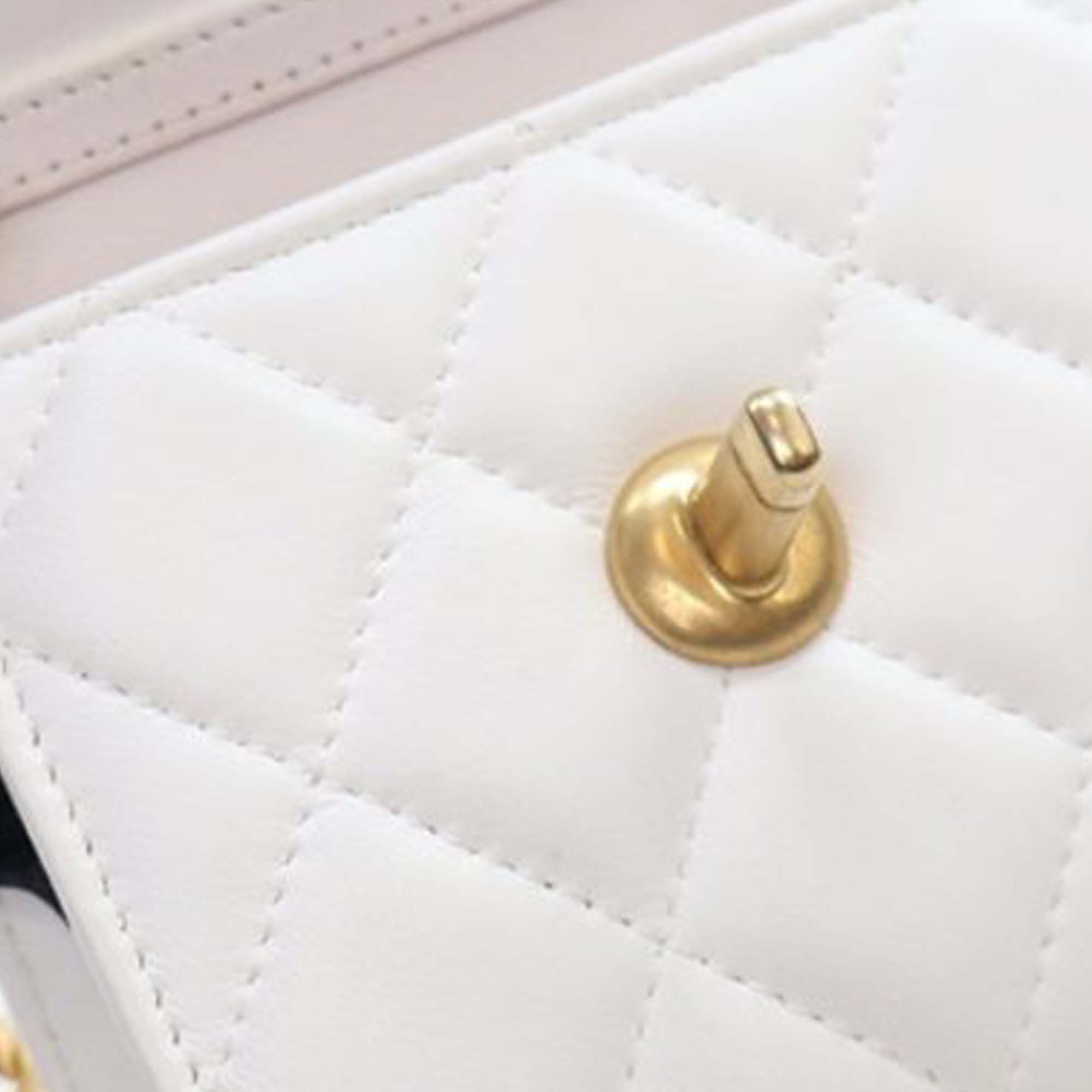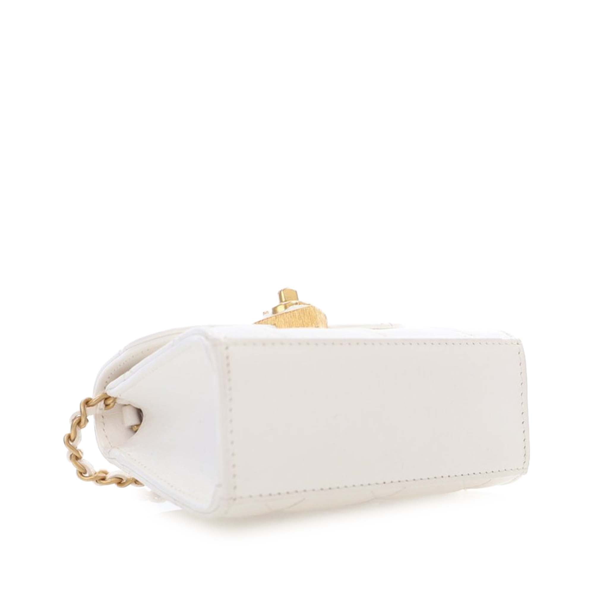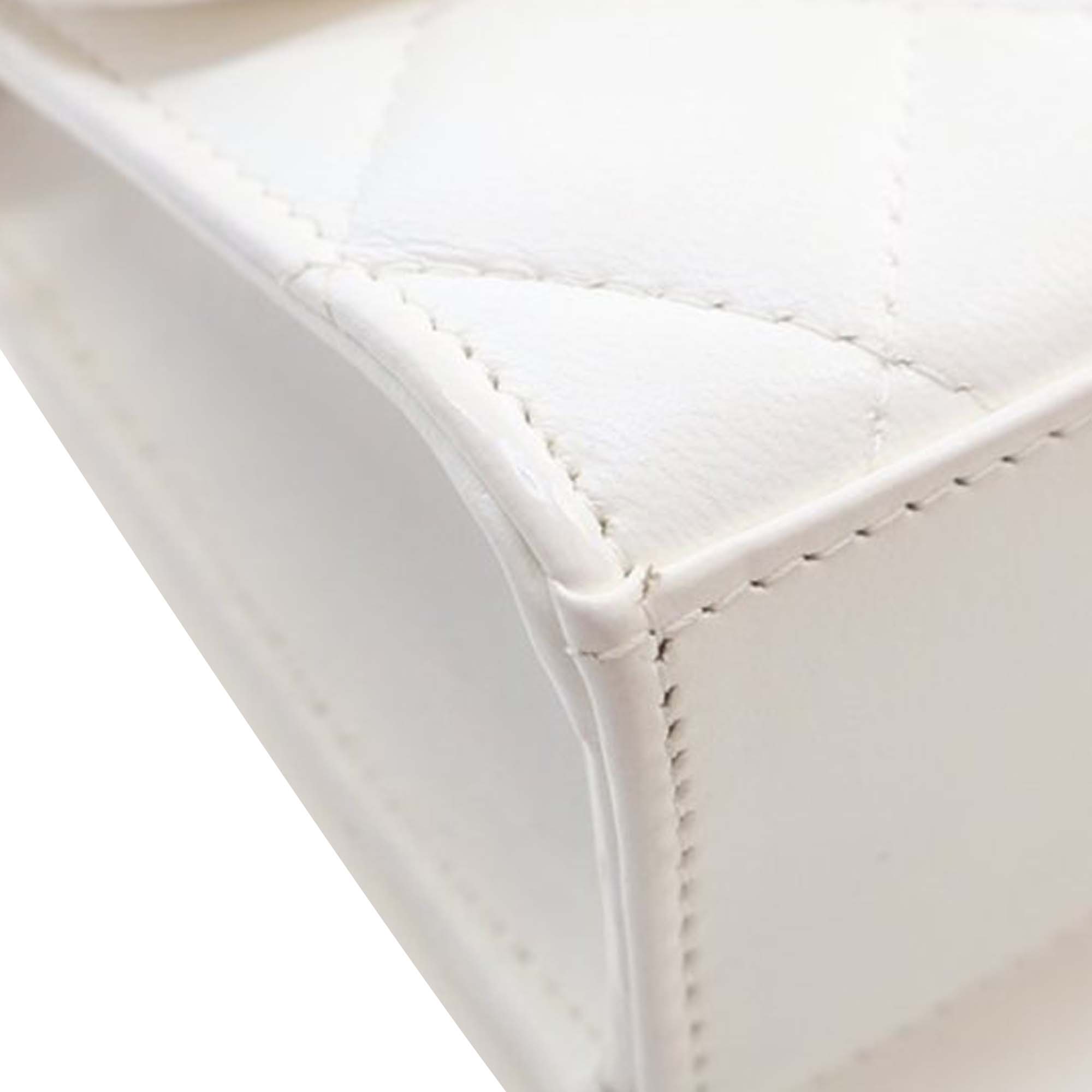 Product Details: White Chanel Mini Quilted Lambskin CC Enamel Heart Clutch With Chain Crossbody Bag. This crossbody features a quilted lambskin leather body, a leather woven chain link strap, a front flap with a CC turn lock closure, and interior slip pockets. 4.3" L x 3.9" W x 2" D.