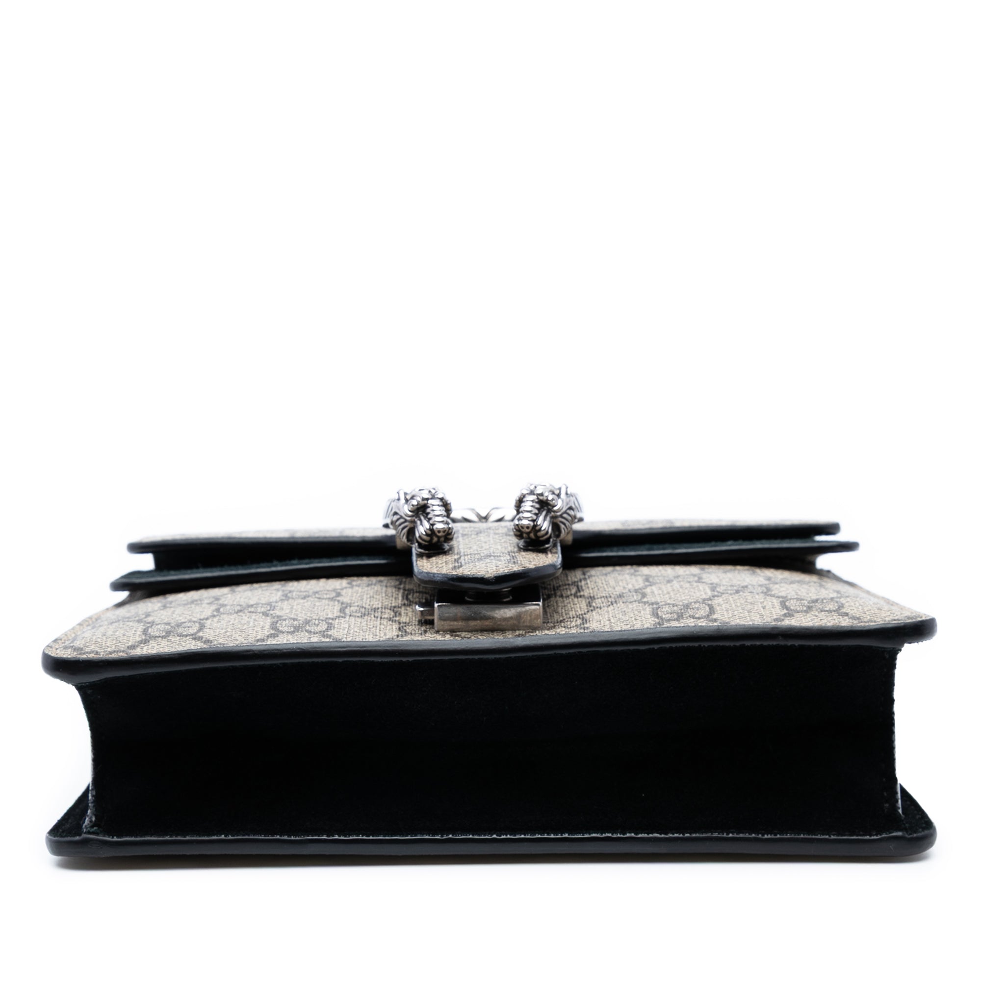 Product Details: Brown Gucci Small GG Supreme Dionysus Crossbody. The Dionysus Crossbody bag features a coated canvas body with suede leather trim, a silver-tone chain strap, a top flap with a magnetic snap button closure, and an interior zip compartment. 5.9" L x 7.9" W x 2.4" D. Serial number 421970 204991.