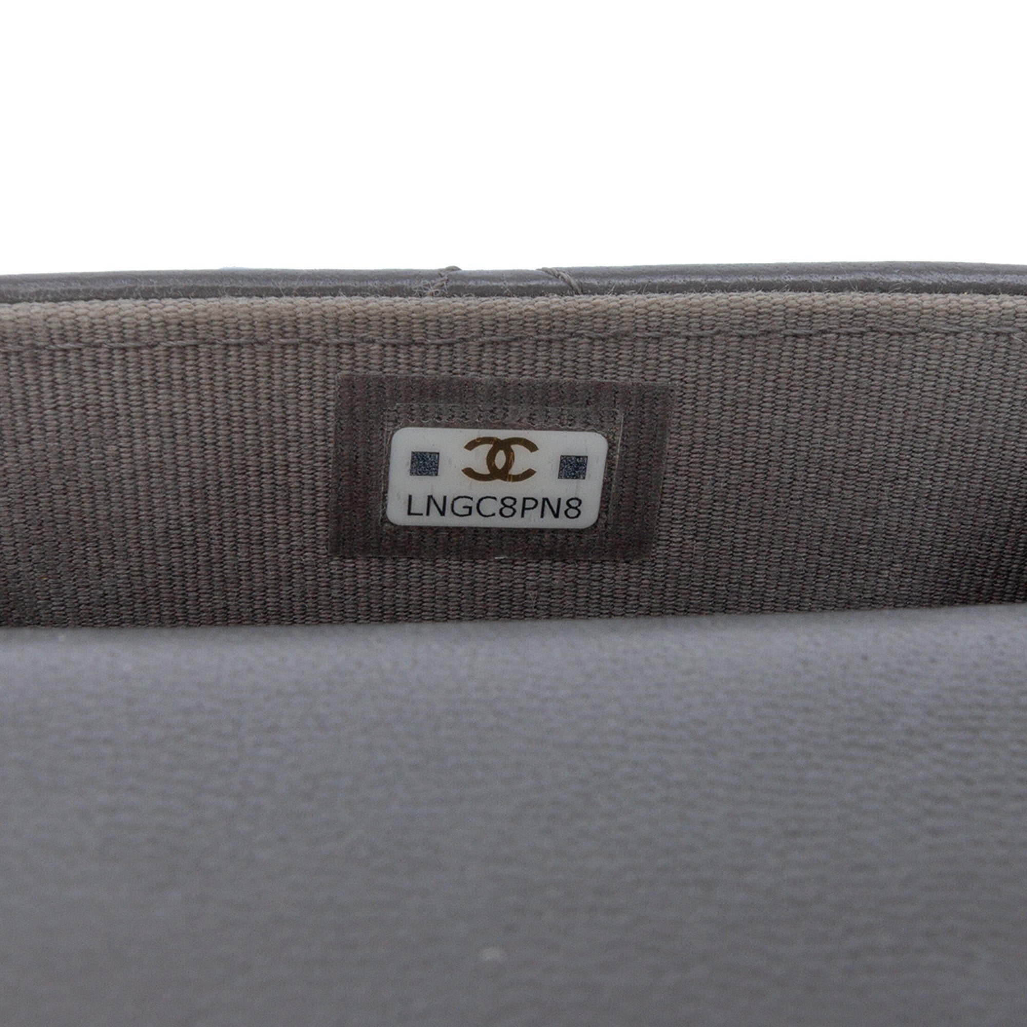 Product Details: Gray Chanel Lambskin 19 Phone Holder with Chain Crossbody Bag. This phone holder features a quilted lambskin leather body, a leather-woven chain strap with leather shoulder guard, and a top flap with snap closure. 7.5" L x 3.9" W x 1" D, 1.6" drop. Serial number LNGC8PN8.