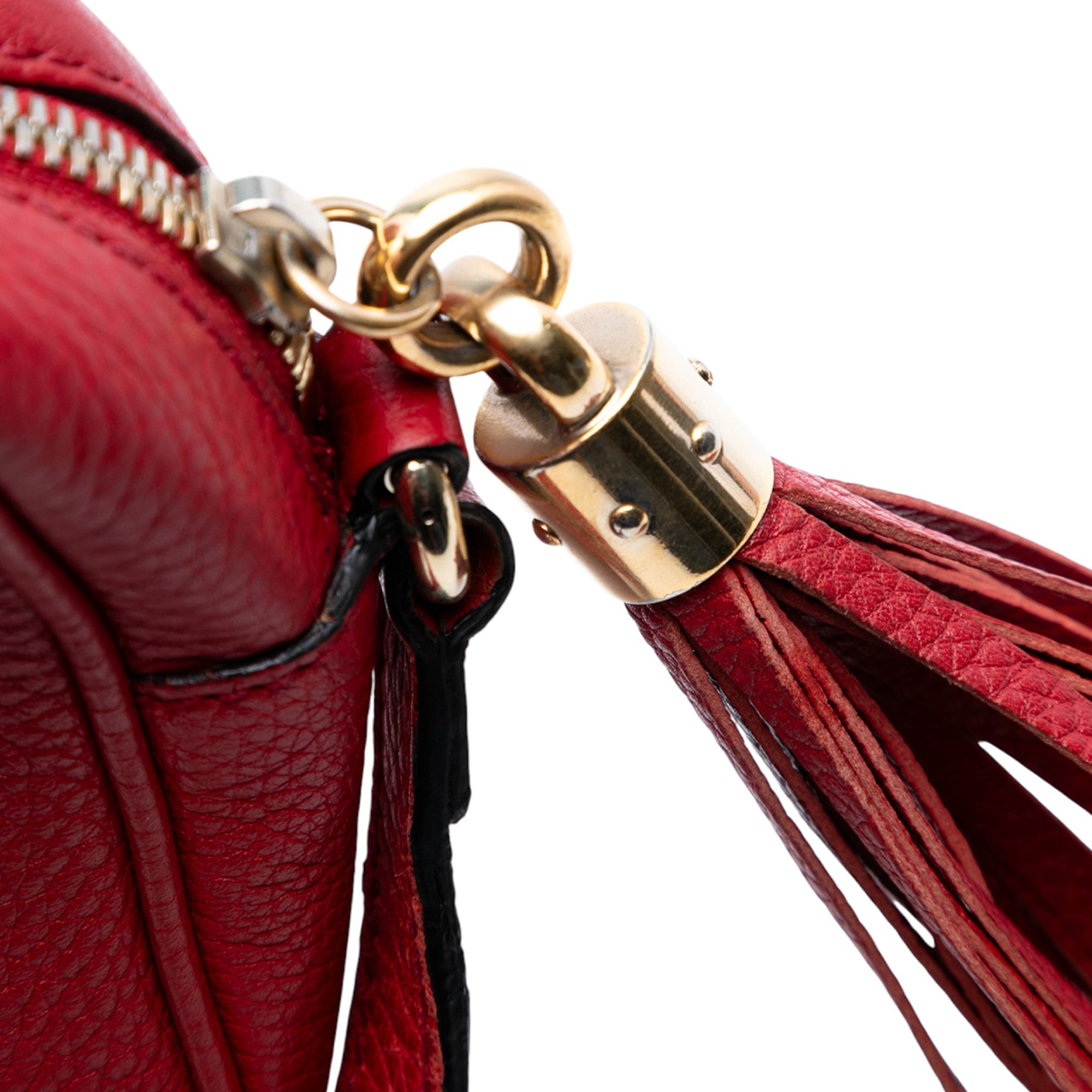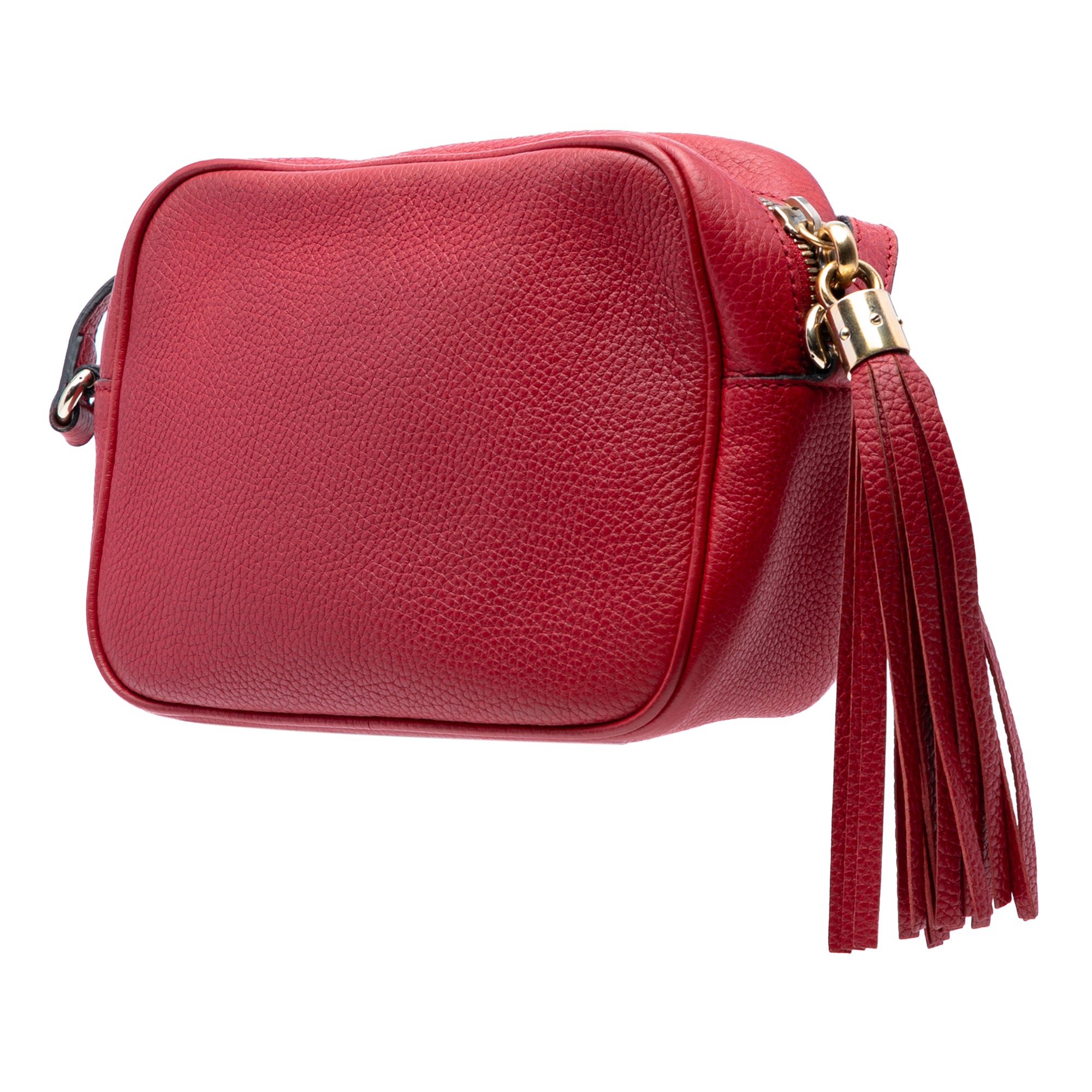 Product Details: Red Gucci Leather Soho Disco Crossbody. The Soho Disco crossbody features a leather body, an adjustable flat leather strap, a tassel detail, a top zip closure, and interior slip pockets. 6.3" L x 7.9" W x 3" D. Serial number 308364 498879.