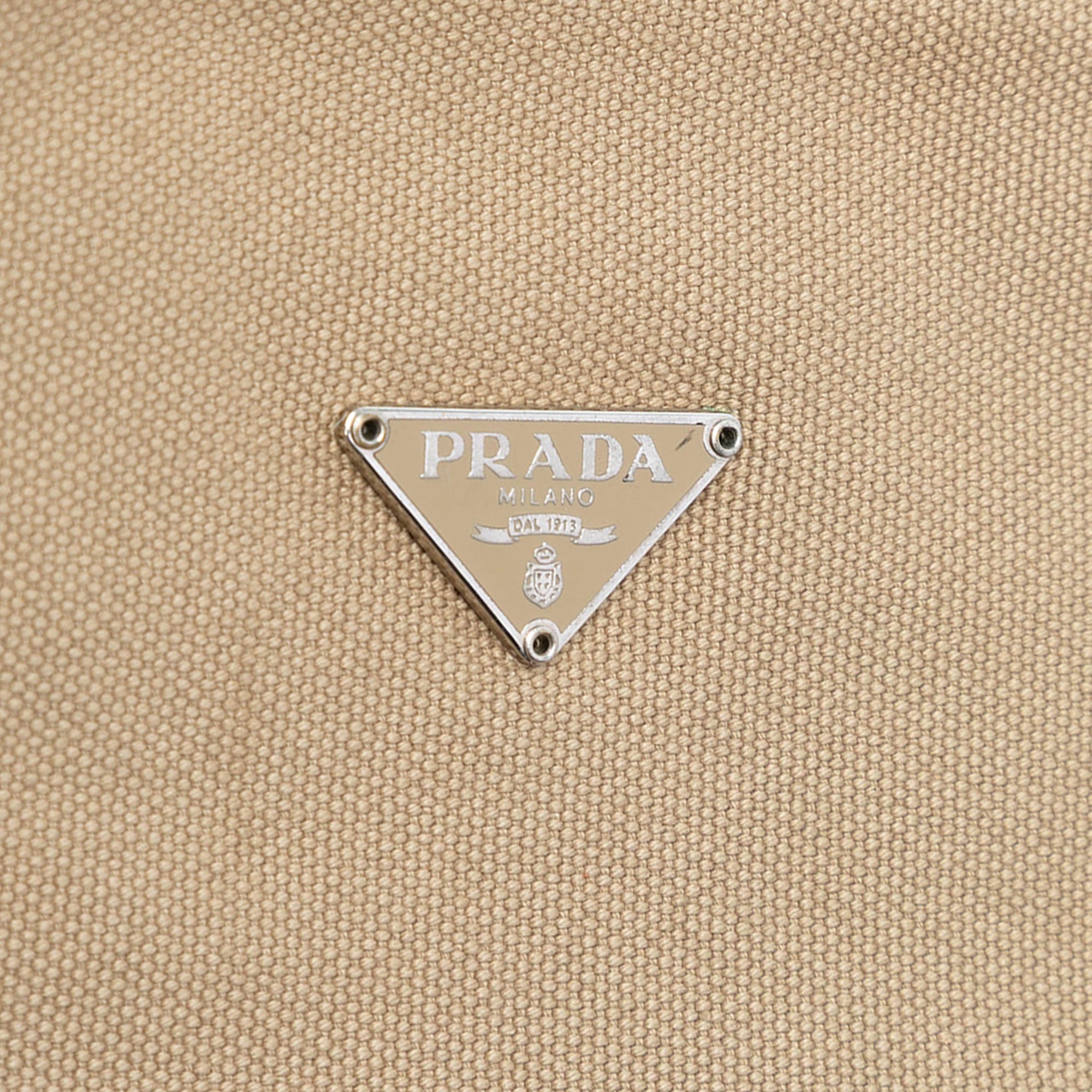 Product Details: Brown Prada Cinghiale Trimmed Canapa Tote. This tote features a canvas body with leather trim, flat leather handles, an open top, and an interior zip pocket. 13.2" L x 15.4" W x 0.4" D, 7.1" drop.