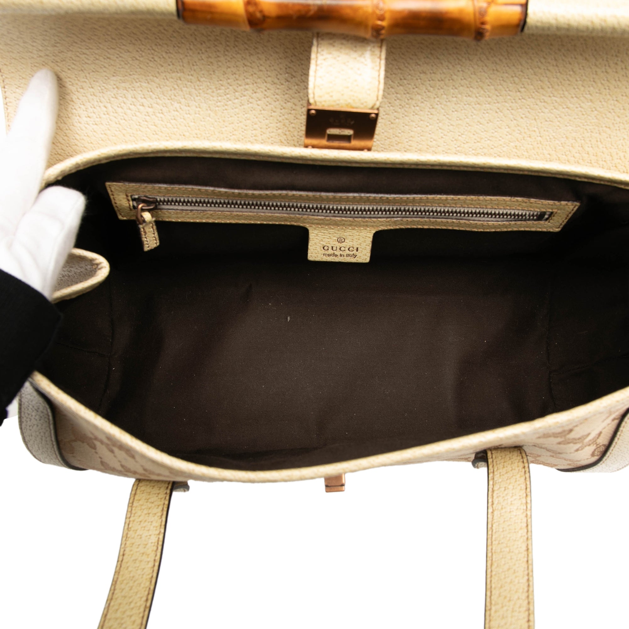 Product Details: Beige Gucci GG Canvas Bamboo Bullet Shoulder Bag. This shoulder bag features a canvas body with leather trim, flat leather straps, a front flap with a push lock closure, and an interior zip pocket. 7.5" L x 12.2" W x 5.1" D. Serial number 111713 002058.