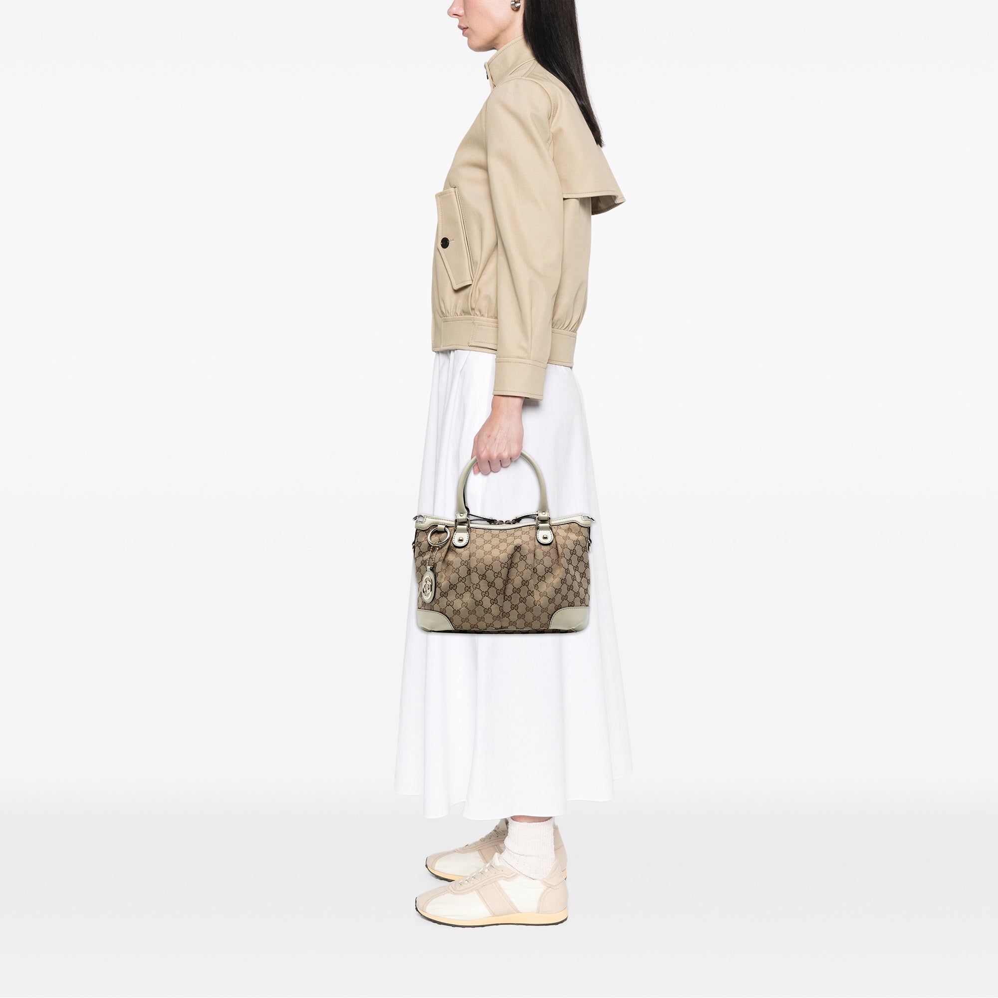Product Details: Beige Gucci GG Canvas Sukey Satchel. The Sukey features a canvas body with leather trim, rolled leather handles, top zip closure, and nterior zip and slip pockets. 10" L x 11.4" W x 5.1" D, 5.3" drop. Serial number 247902 502752.