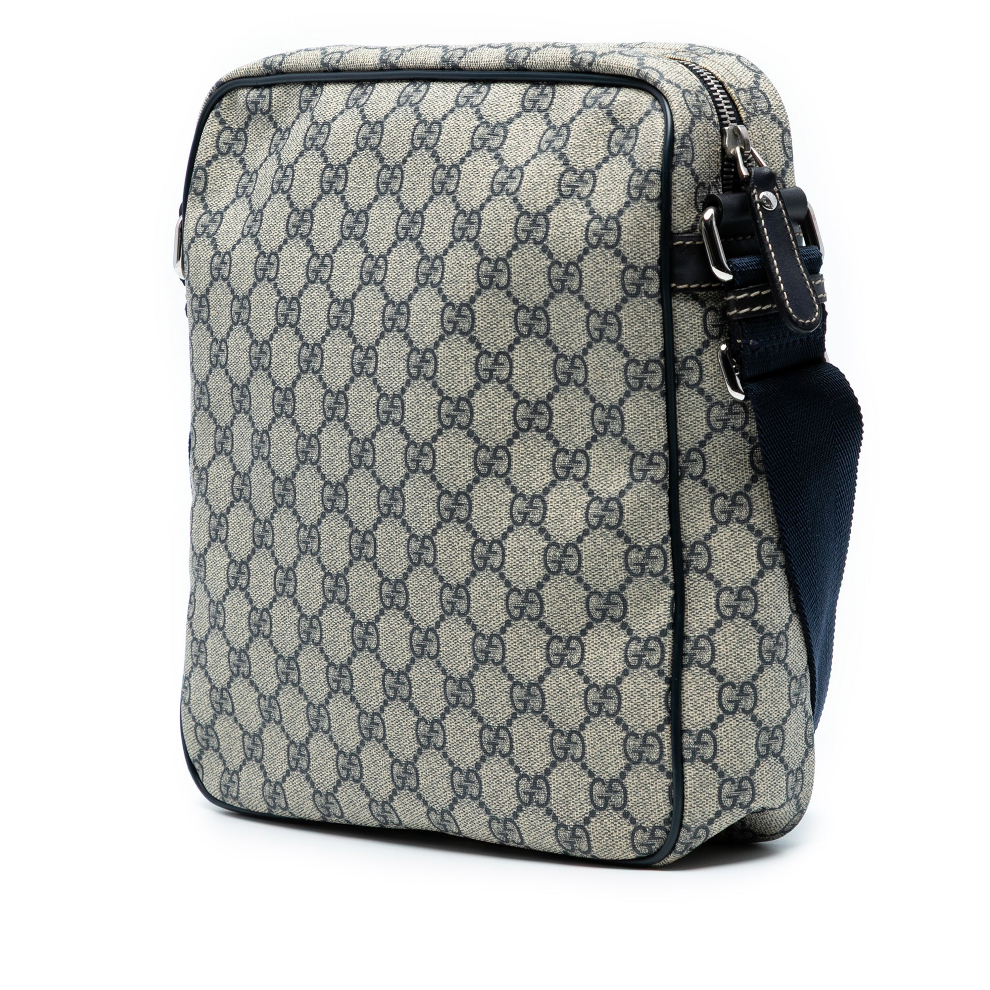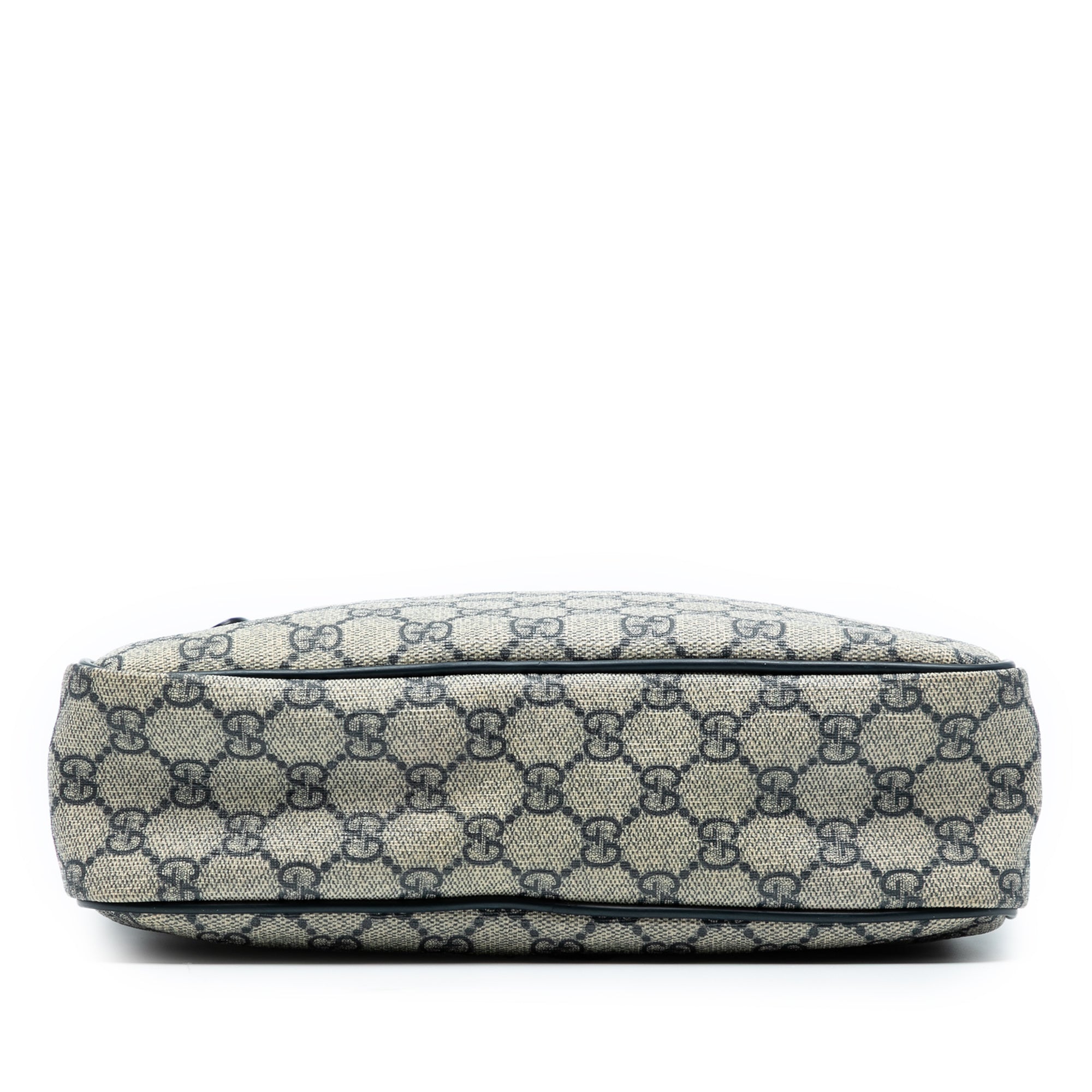 Product Details: Beige Gucci GG Supreme Crossbody. This crossbody bag features a coated canvas body with leather trim, an adjustable flat strap, a top zip closure, an exterior front zip pocket, and an interior slip pocket. 11.6" L x 10.4" W x 2.8" D. Serial number 201448 002123.