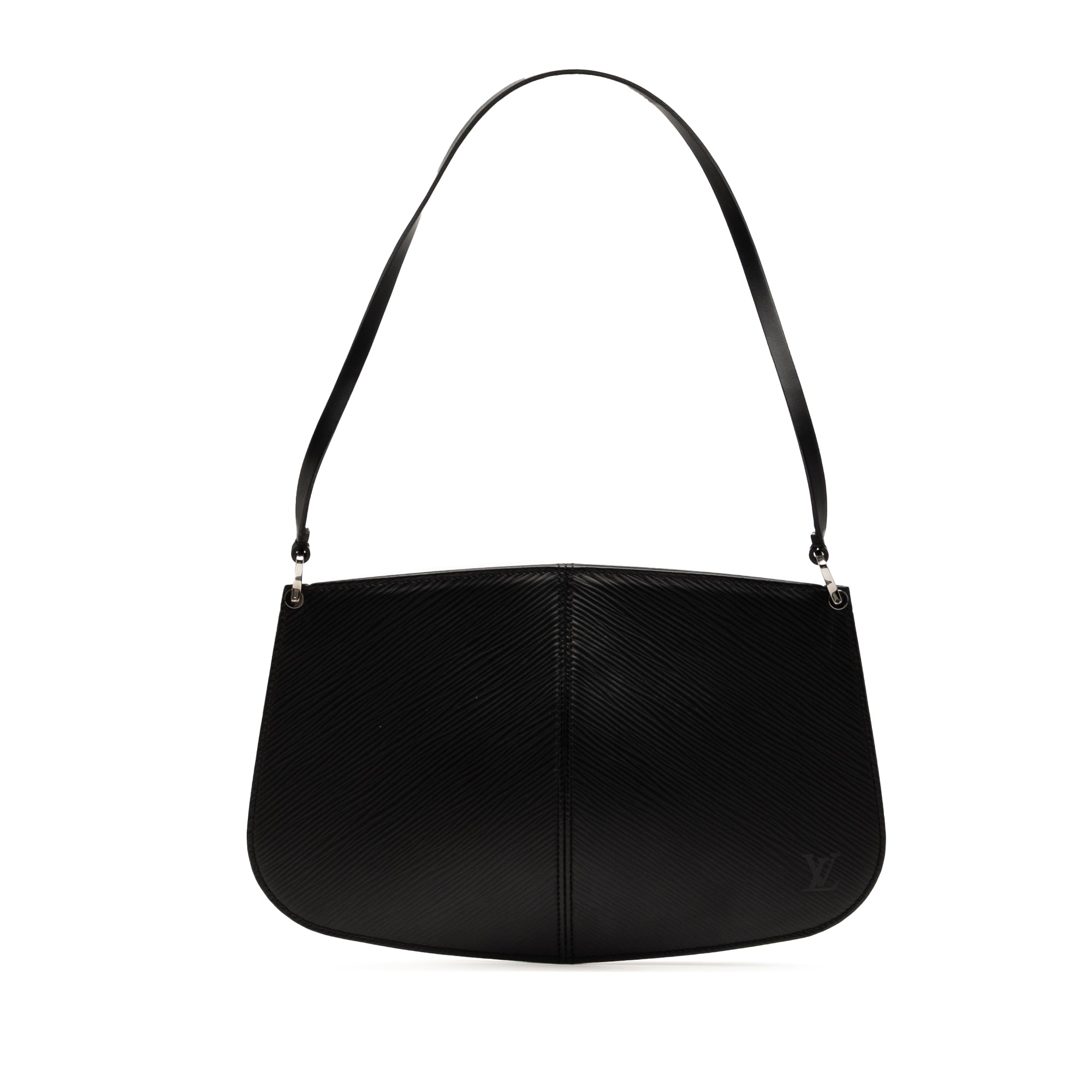 Product Details: Black Louis Vuitton Epi Demi Lune Pochette Shoulder Bag. The Pochette Demi Lune features an epi leather body, a flat leather strap, and a top magnetic closure. 6.5" L x 10.2" W x 1.6" D, 8.3" drop. Serial number SP0044.