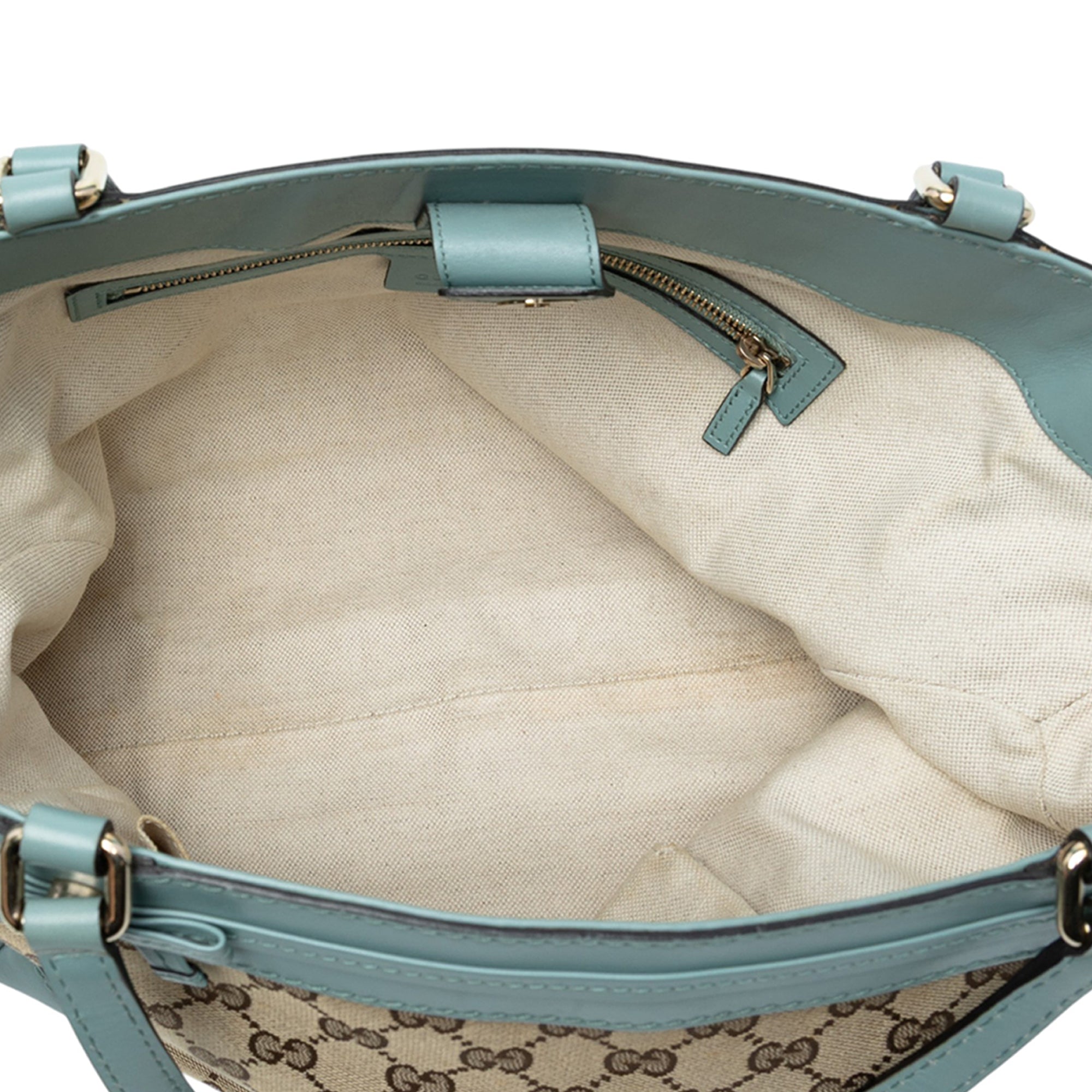 Product Details: Blue Gucci GG Canvas Mayfair Tote. The Mayfair tote bag features a canvas body with leather trim, flat leather straps, an open top with magnetic snap button closure, and interior zip and slip pockets. 10.4" L x 11.8" W x 4.7" D, 6.5" drop. Serial number 257061 486628.