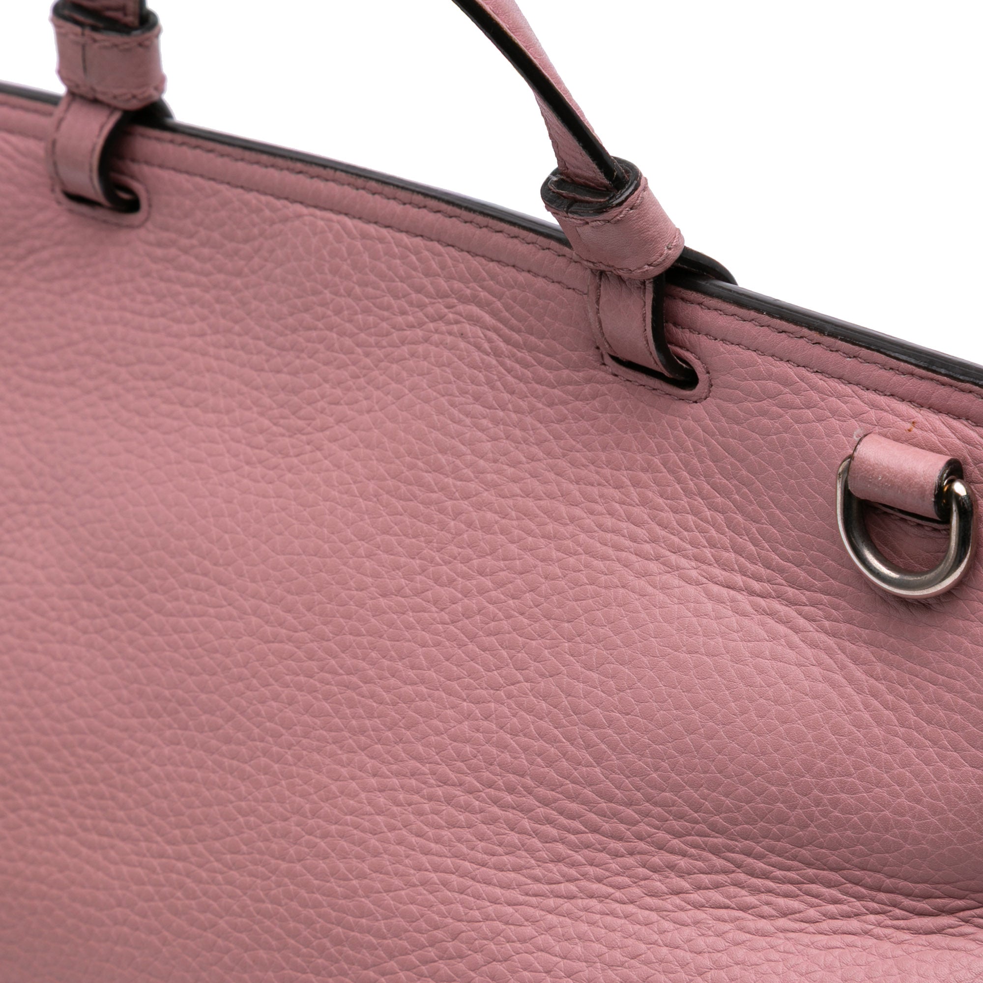 Product Details: Pink Gucci Medium Leather Bamboo Daily Satchel. The Daily satchel features a leather body, a flat top handle, a detachable flat leather strap, a front flap with a bamboo bullet twist lock closure, and interior zip and slip pockets. 10" L x 12.8" W x 4.3" D, 3.5" drop. Serial number 392013 525040.