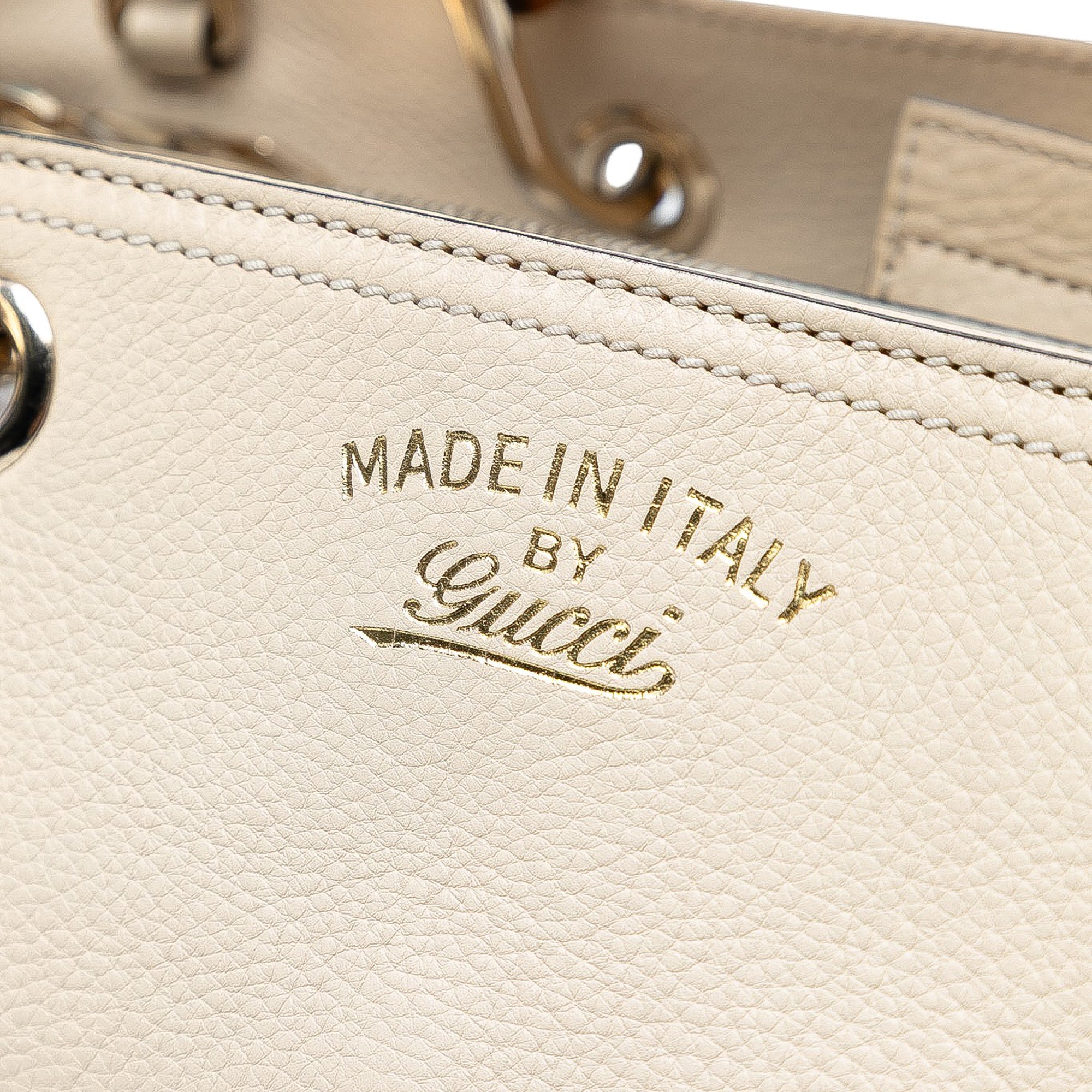 Product Details: White Gucci Medium Calfskin Bamboo Shopper Satchel. The Bamboo Shopper features a leather body, bamboo top handles, a detachable flat leather strap, an open top with a magnetic closure, an interior zip compartment, and interior zip and slip pockets. 8.3" L x 13" W x 5.7" D, 3.5" drop. Serial number 323660 520981.