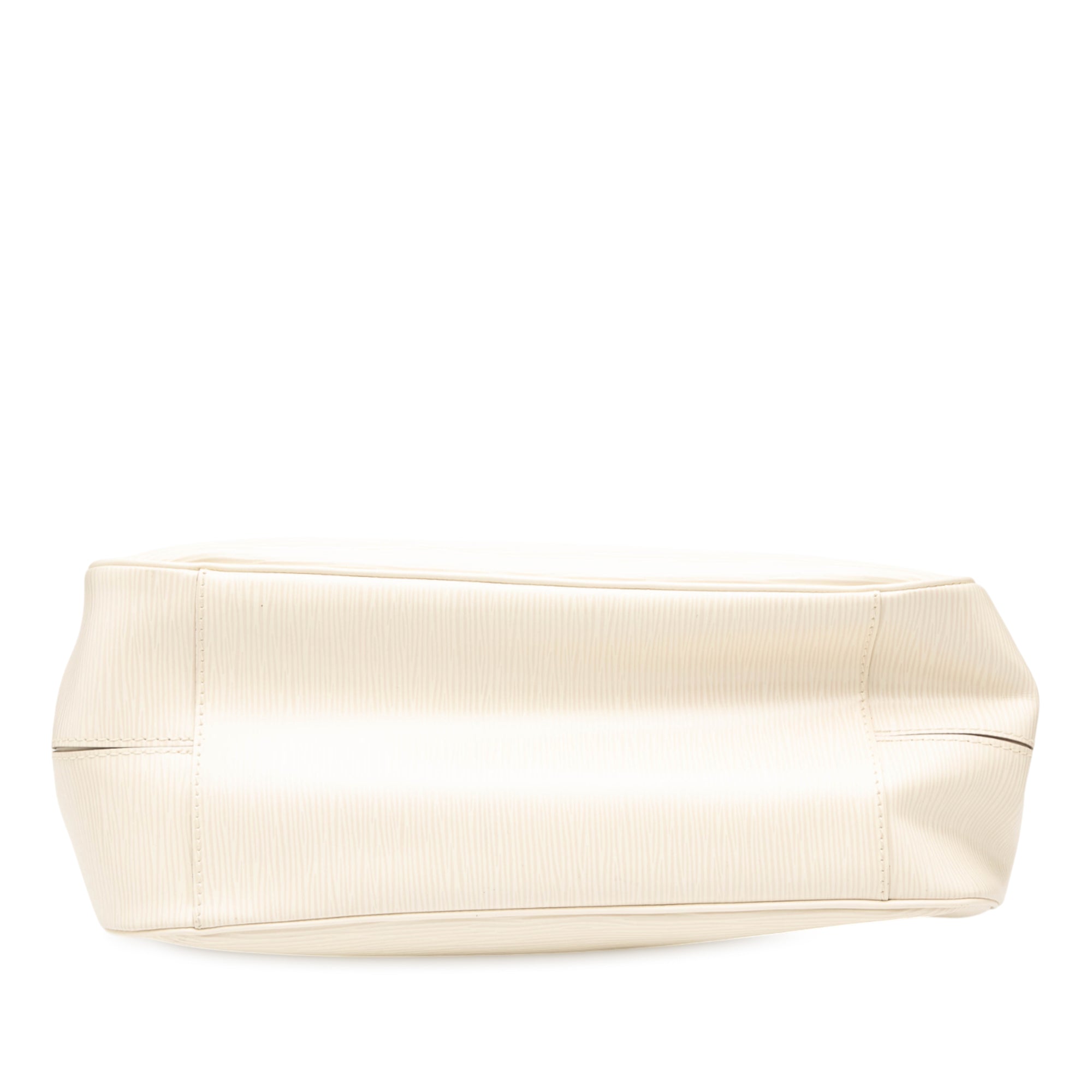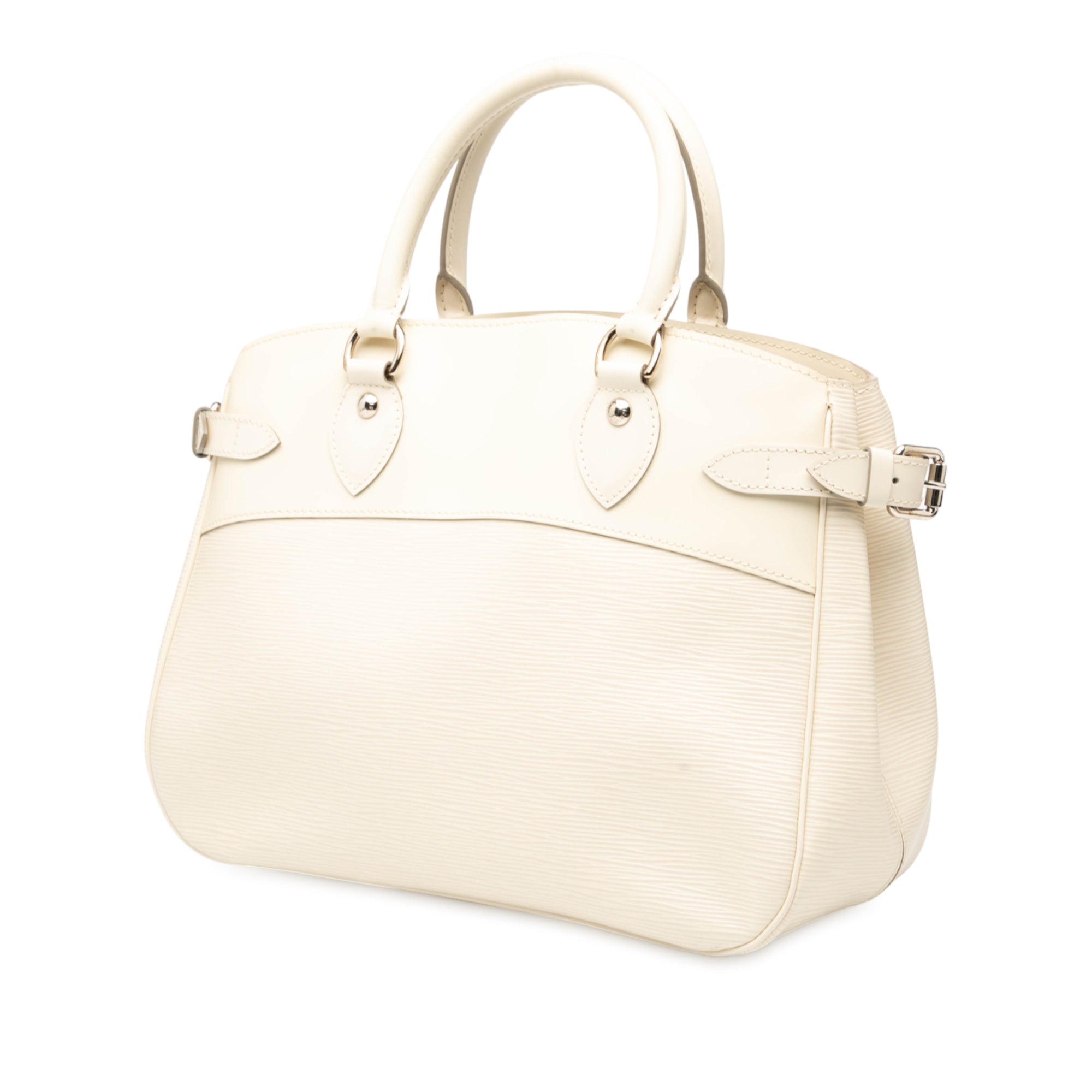 Product Details: White Louis Vuitton Epi Passy PM Handbag. The Passy PM features an epi leather body with side belt details, rolled leather handles, an open top, an interior zip compartment, and interior slip pockets. 10" L x 12.4" W x 5.1" D, 3.9" drop. Serial number SN4069.