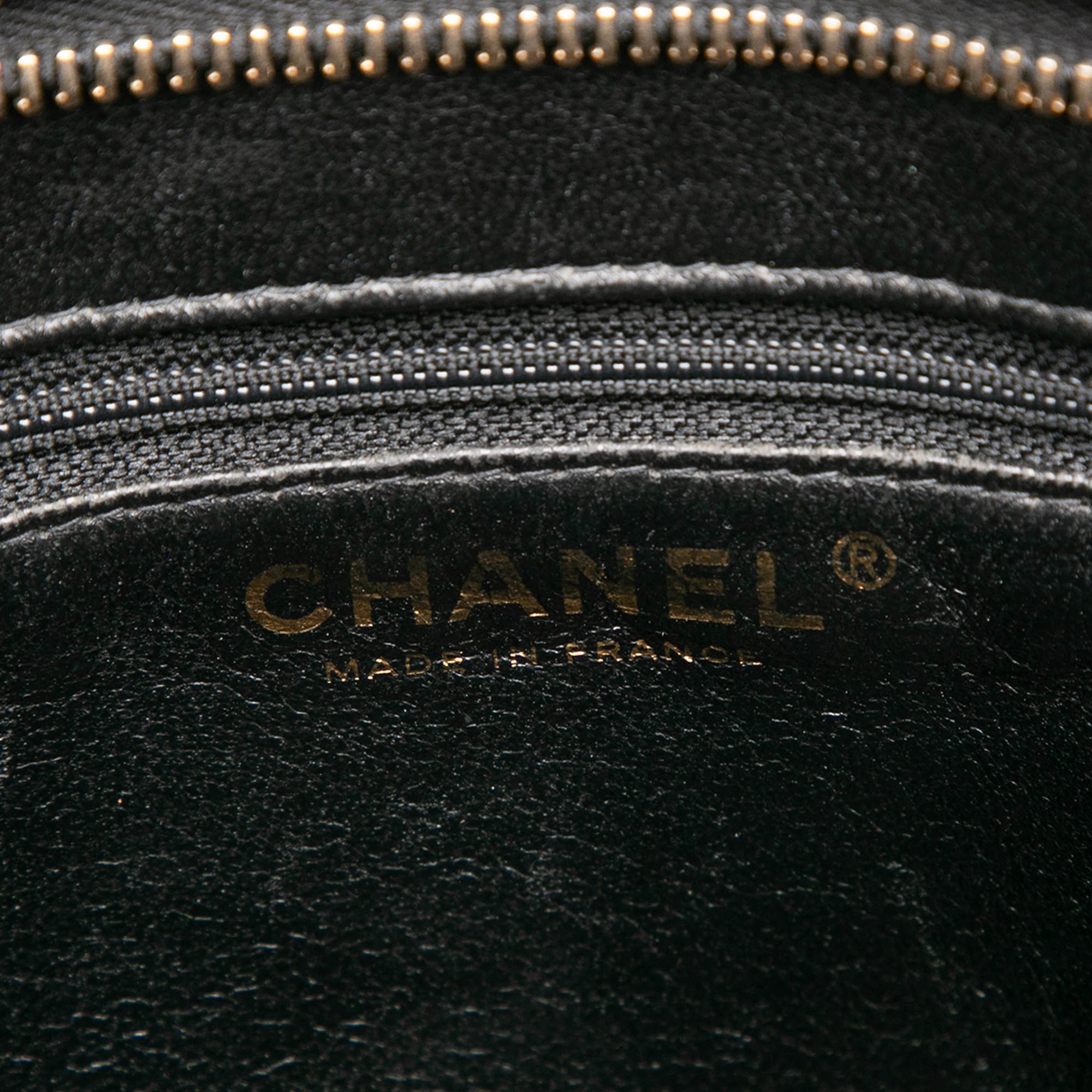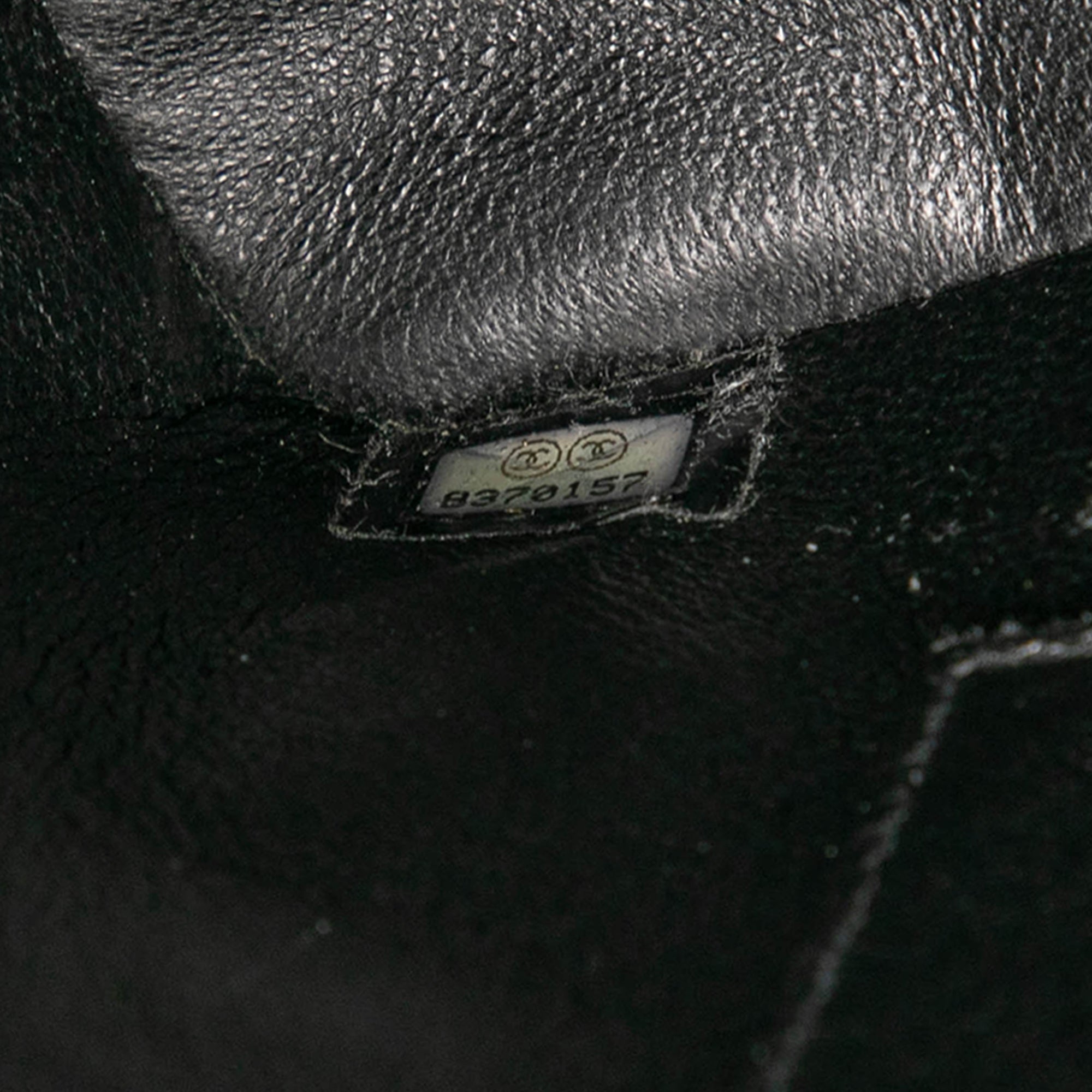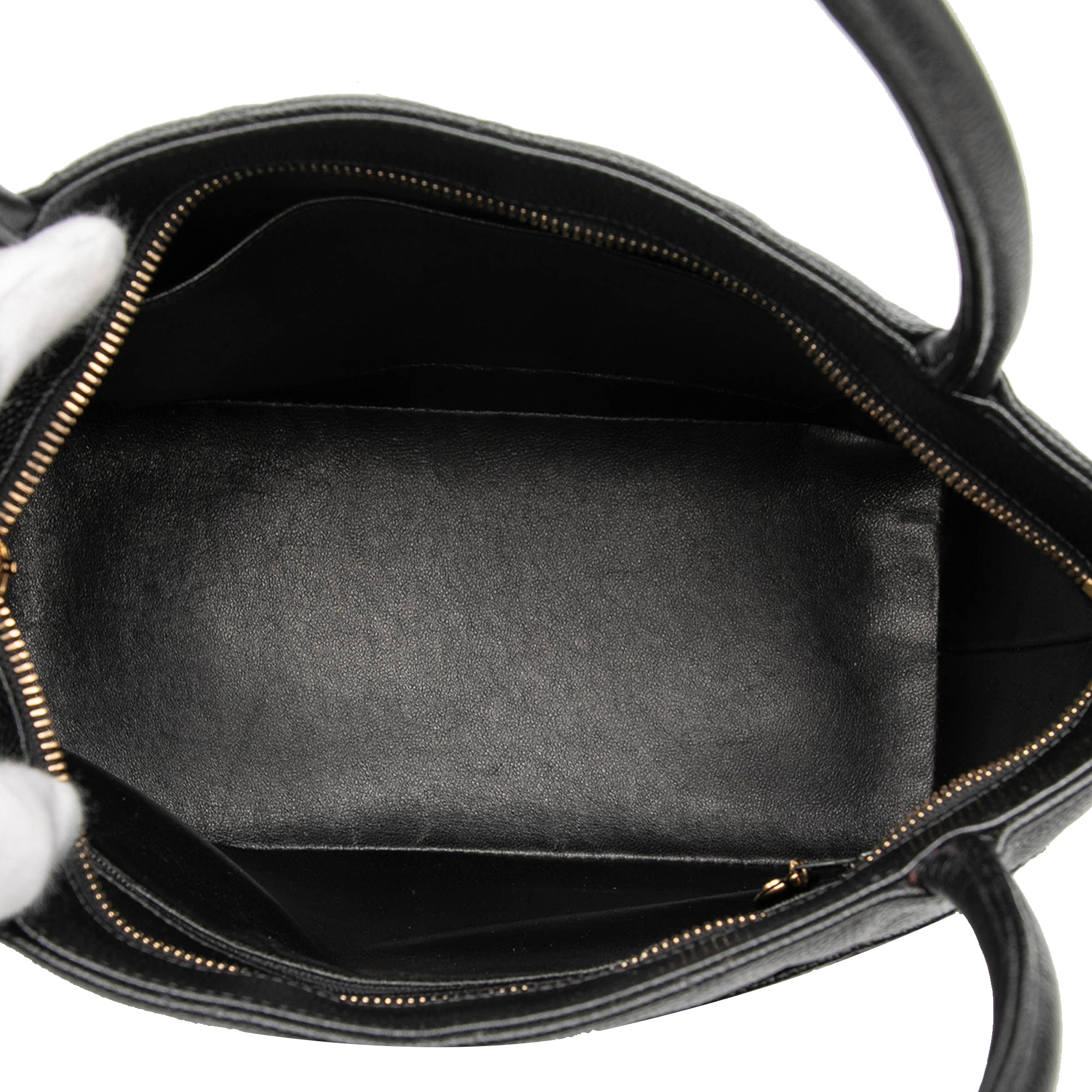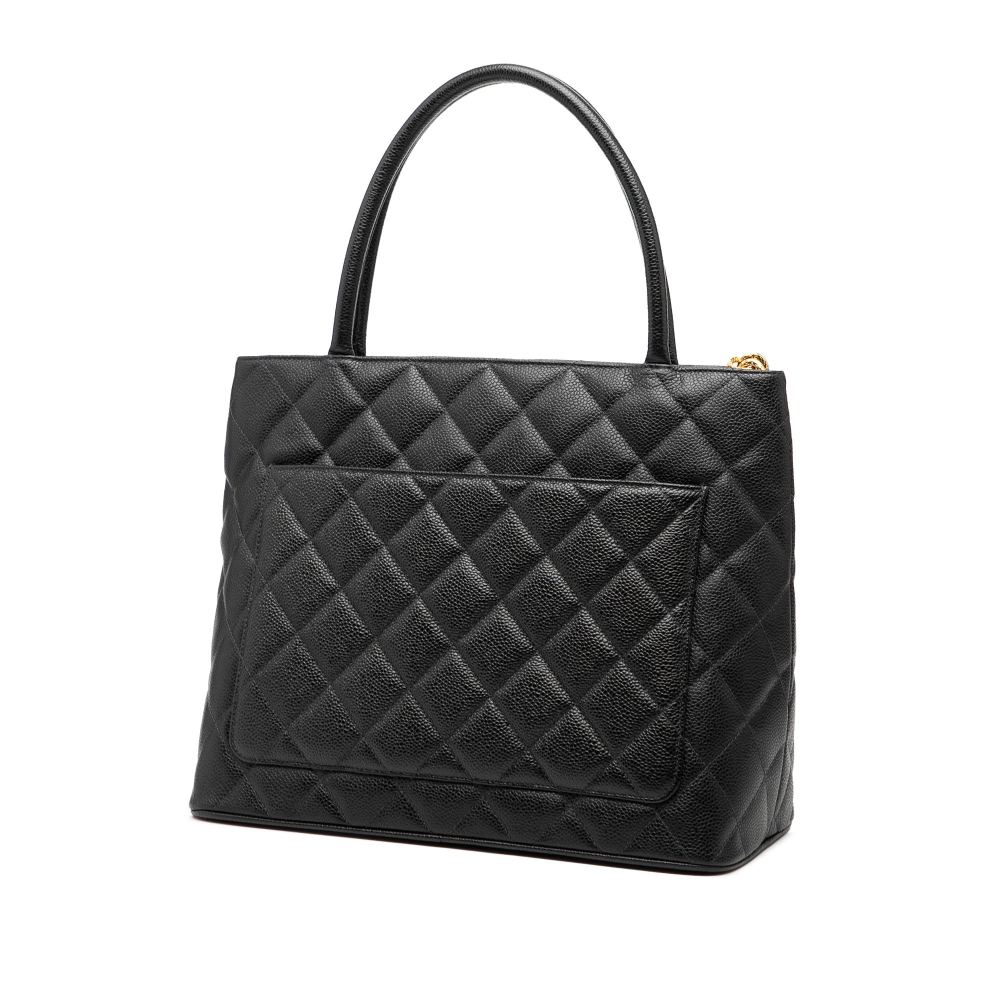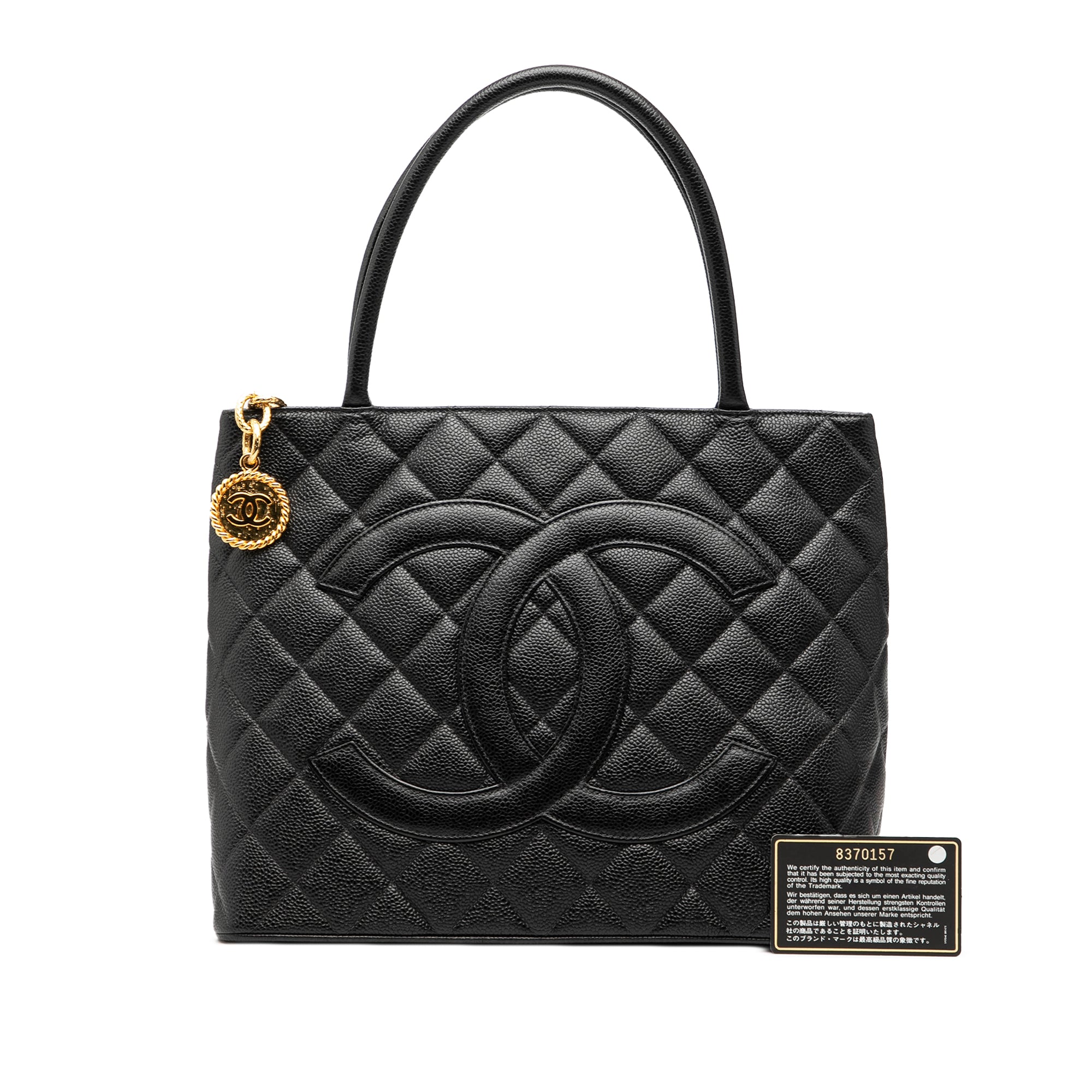 Product Details: Black Chanel Caviar Medallion Tote. The Medallion tote bag features a quilted caviar leather body, rolled leather handles, a top zip closure, an exterior back slip pocket, and interior zip and slip pockets. 9.8" L x 11.8" W x 5.9" D, 5.9" drop. Serial number 8370157.