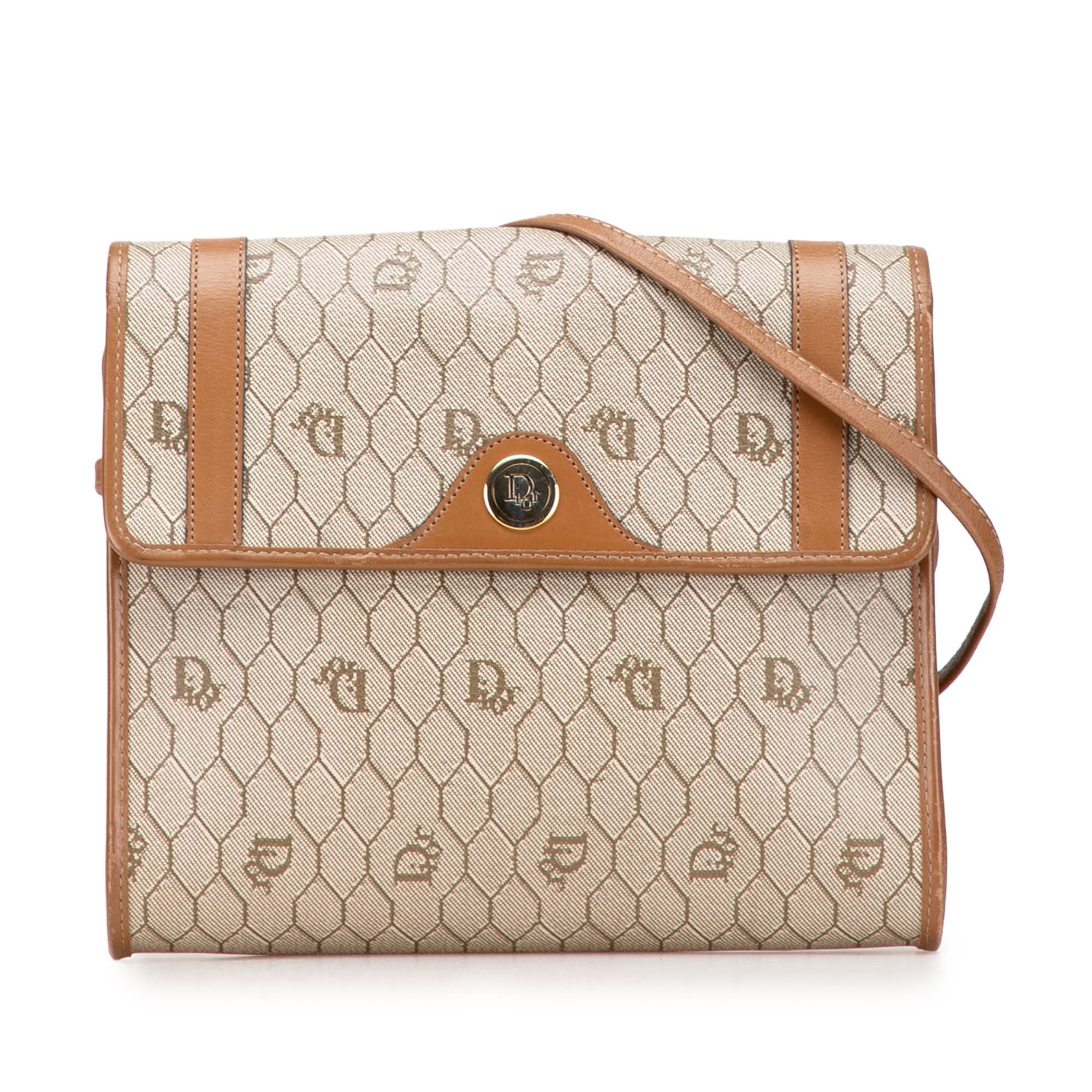 Product Details: Brown Dior Honeycomb Coated Canvas Crossbody. This crossbody bag features a coated canvas body with leather trim, a flat leather strap, and a front flap with a magnetic snap closure. 7.3" L x 8.5" W x 2.2" D.