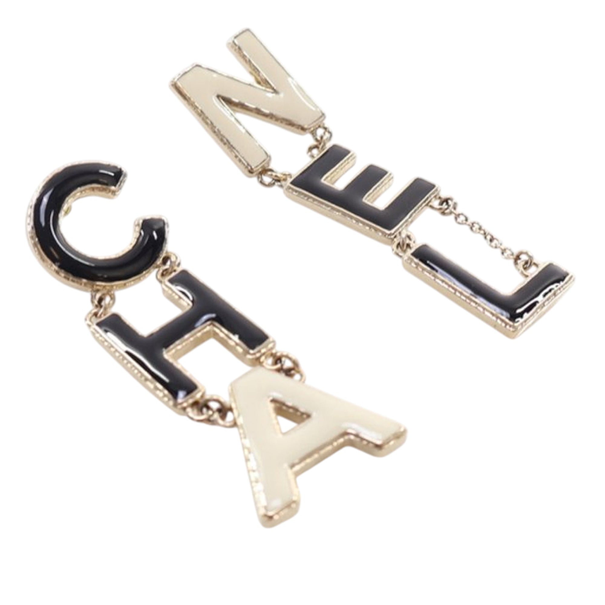 Product Details: Black Chanel Gold Plated and Enamel Cha-Nel Logo Drop Push Back Earrings. These earrings feature a gold-tone metal and enamel body and push-back closures. 3.3" L x 0.8" W x 0" D. Serial number B22A.