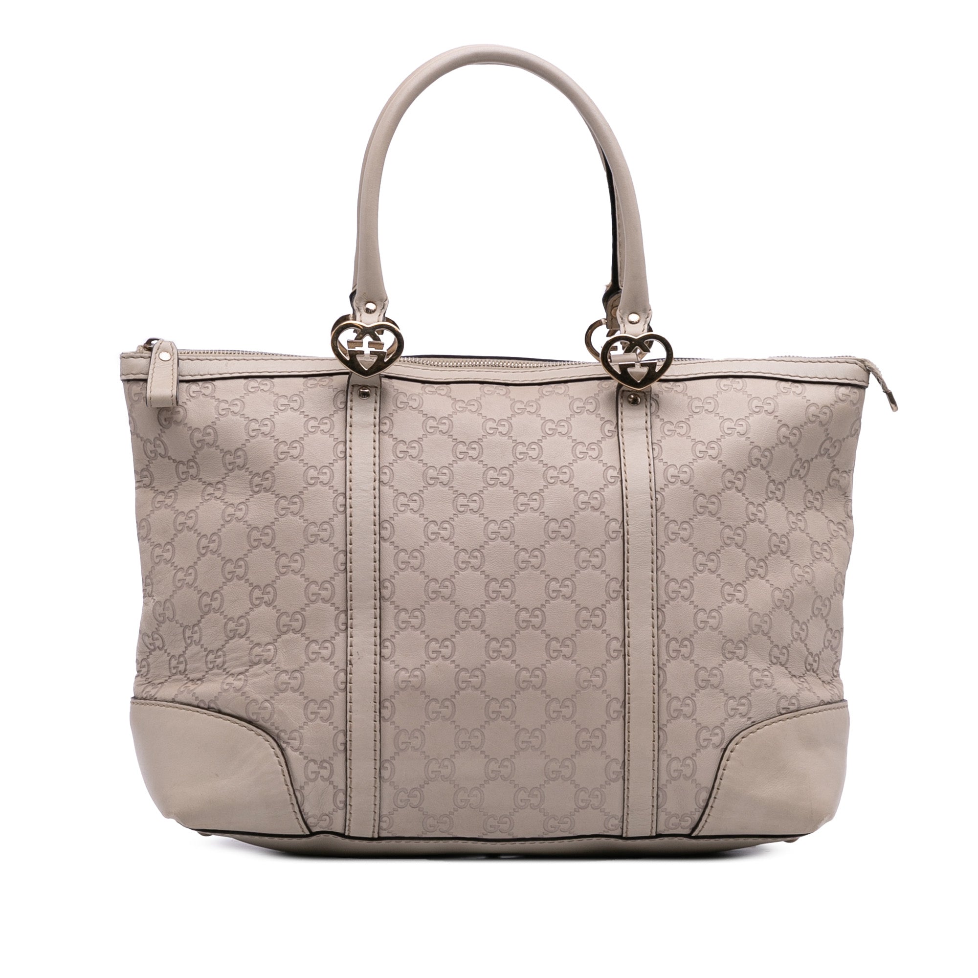 Product Details: Beige Gucci Guccissima Lovely Heart Tote. This tote bag features a leather body, rolled leather top handles, a top zip closure, and interior zip and slip pockets. 11.2" L x 14" W x 6.5" D, 5.9" drop. Serial number 257068 520981.