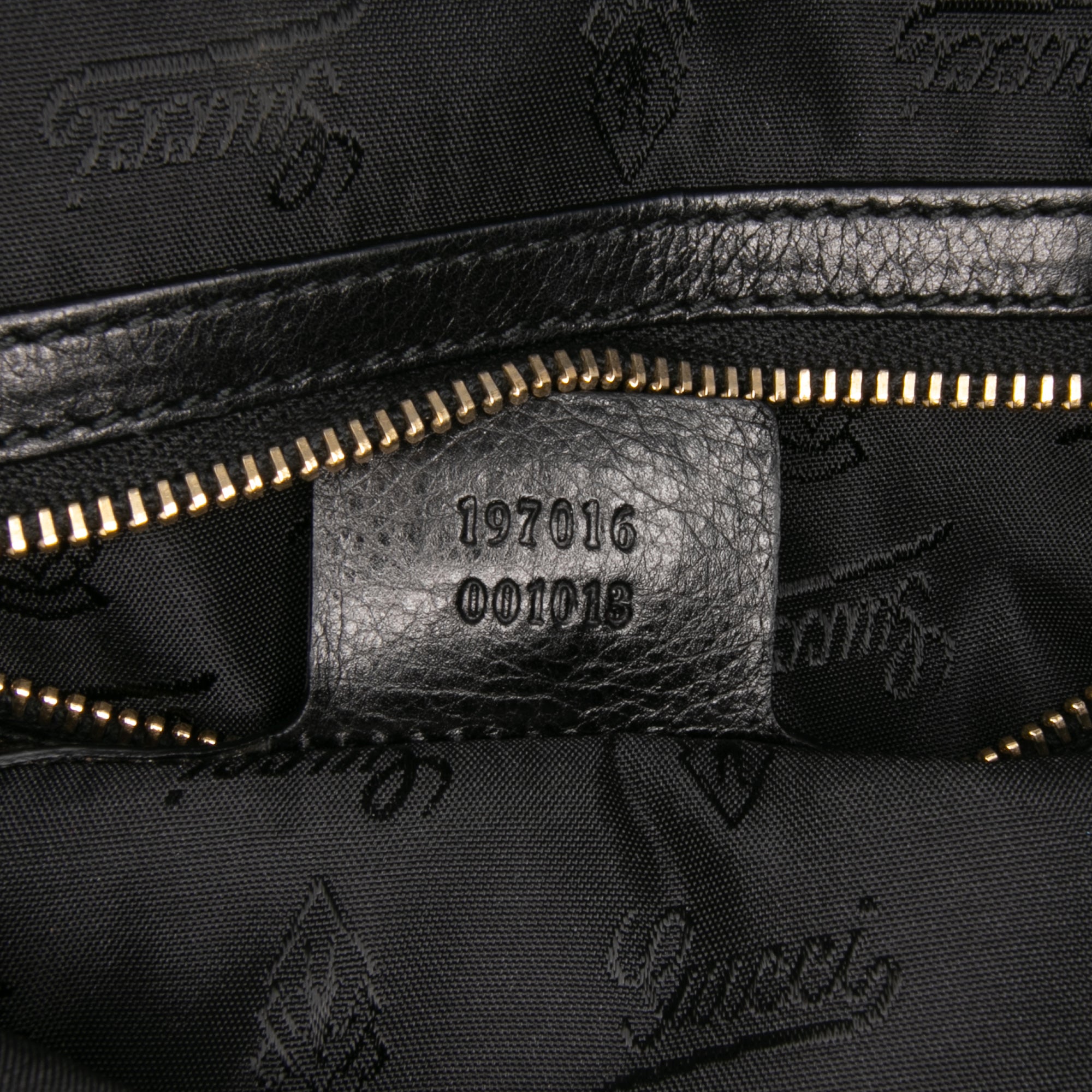 Product Details: Black Gucci Large Patent Hysteria Satchel. The Hysteria features a patent leather body, flat leather handles, a detachable flat leather strap, an open top with magnetic snap closure, and interior zip and slip pockets. 14.8" L x 18.1" W x 0.4" D, 5.1" drop. Serial number 197016 001013.