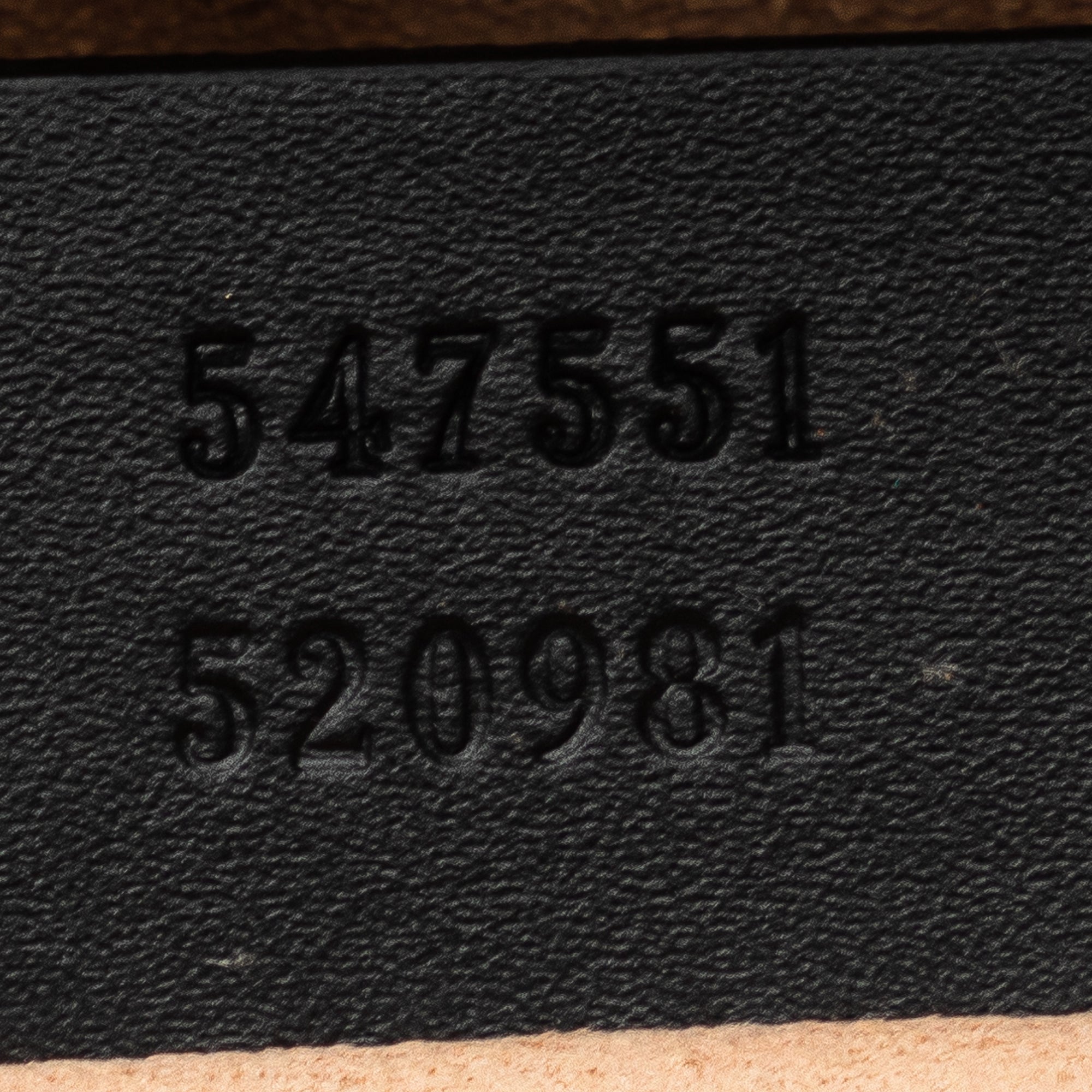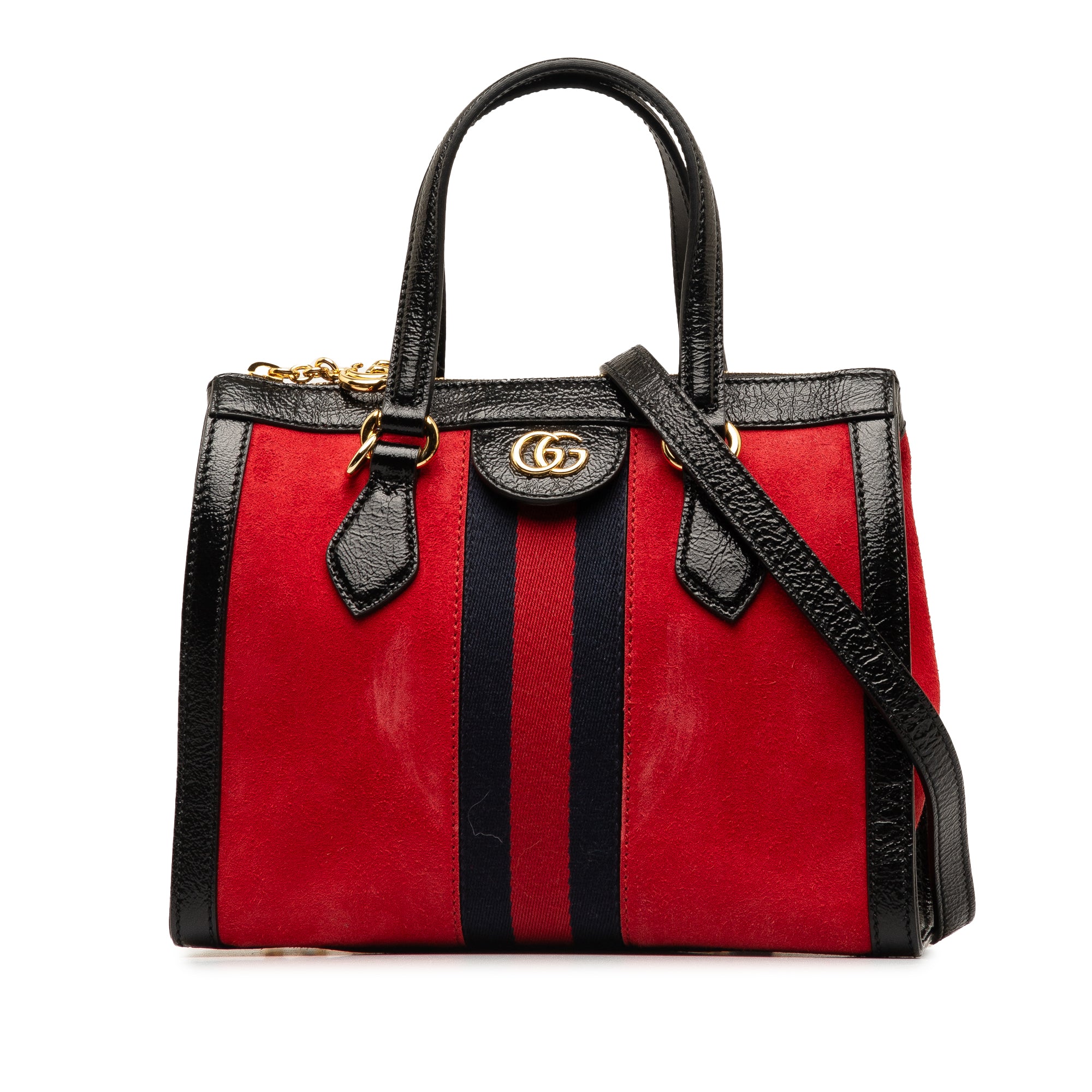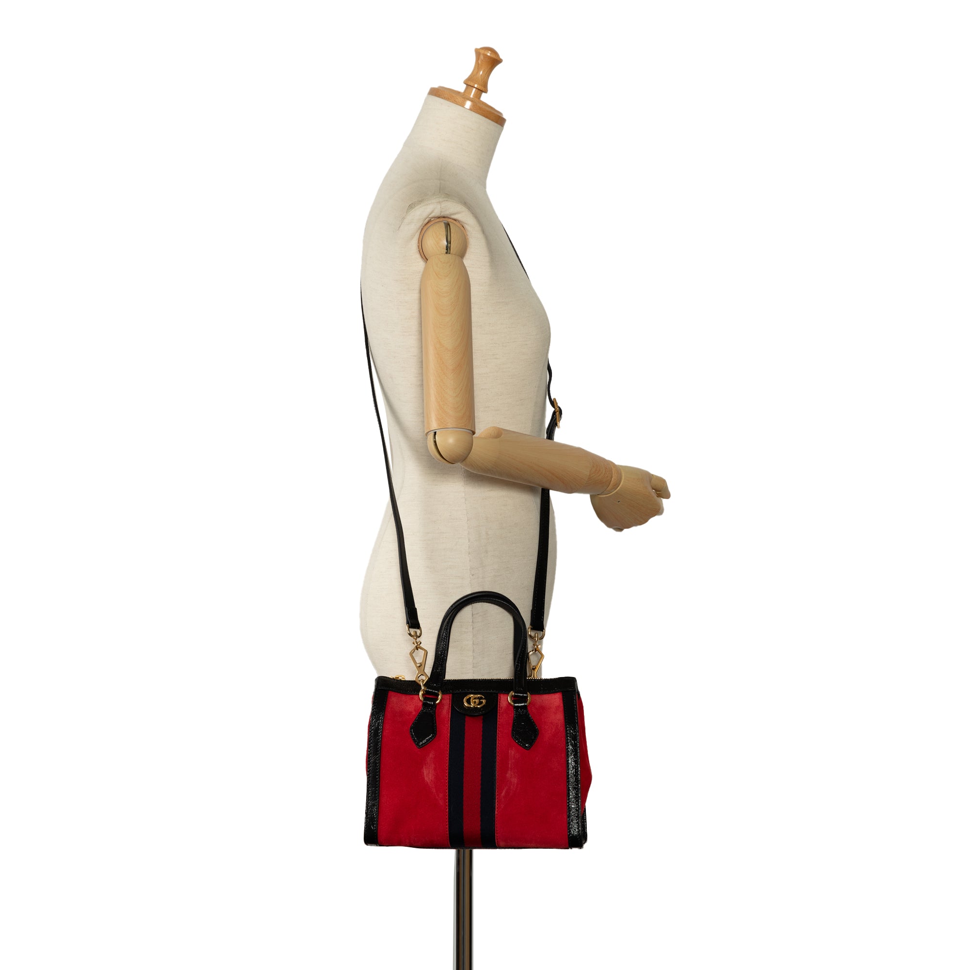 Product Details: Red Gucci Small Suede Ophidia Satchel. The Ophidia Satchel features a suede body with patent leather trim, flat leather handles, a detachable flat leather strap, a top zip closure, and interior slip pockets. 7.5" L x 9.3" W x 3.9" D, 3.7" drop. Serial number 547551 520981.