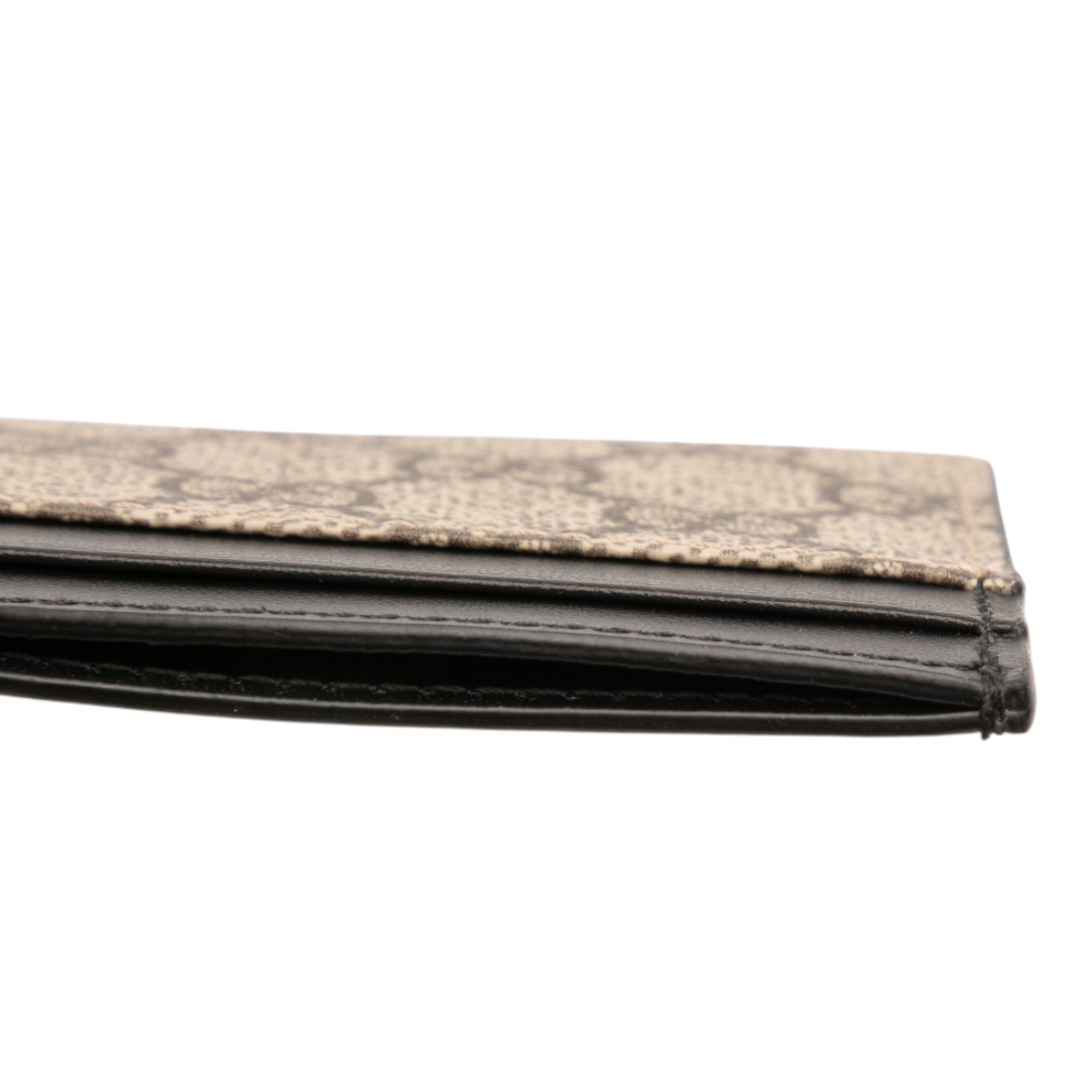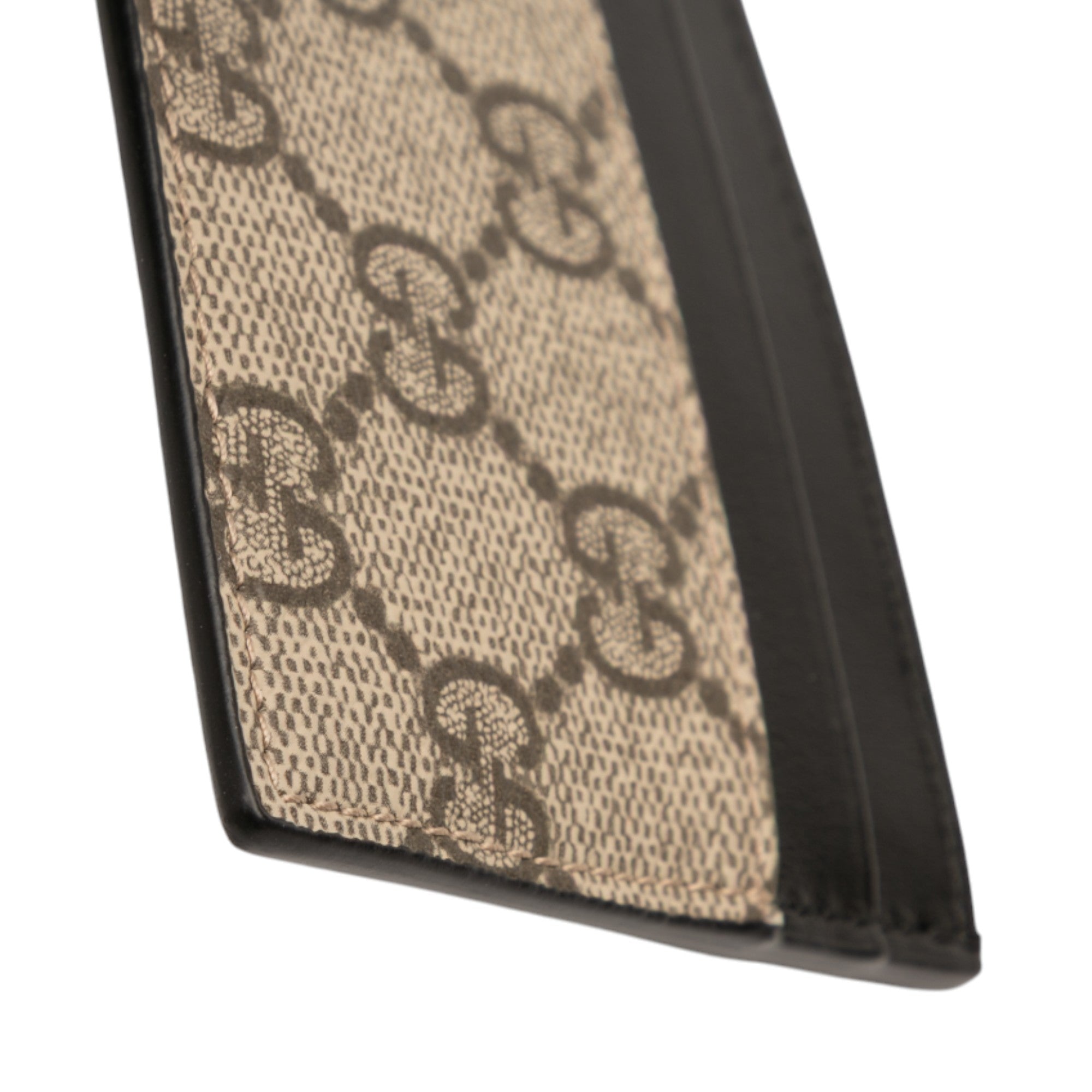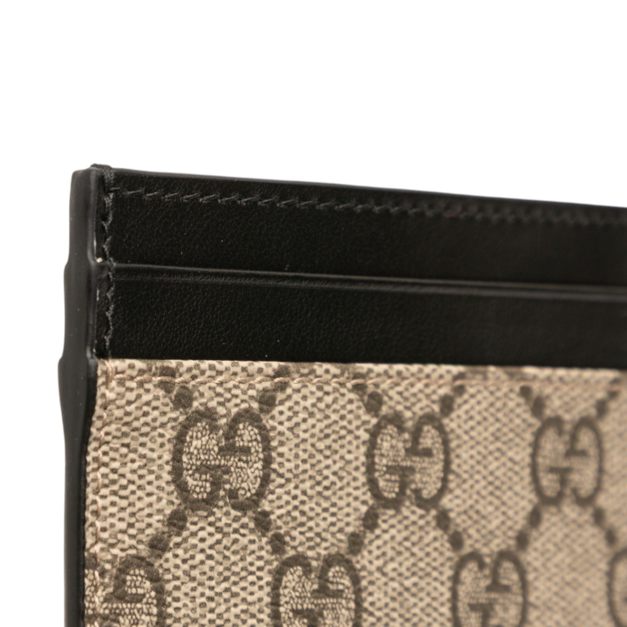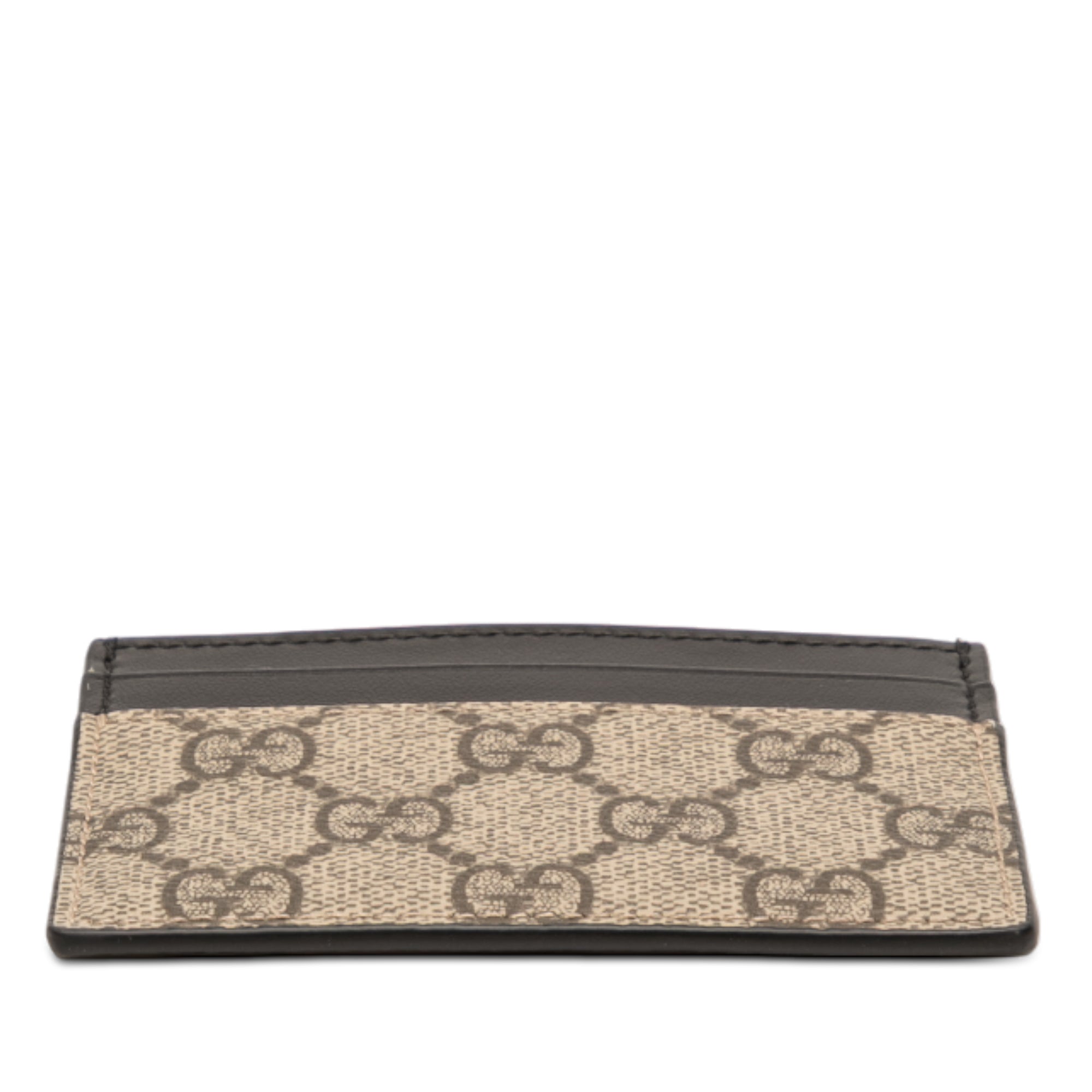Product Details: Brown Gucci GG Supreme Card Holder. This card holder features a coated canvas body with leather trim, and card slots.. 2.8" L x 3.9" W x 0.1" D. Serial number 233166 493075.