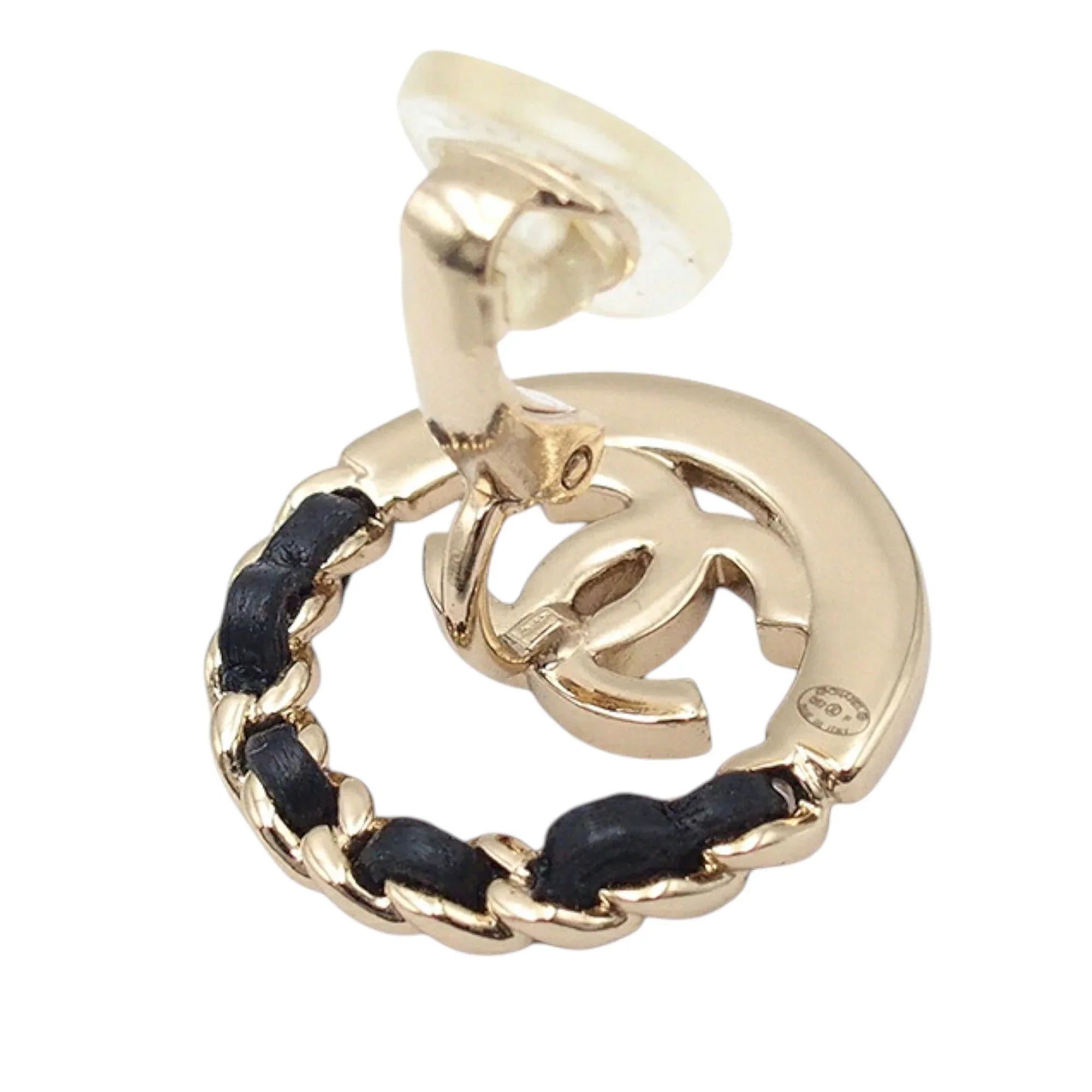 Product Details: Gold Chanel Gold Plated Leather Woven CC Round Clip on Earrings. These earrings feature a gold-plated body with leather-woven details, and clip on closure. 0.8" L x 0.8" W x 0" D. Serial number B22P.