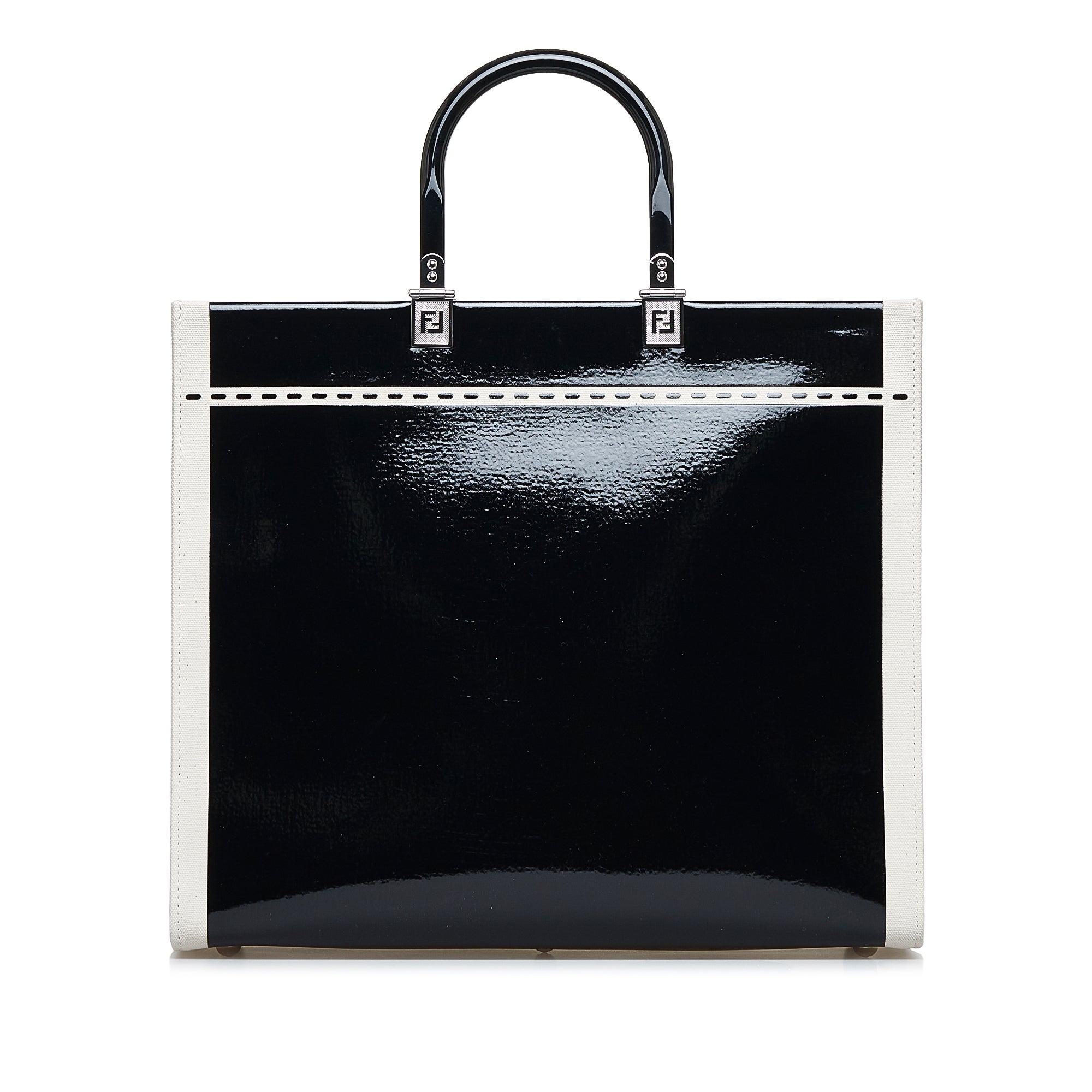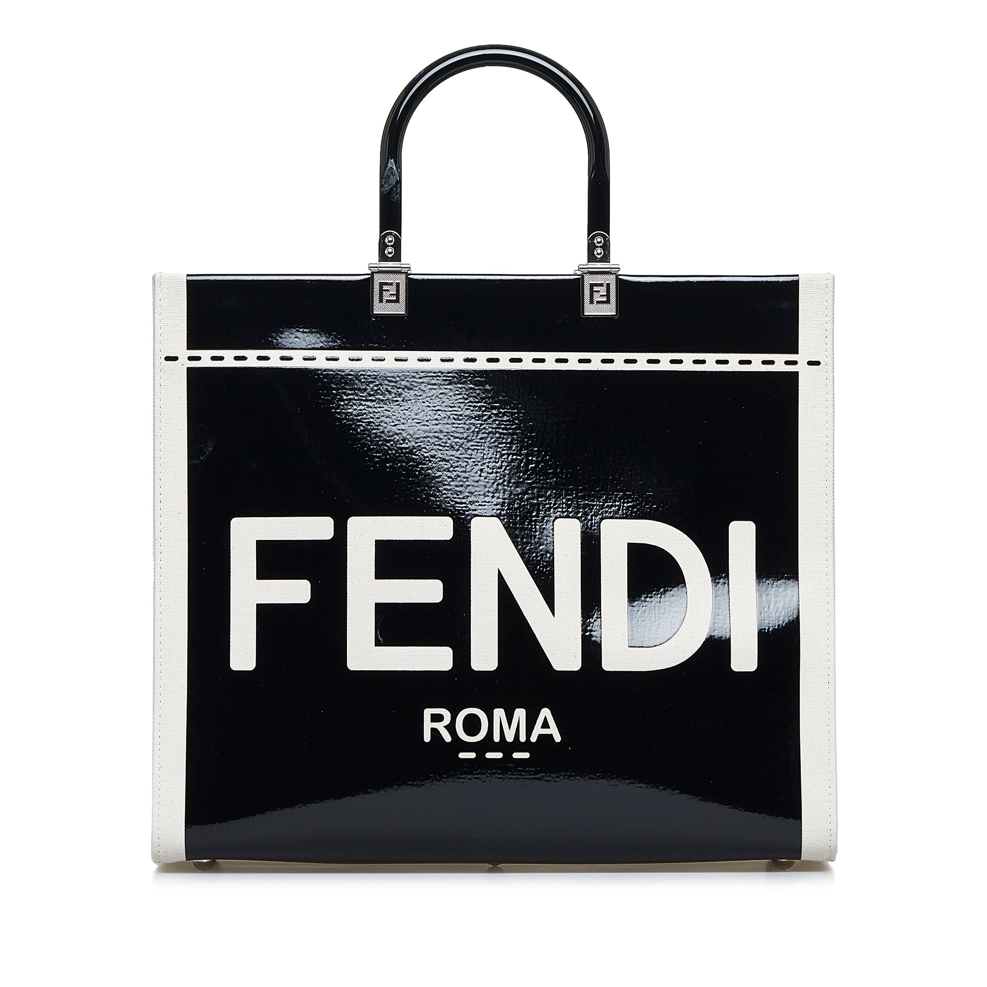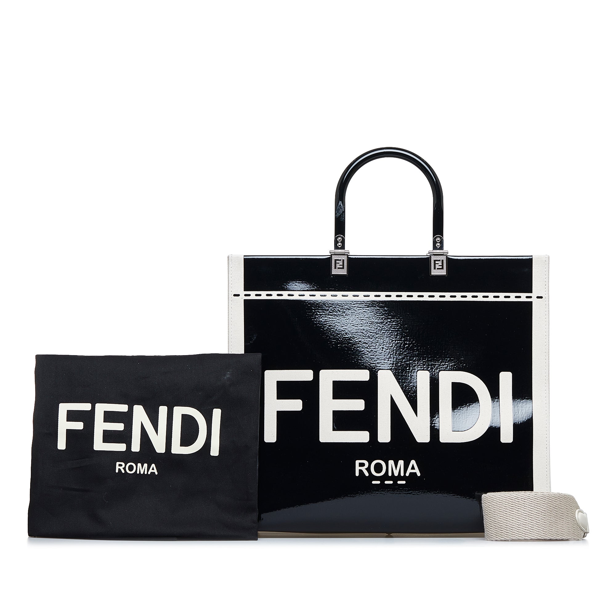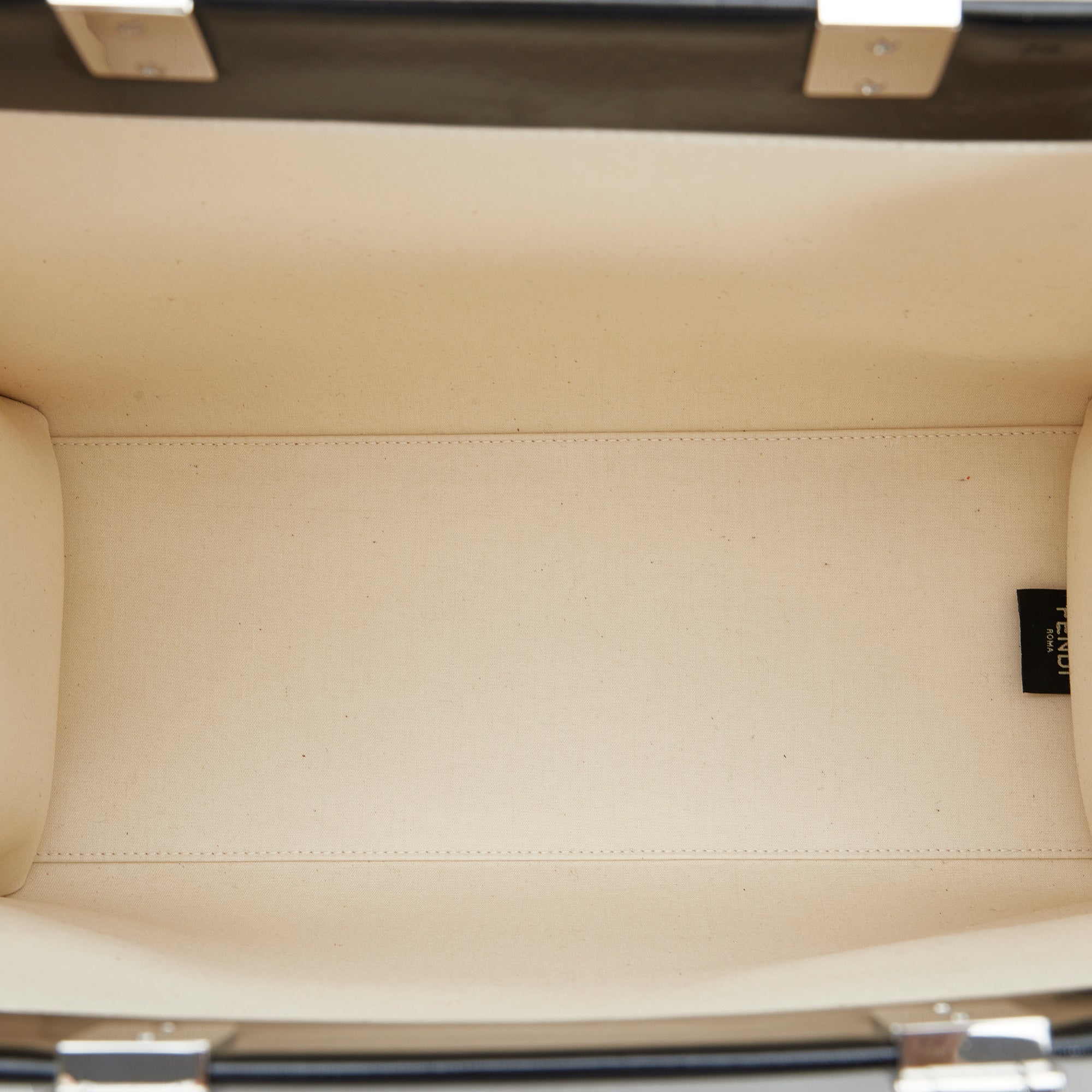 Product Details: Black Fendi Medium Sunshine Shopper Tote Satchel. The Sunshine Shopper satchel features canvas body with leather trim, flat leather handles, a detachable flat strap, and an open top. 11.8" L x 14" W x 5.9" D, 4.3" drop.