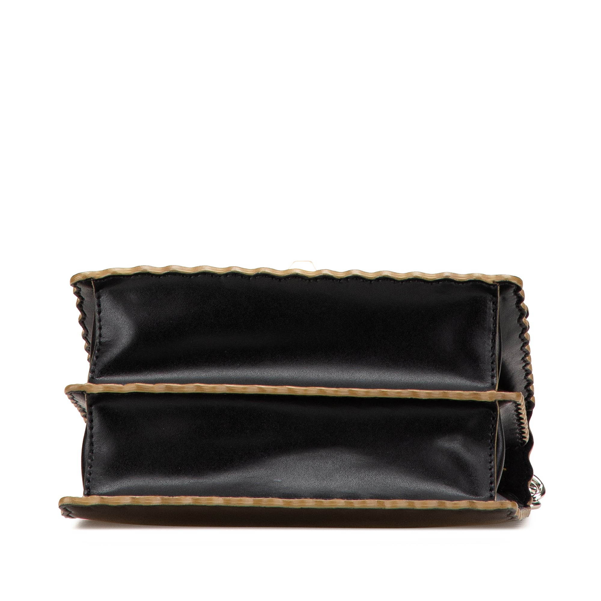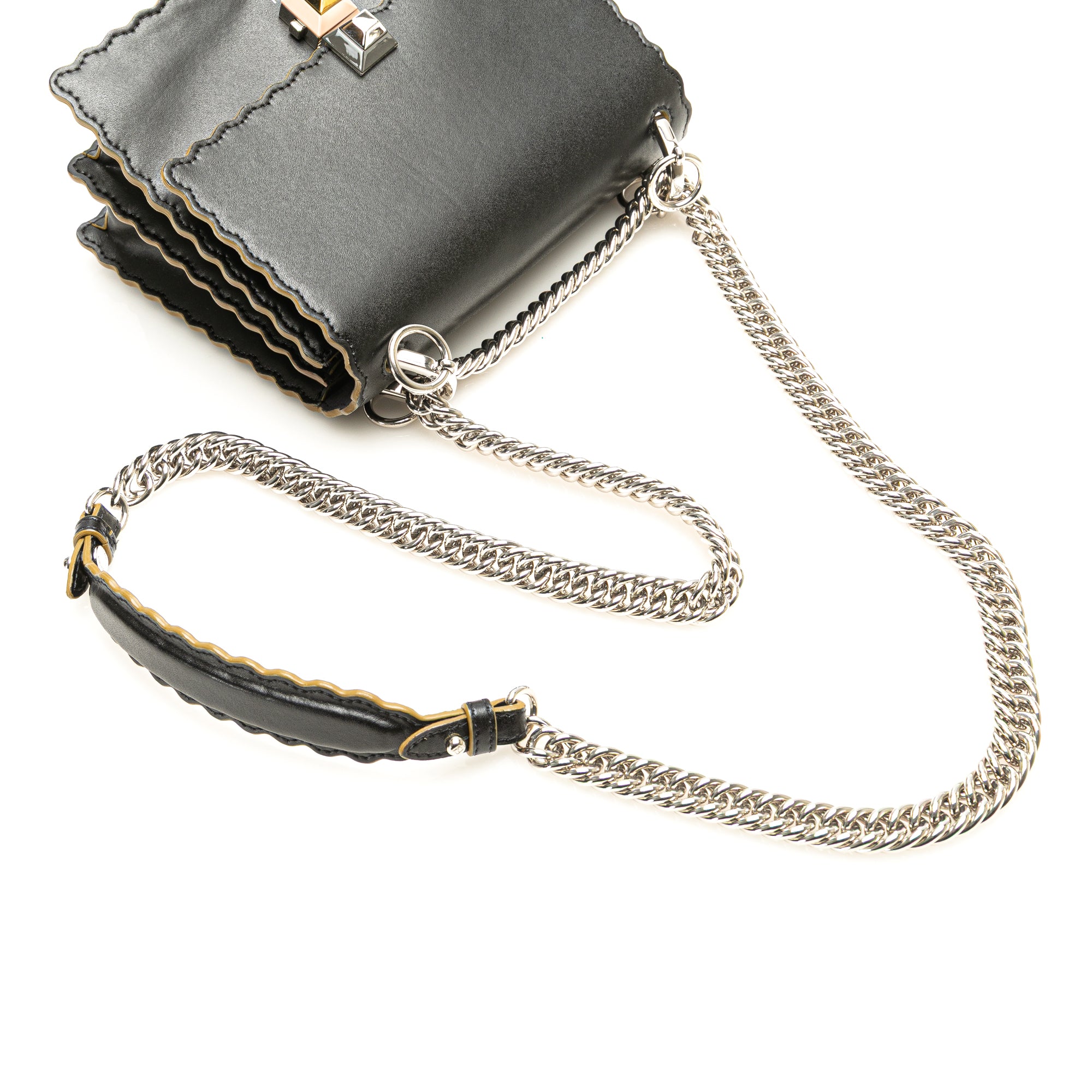 Product Details: Black Fendi Small Leather Kan I Crossbody. The Kan I features a leather body, a chain link shoulder strap with leather shoulder guard, a front flap with a push lock closure, and an interior slip pocket. 6.1" L x 7.5" W x 3.9" D, 10" drop. Serial number 8M0381 OZC 178 0397.