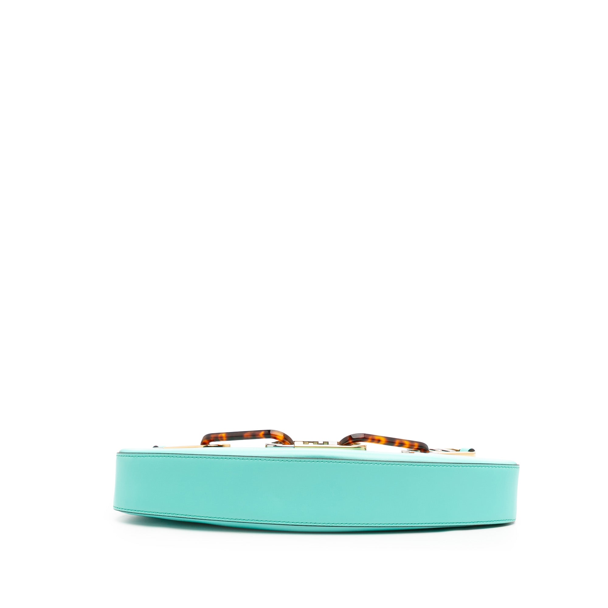 Product Details: Blue Fendi Leather OLock Swing Satchel. This satchel features a leather body, a metal and resin chain link handle, a detachable flat leather strap, and a top zip closure. 4.3" L x 12.4" W x 2.2" D, 6.7" drop. Serial number 8BS068 AHM0 229 0189.