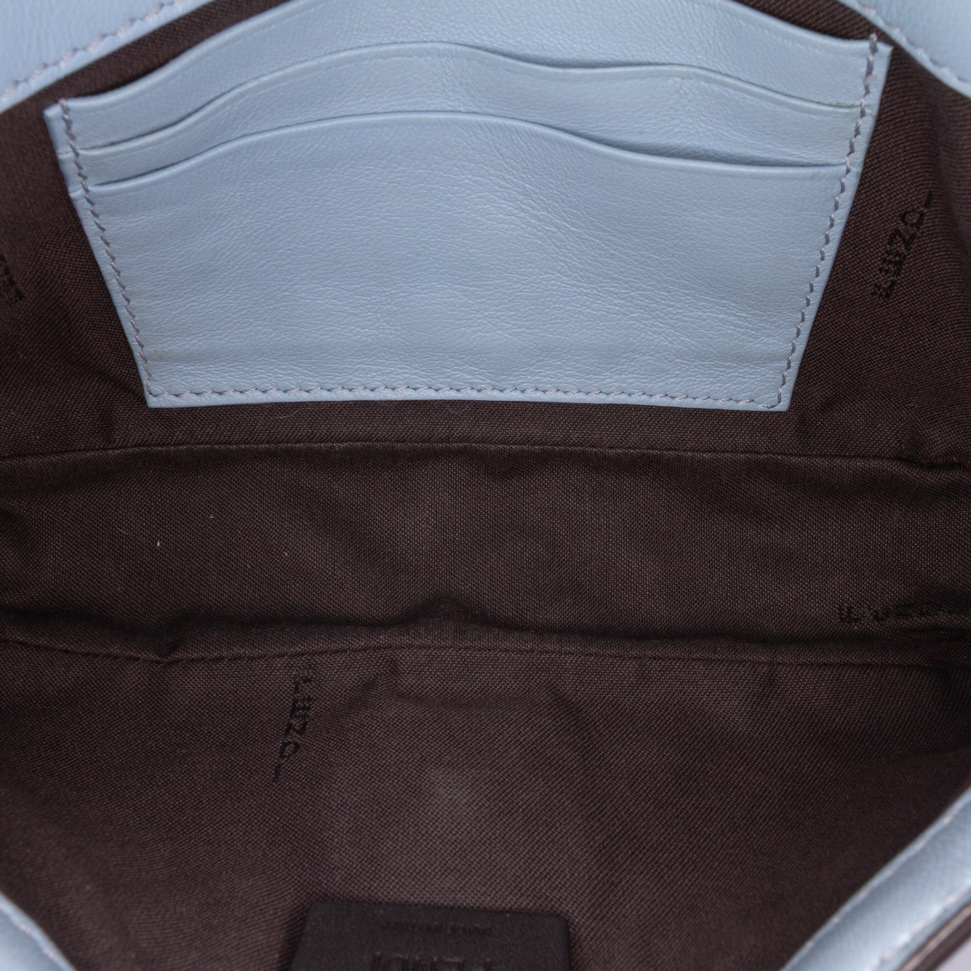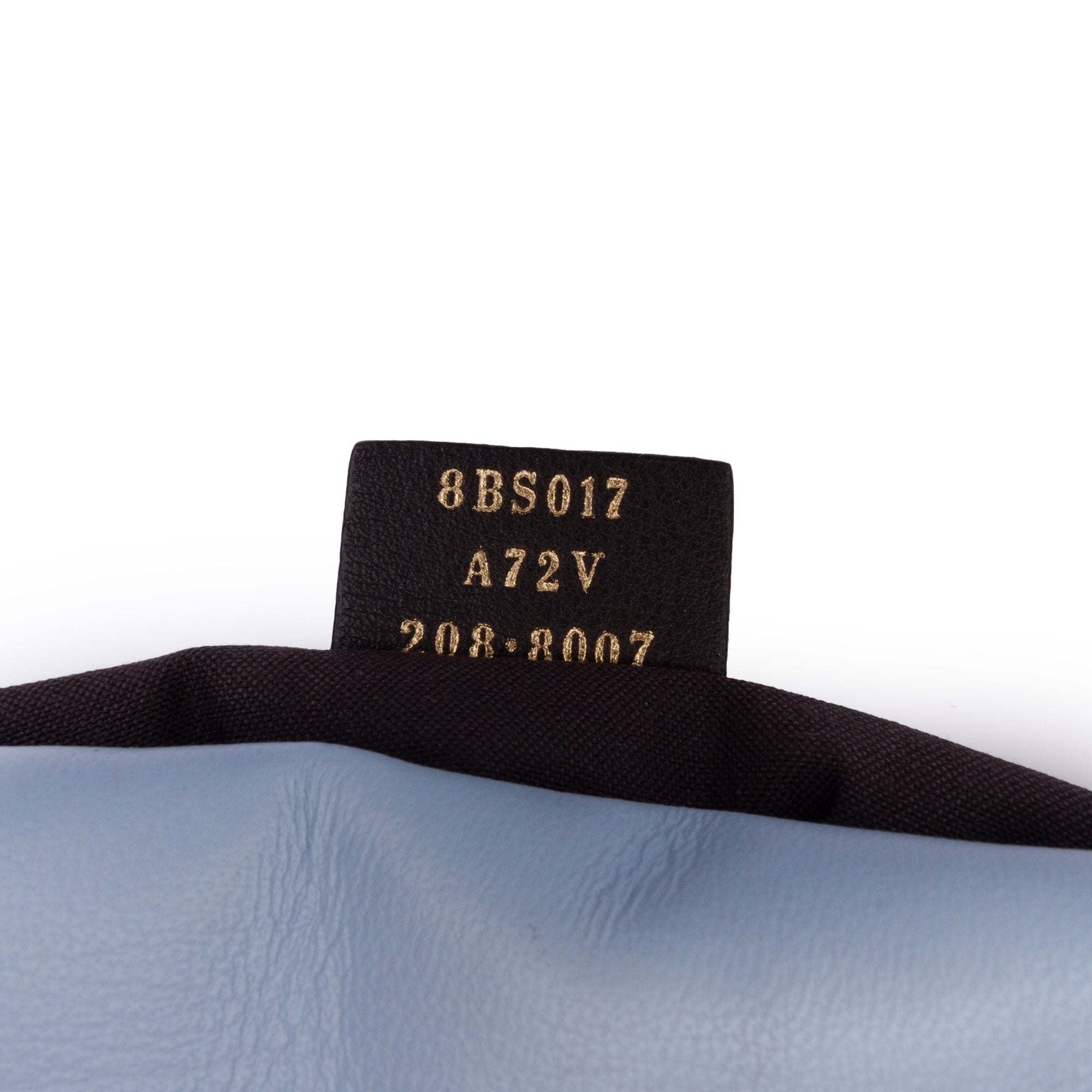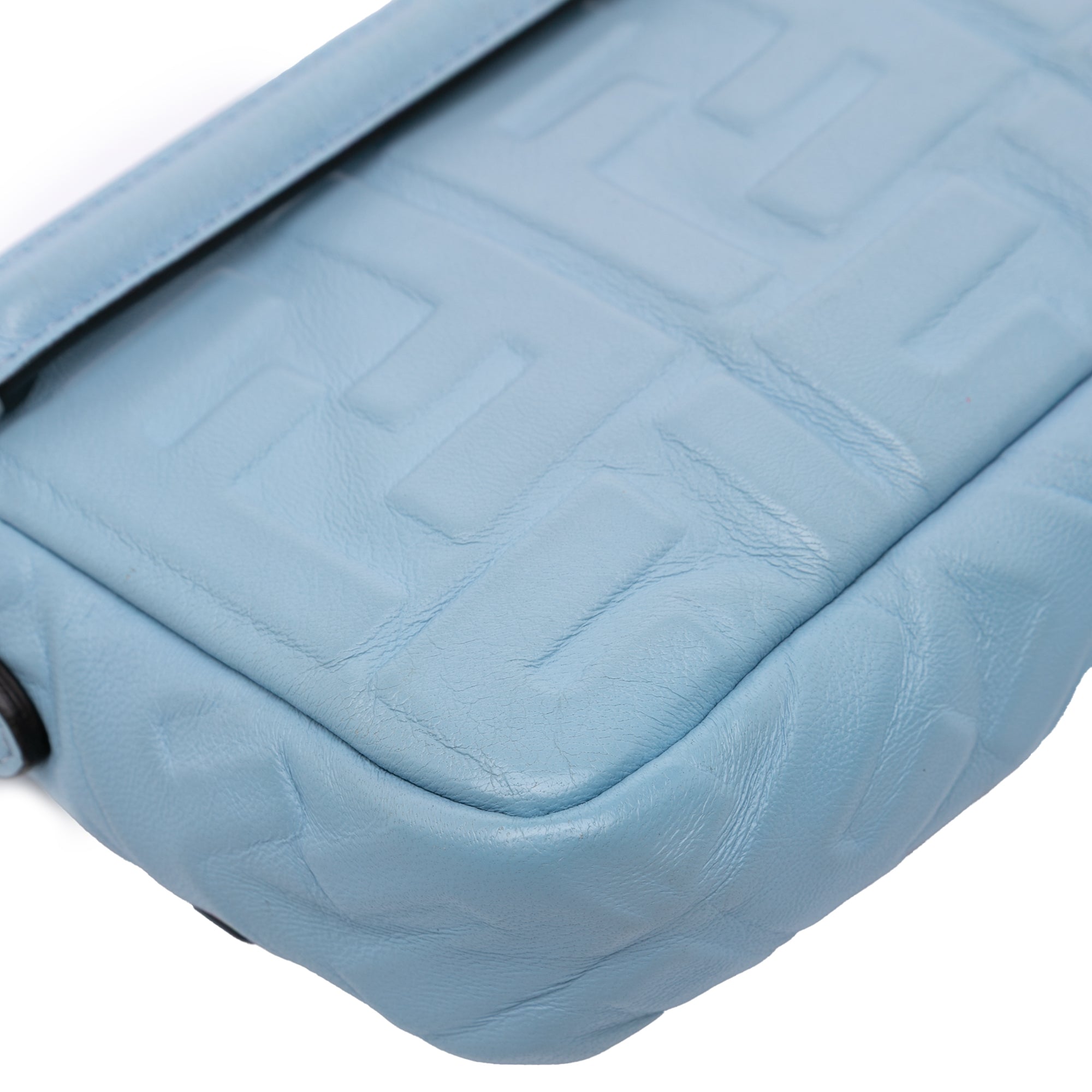 Product Details: Blue Fendi Mini Zucca Embossed Leather Baguette Satchel. This Baguette features an embossed leather body, a detachable flat leather handle, a detachable chain link and leather shoulder strap, a front flap with magnetic snap closure, and interior slip pockets. 5.1" L x 7.1" W x 1.6" D, 2" drop. Serial number 8BS017 A72V 208 8007.