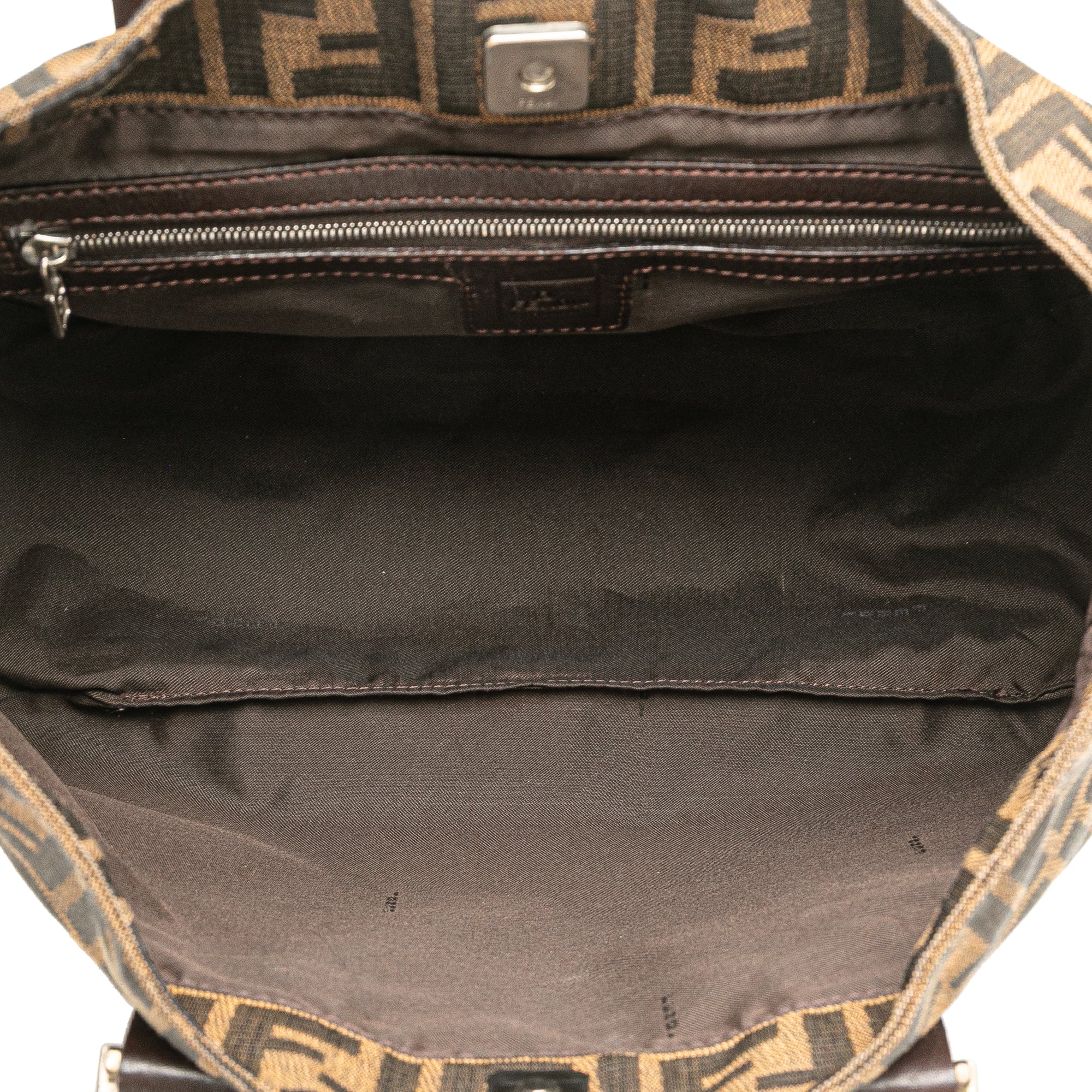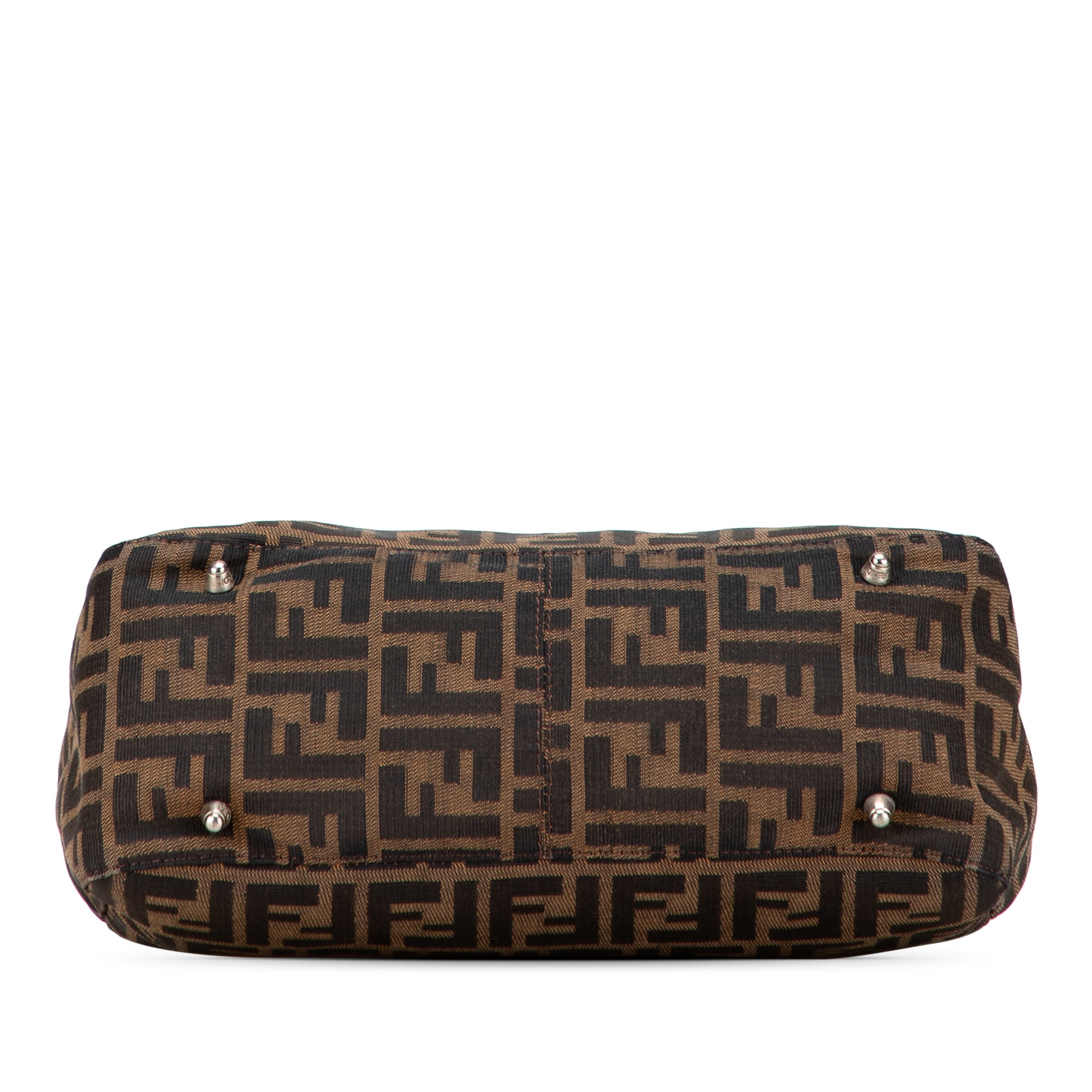 Product Details: Brown Fendi Small Zucca Canvas Twins Tote. This tote features a canvas body, flat leather top handles, an open top with magnetic closure, and an interior zip pocket. 8.3" L x 11.4" W x 4.5" D, 3.1" drop.