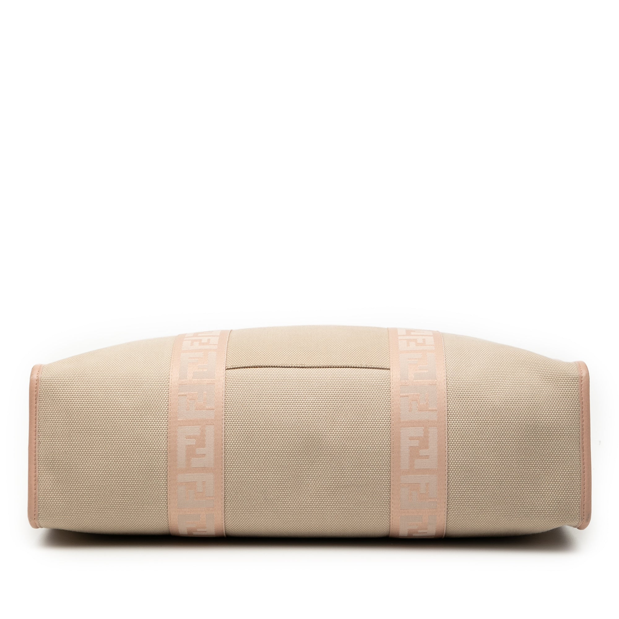Product Details: Tan Fendi Zucca Trimmed Canvas Tote. This tote bag features a canvas body, flat canvas handles, an open top with magnetic snap closure, an exterior front slip pocket, and an interior zip pocket. 11.4" L x 15.7" W x 3.9" D, 7.7" drop. Serial number 2258 8BH165 MZH 068.