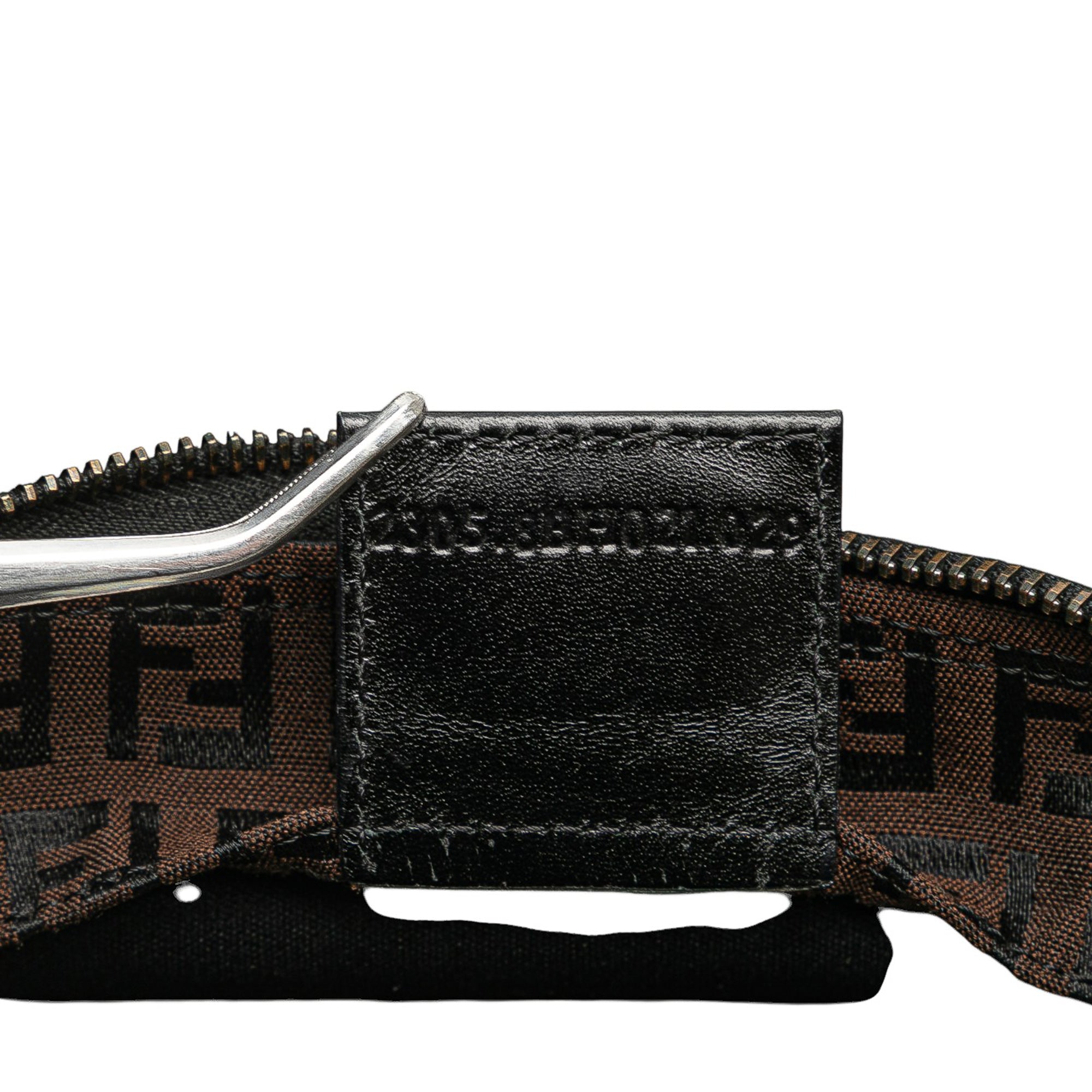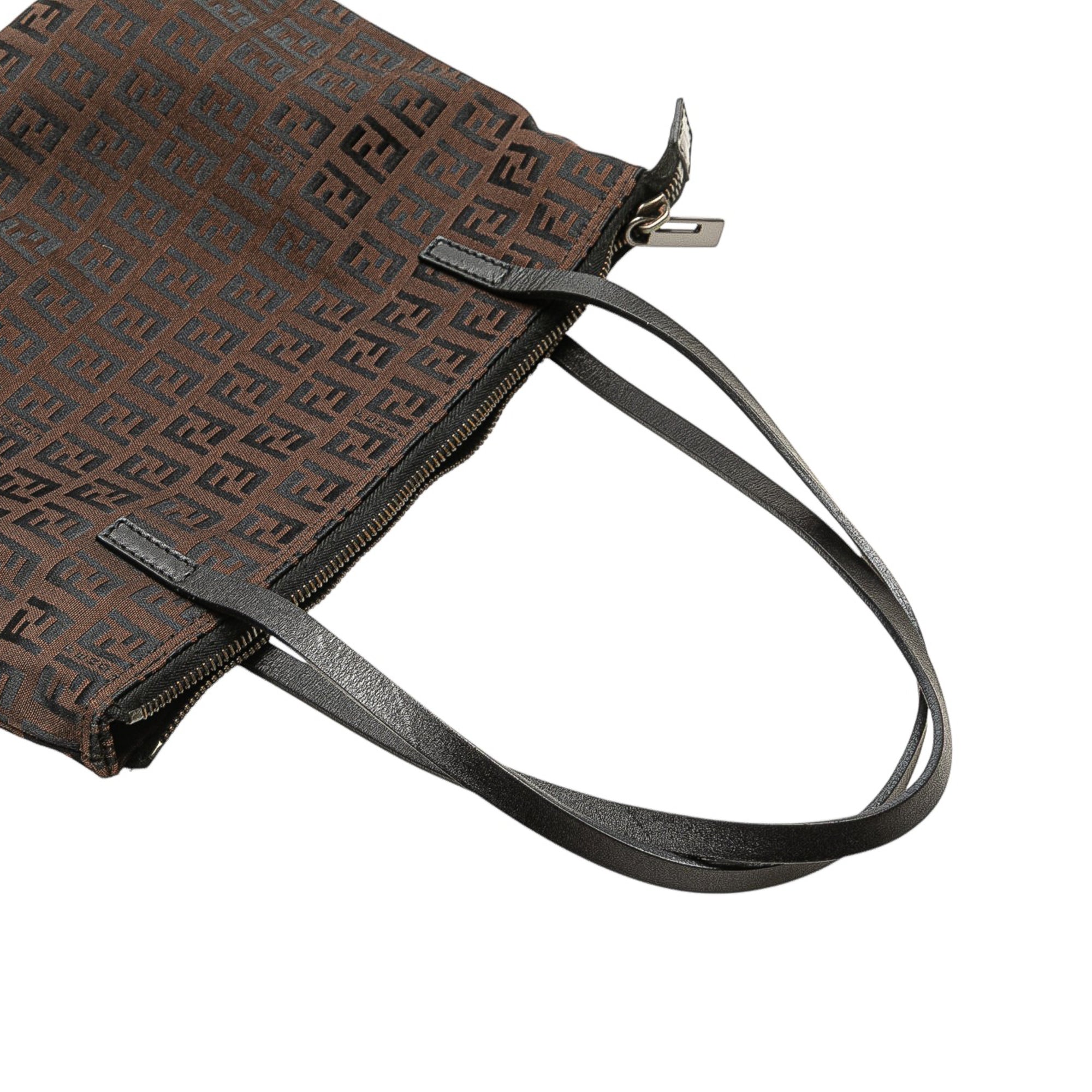 Product Details: Brown Fendi Zucchino Canvas Tote. This tote bag features a canvas body, flat leather shoulder straps, a top zip closure, and an interior zip pocket. 7.5" L x 9.4" W x 2.6" D, 7.5" drop. Serial number 2305 8BH021 029.