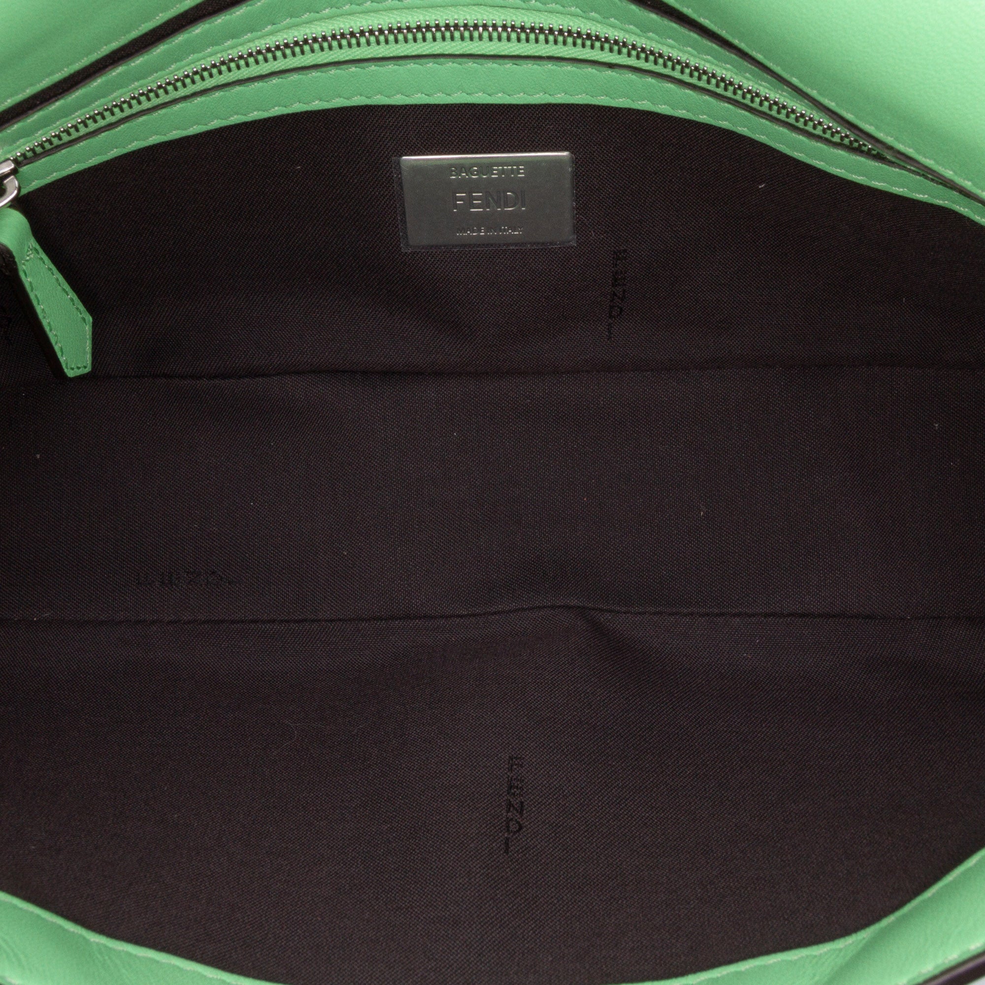 Product Details: Green Fendi Medium Leather Embossed FF Baguette Satchel. This satchel features an embossed leather body, a detachable flat leather handle and shoulder strap, a flap with magnetic snap closure, and an interior zip pocket. 6.7" L x 10.4" W x 2.4" D, 5.5" drop. Serial number 8BR600 ANX4 238 0189.