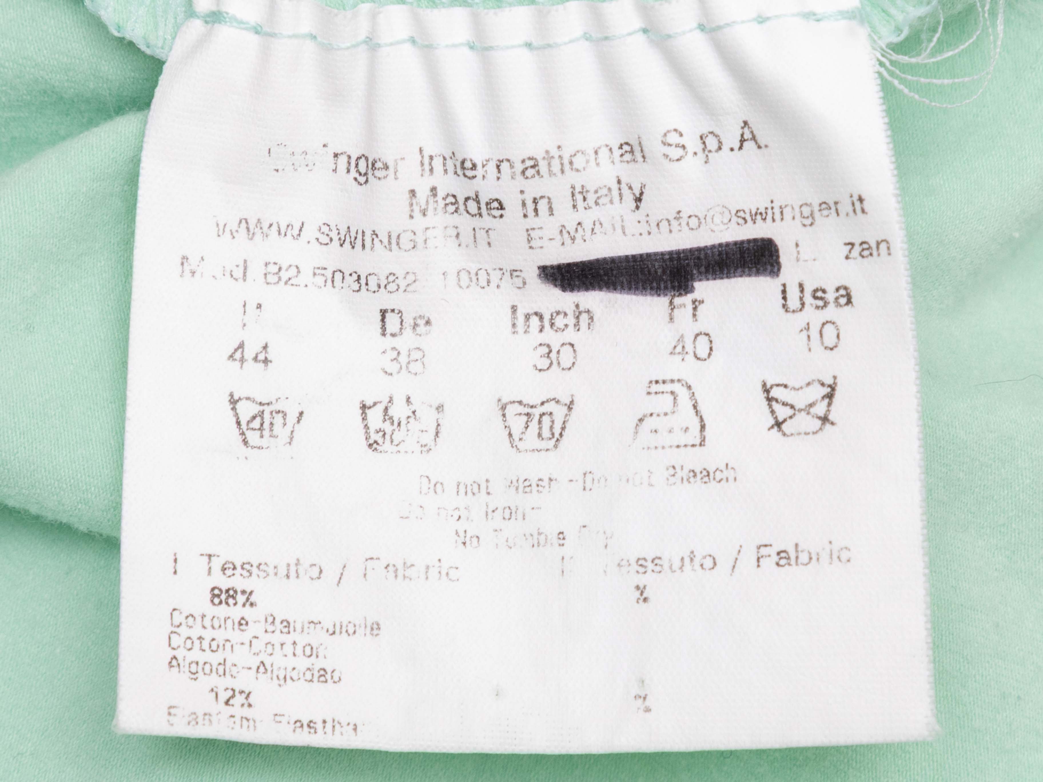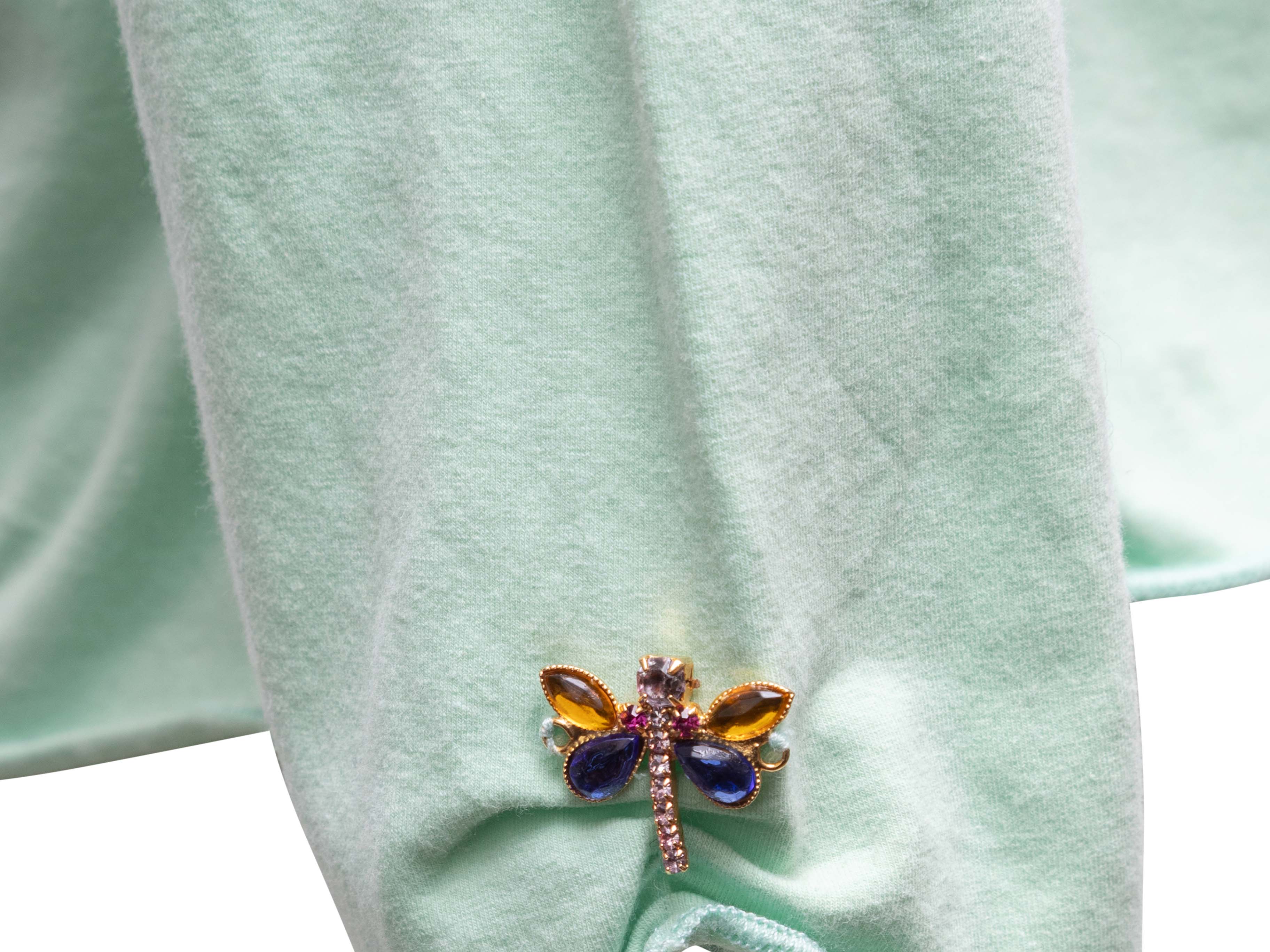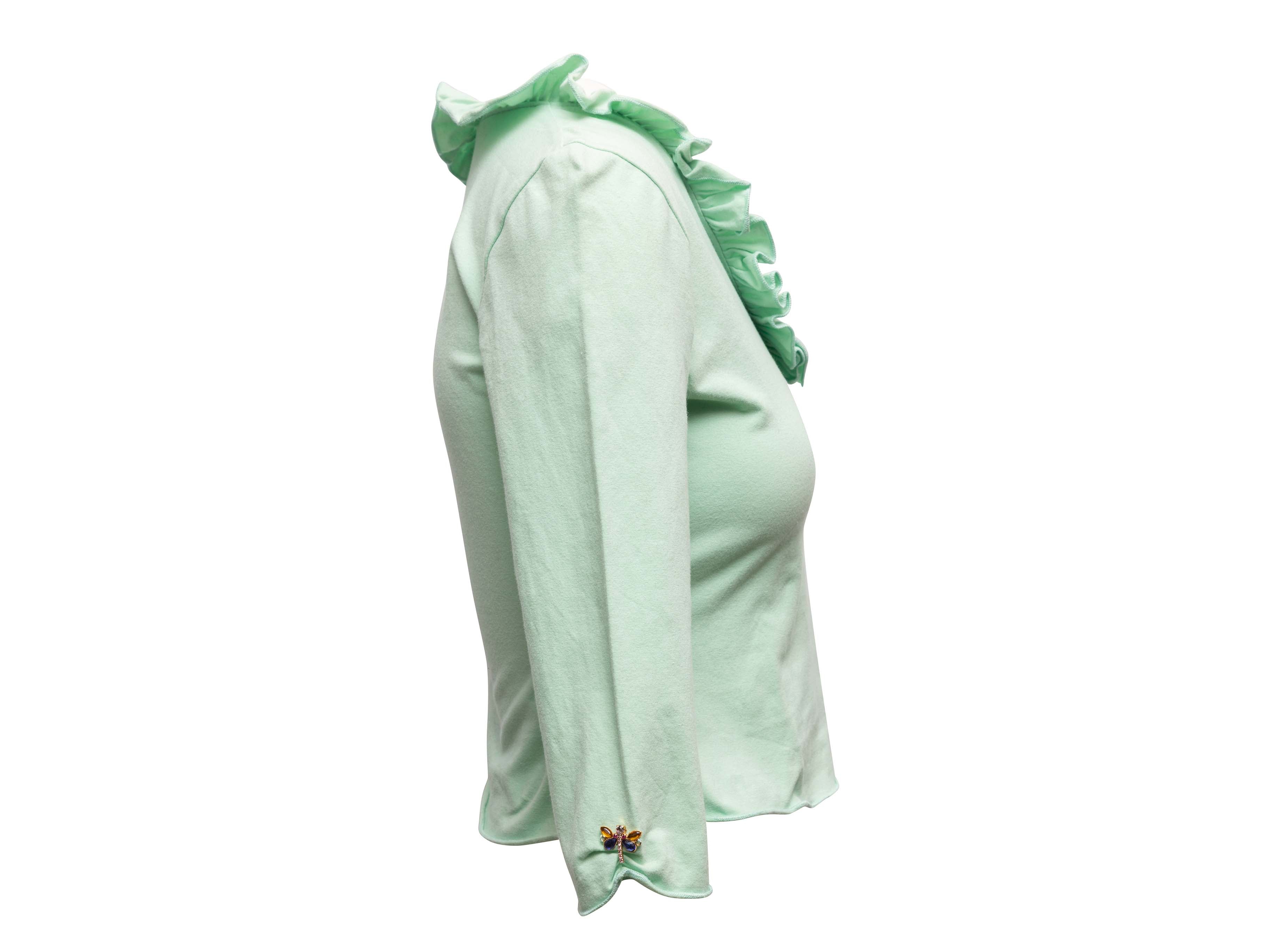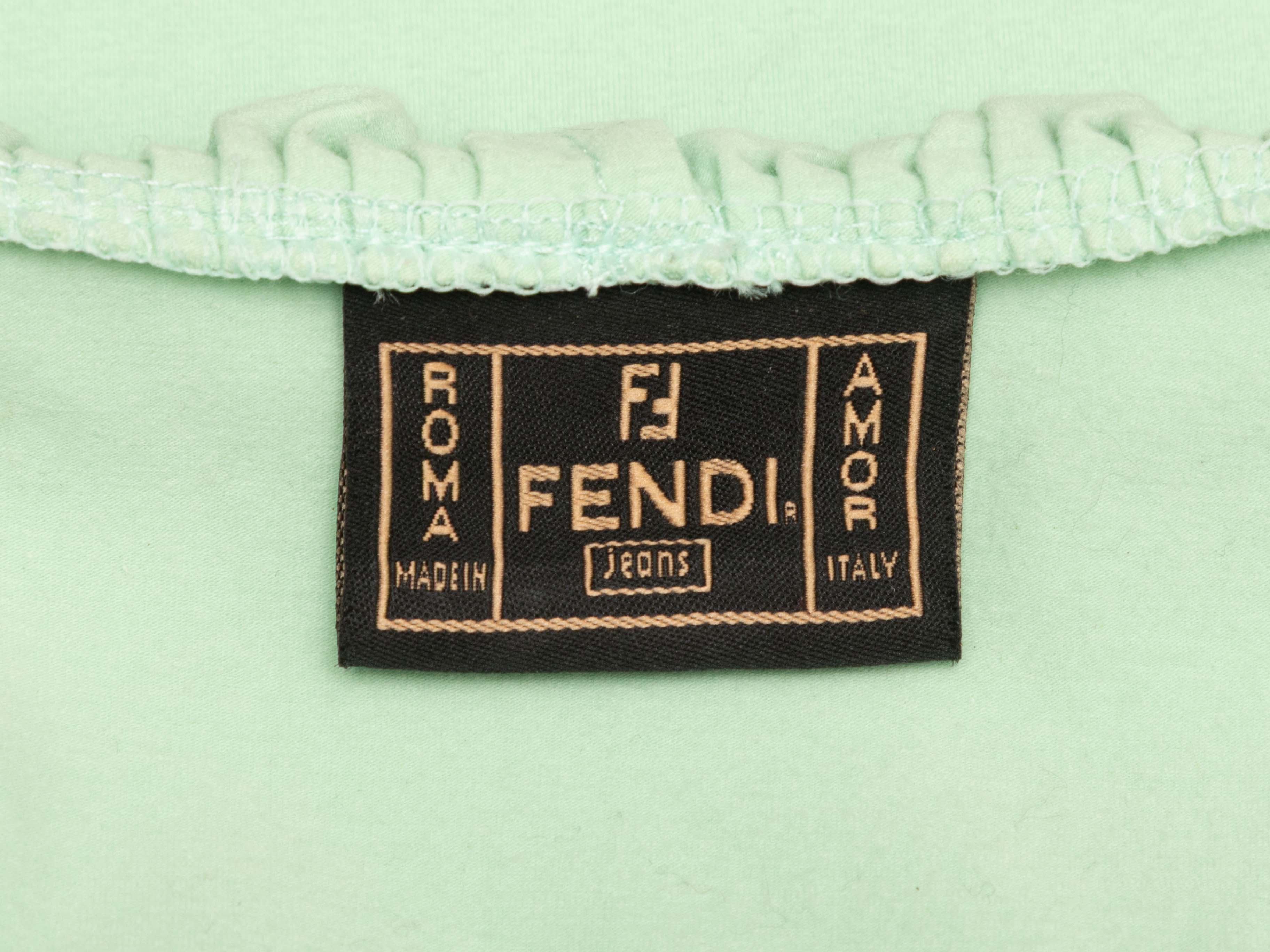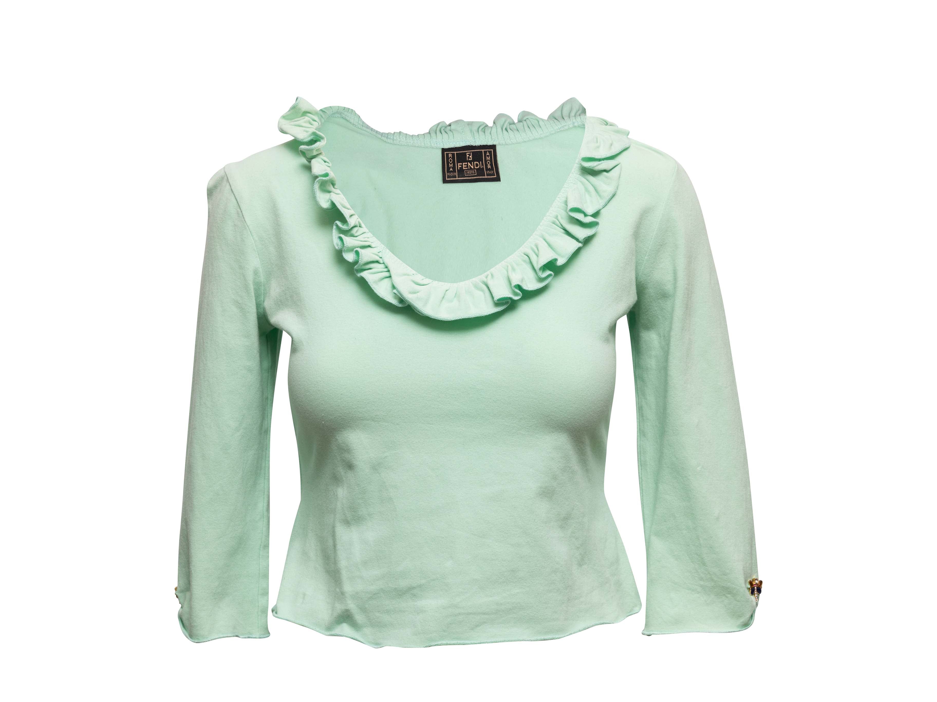 Product Details: Mint cotton three-quarter sleeve cropped sweater by Fendi. Ruffle trim at scoop neckline. Embellished detailing at cuffs. 32" bust, 15.5" shoulder width, 17" length.
