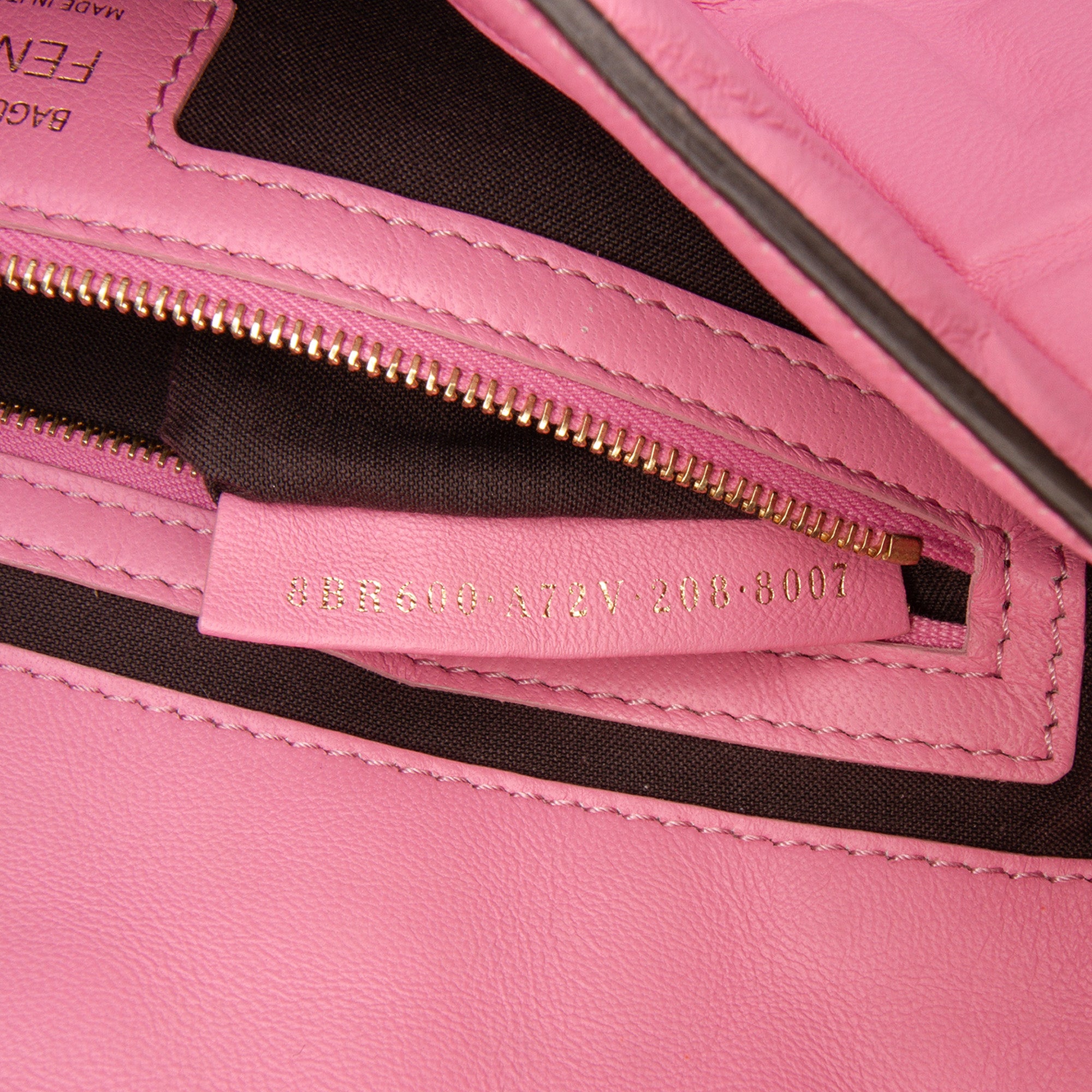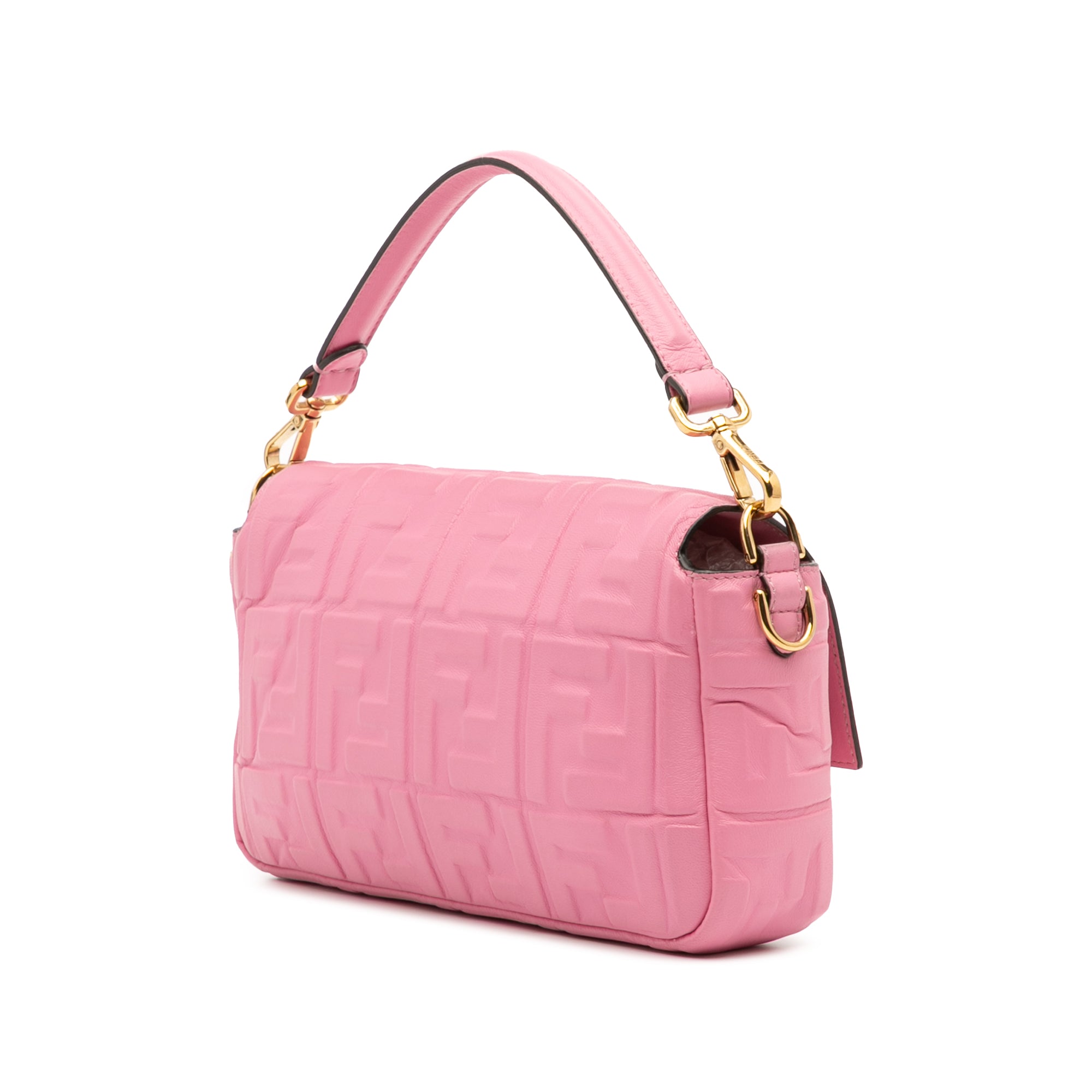 Product Details: Pink Fendi Zucca Embossed Leather Baguette Satchel. This satchel features an embossed leather body, a flat leather handle, a detachable leather strap, a front flap with magnetic snap closure, and an interior zip pocket. 5.9" L x 9.8" W x 2.2" D, 4.3" drop. Serial number 8BR600 A72V 208 8007.