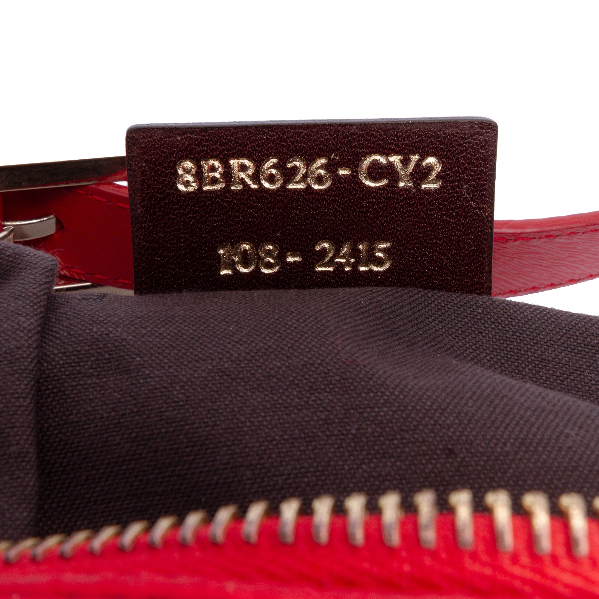 Product Details: Red Fendi Micro Zucchino Nylon Mamma Forever Shoulder Bag. This shoulder bag features a nylon body, a flat leather strap, a top zip closure, and interior slip pockets. 9.3" L x 11.8" W x 5.1" D. Serial number 8BR626 CY2 108 2415.