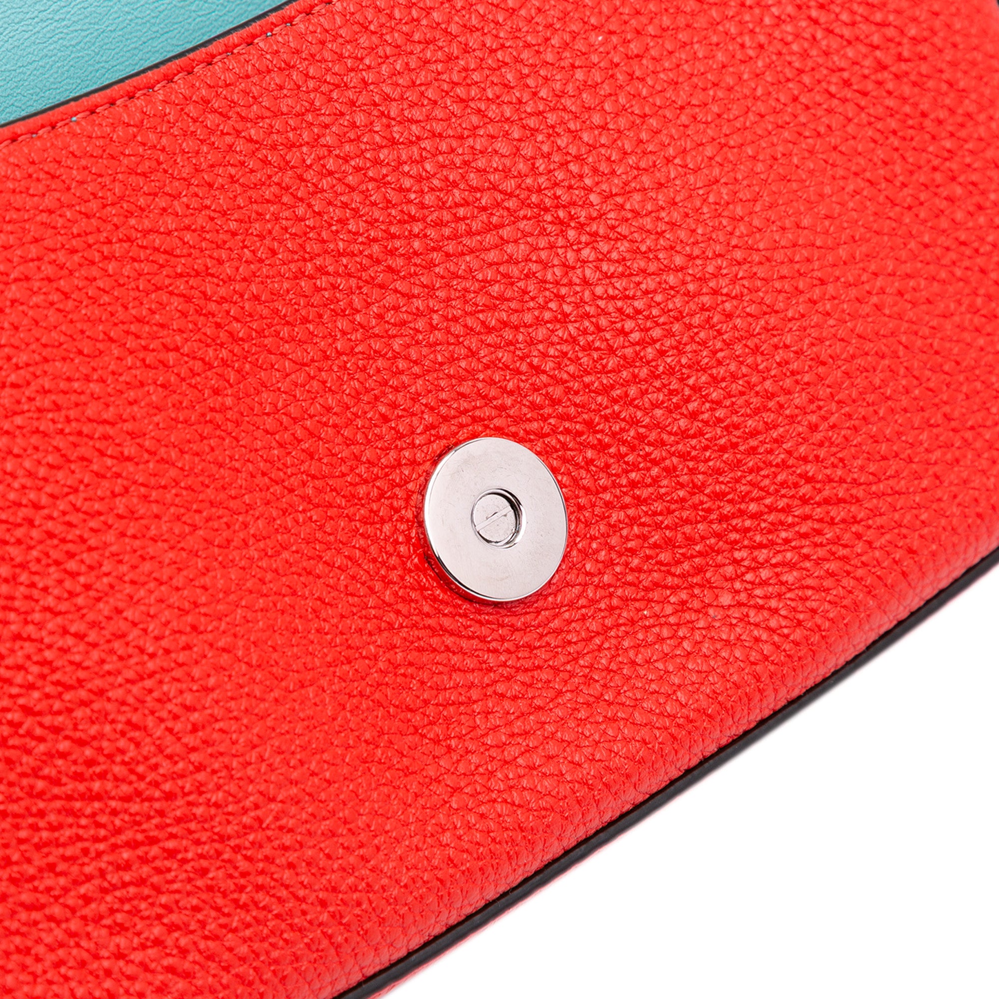 Product Details: Red Fendi Mini Leather Baguette Satchel. The Baguette features a leather body, a detachable flat leather handle, a detachable chain link strap with leather guard, a front flap with magnetic snap closure, and interior slip pockets. 4.9" L x 7.5" W x 2" D, 2.8" drop. Serial number 8BS017 SFR 199 8241.